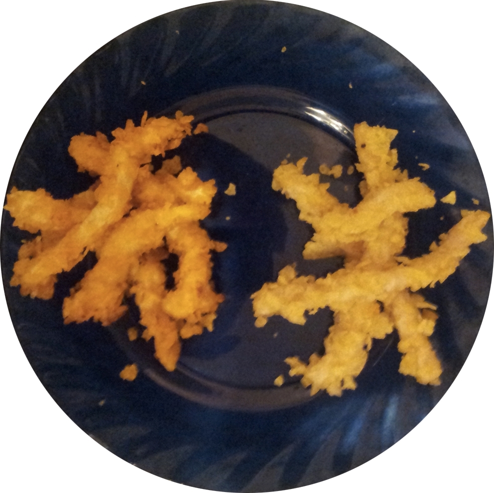 Sbriciolare un paio di manciate di patatine per tipo ed utilizzare il composto per impanare le striscioline di pollo precedentemente tagliate, senza aggiunta di altro.