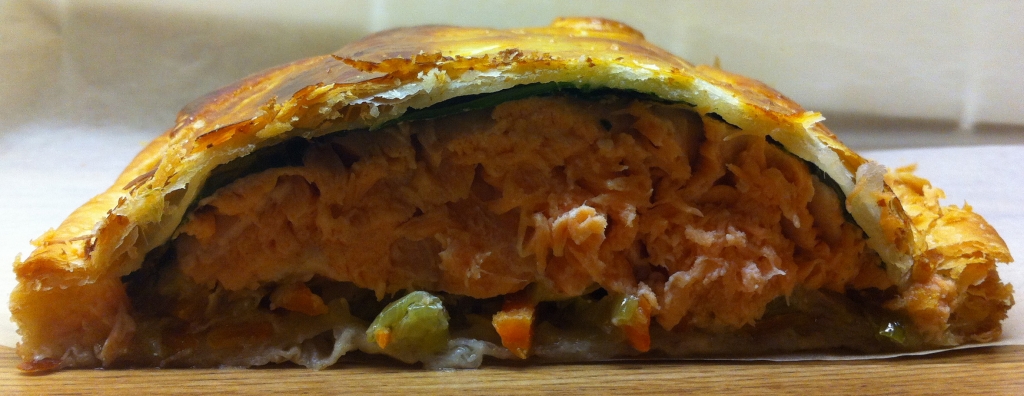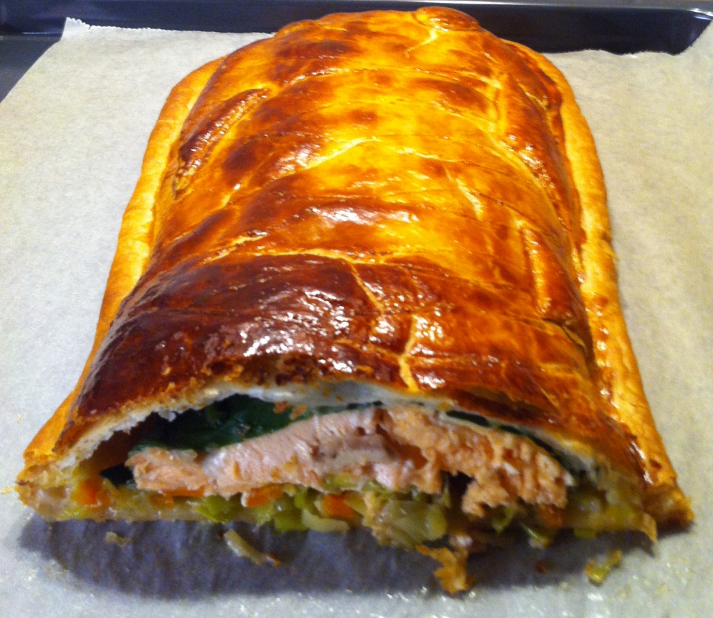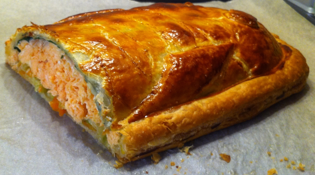 Distender un primo strato di pasta sfoglia (dovete calcolare che il filetto di salmone verrà postato al centro e deve avanzare abbondante pasta sfoglia su tutti i bordi).