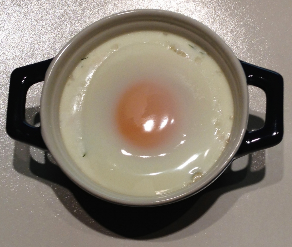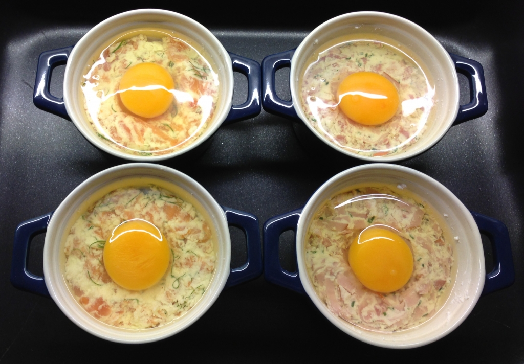 Versare un uovo in ogni cocotte, facendo attenzione a non rompere il tuorlo.