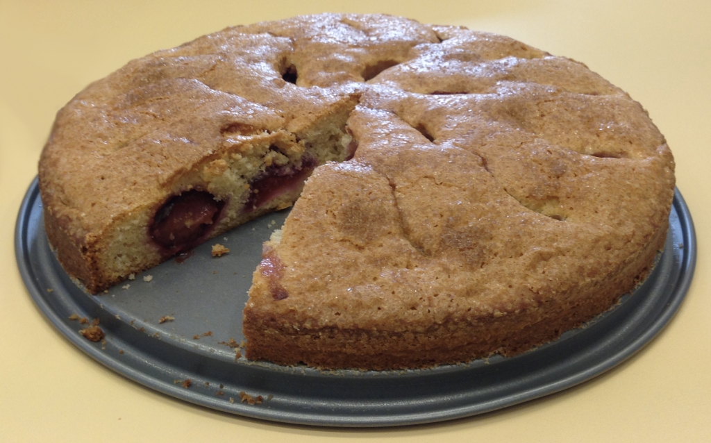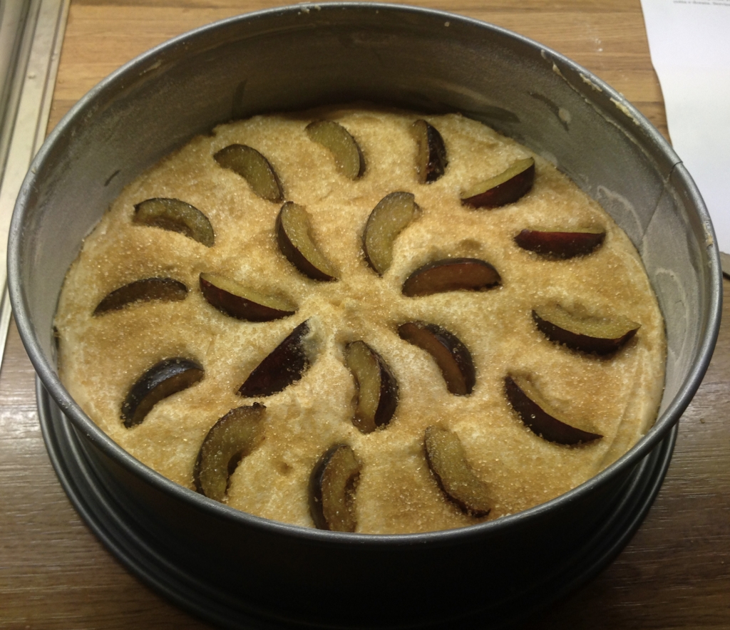 Le prugne vanno disposte uniformemente su tutta la superficie applicando un po’ di pressione quando le si posiziona in modo che siano un po’ immerse nell’impasto.