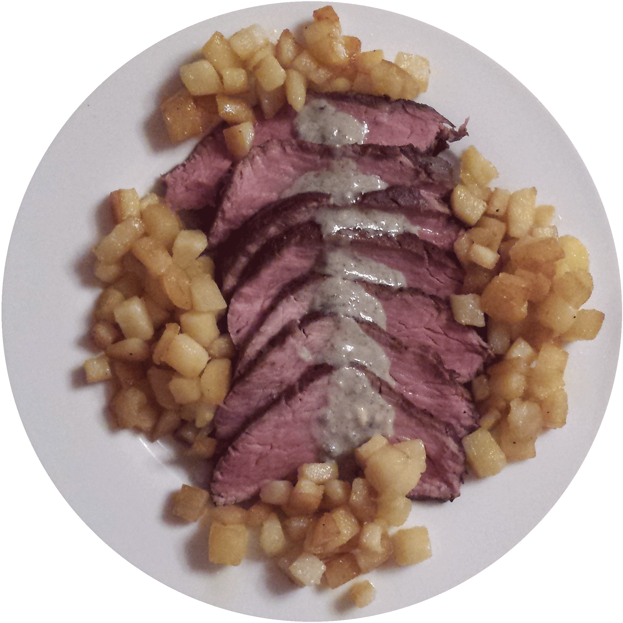 Su un piatto di portata create un letto con metà della salsa preparata e adagiate le fette di filetto.