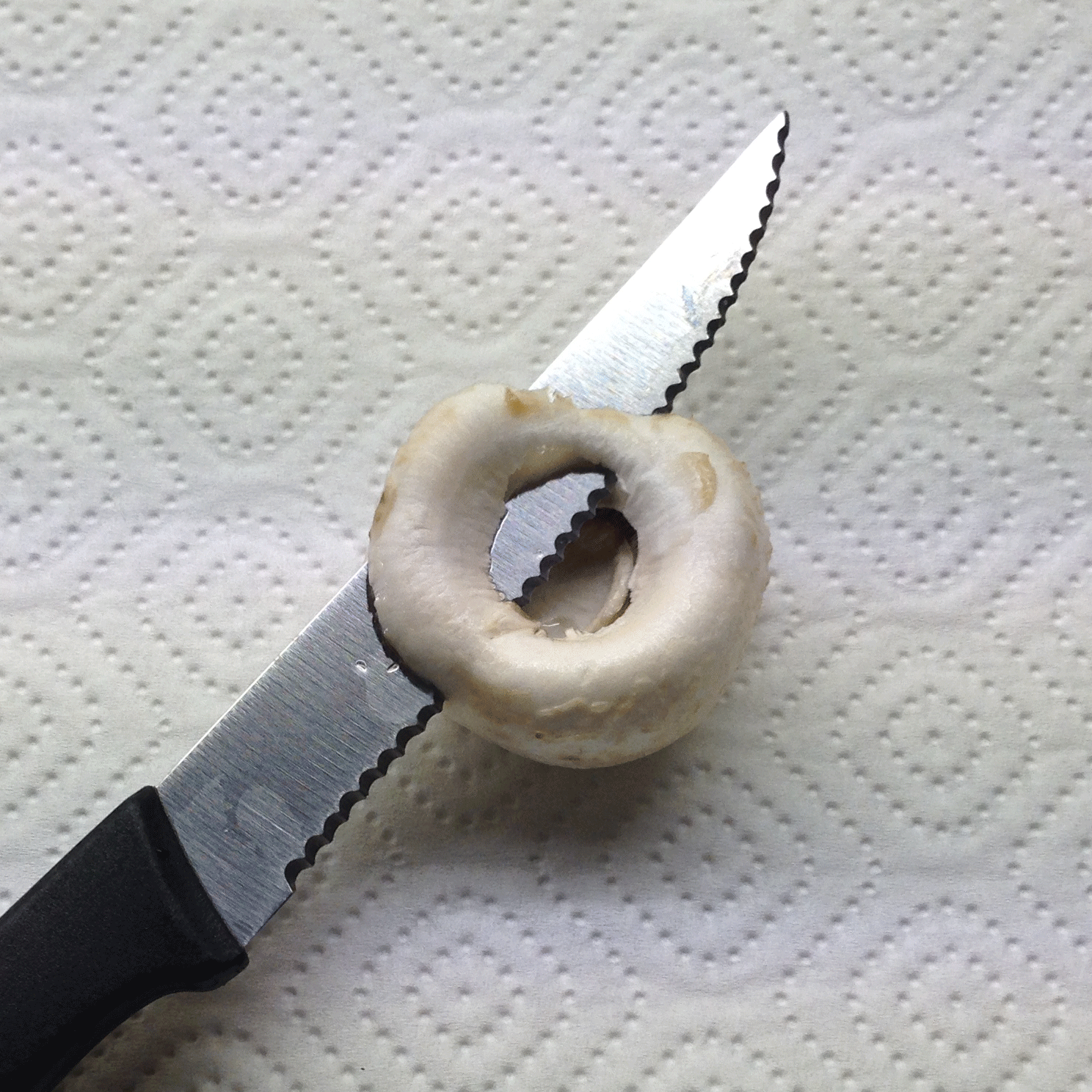 Lavarli sotto l’acqua corrente e con un coltello rimuovere buona parte delle lamelle e la parte del gambo che non si sarà staccata in precedenza, in modo che il foro interno sia il più grande e regolare possibile.