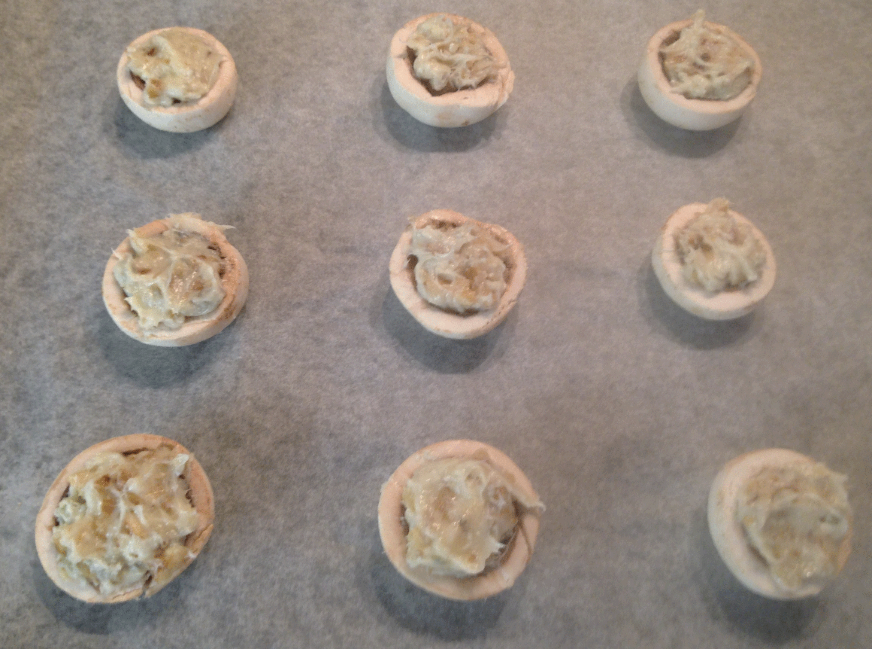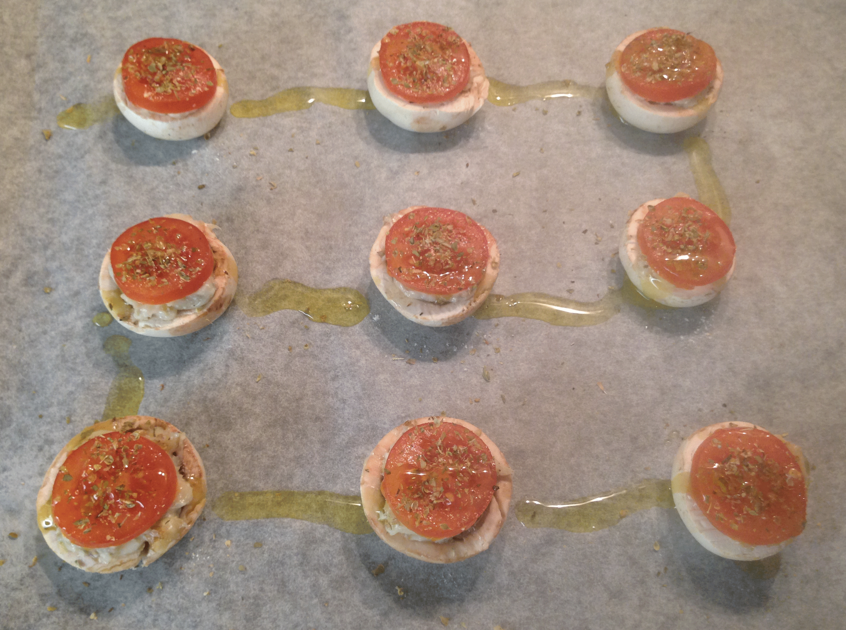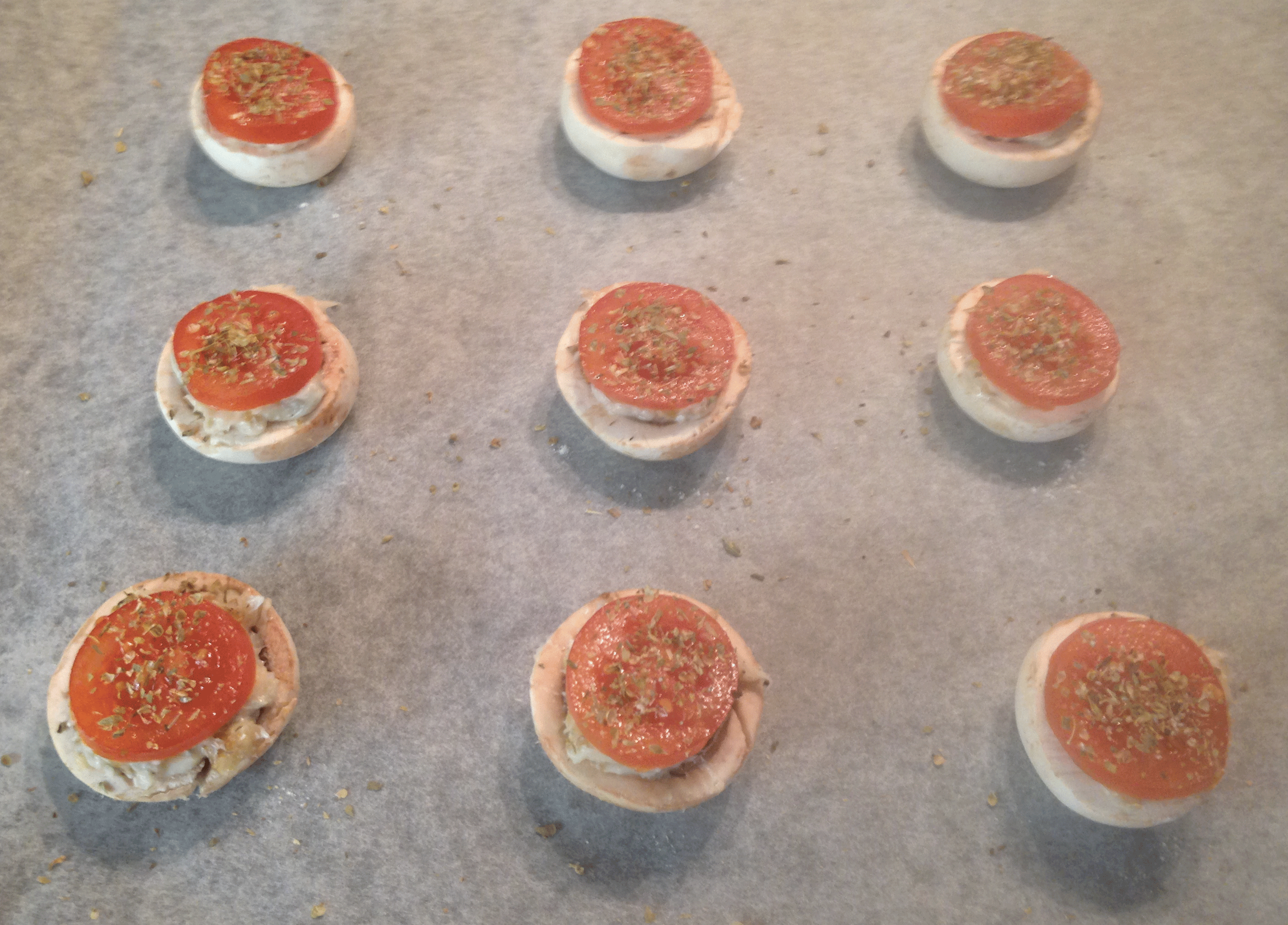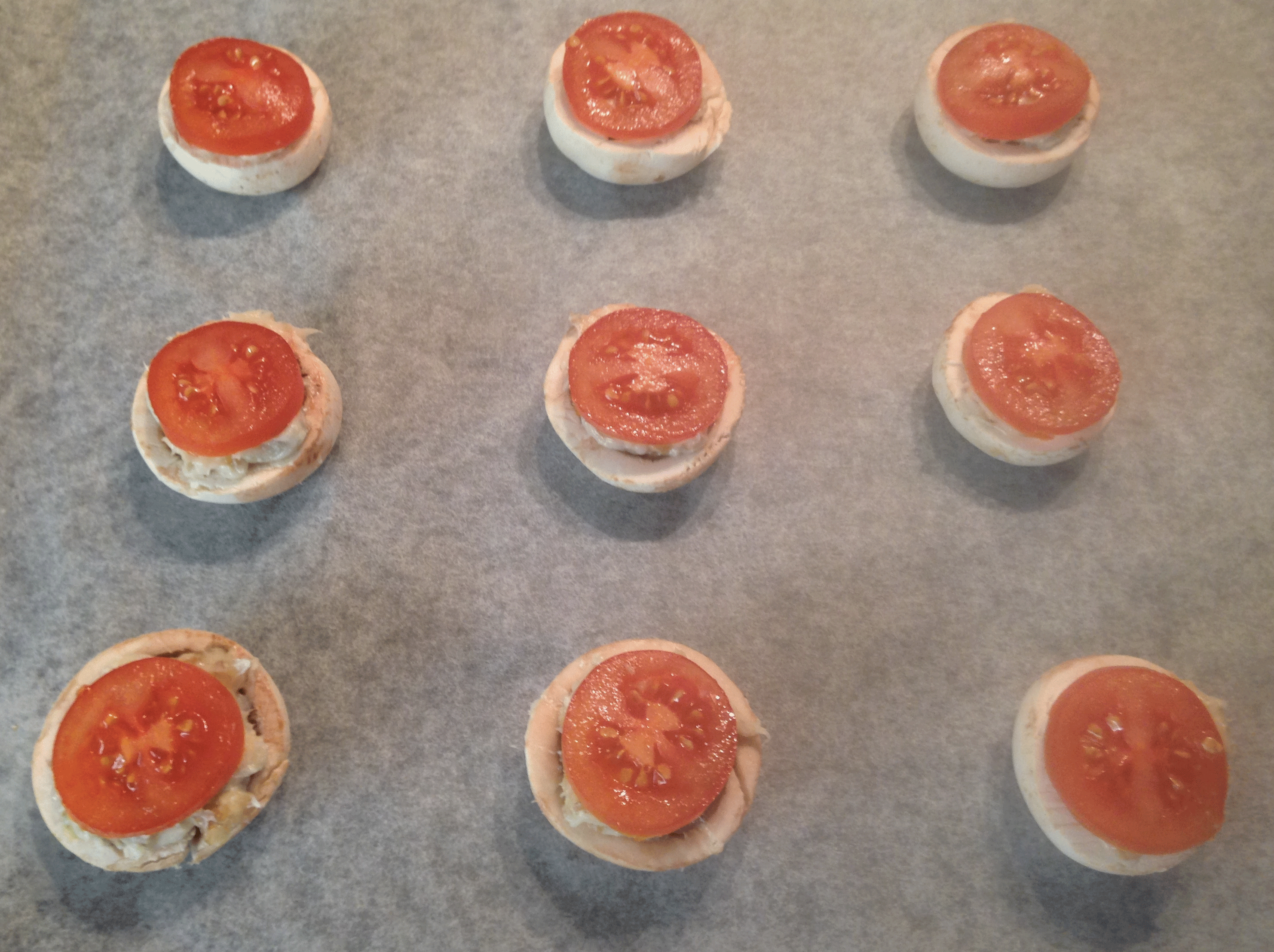 Affettare i pomodori in fette di 2 millimetri e riporre una fetta su ogni champignon.
