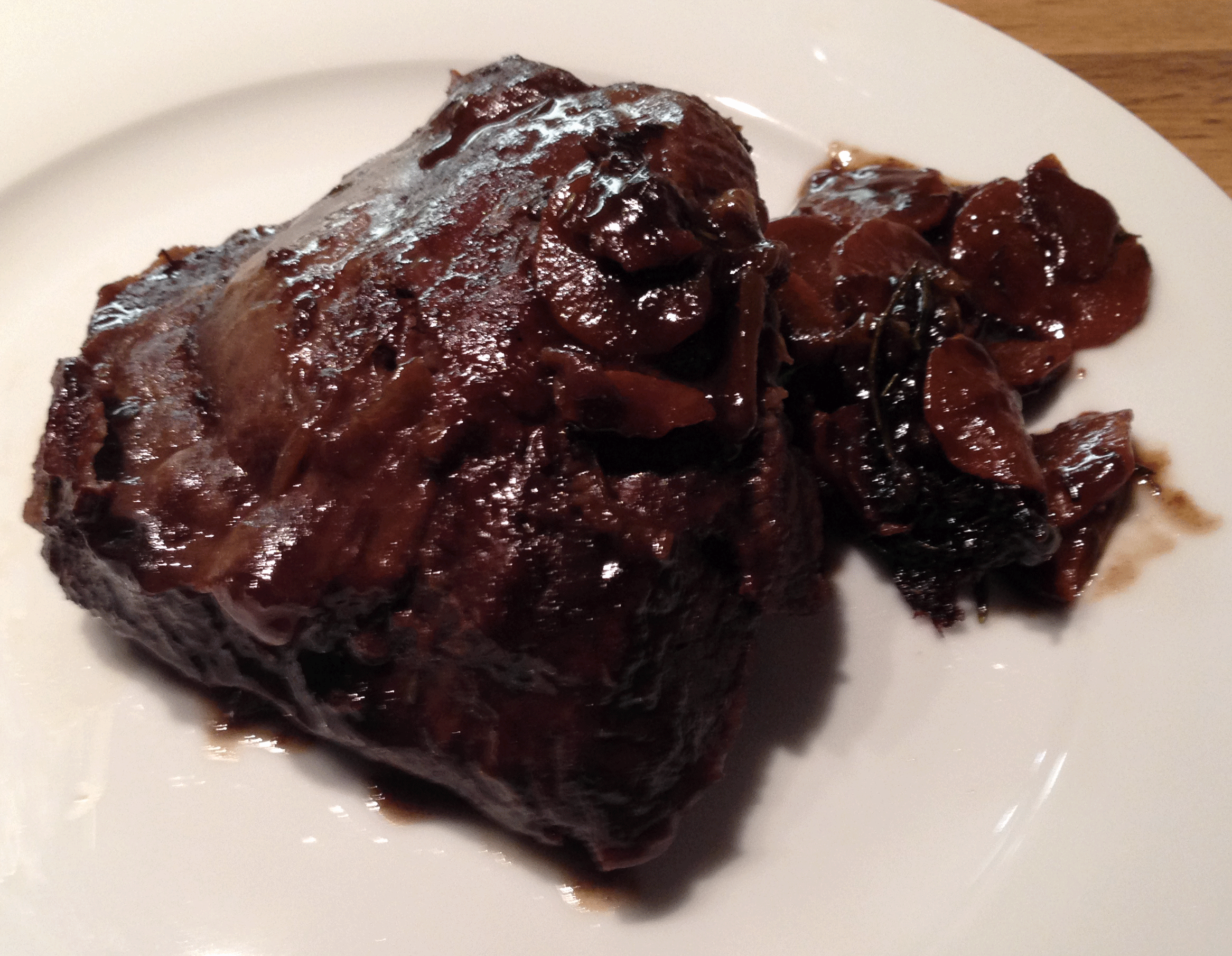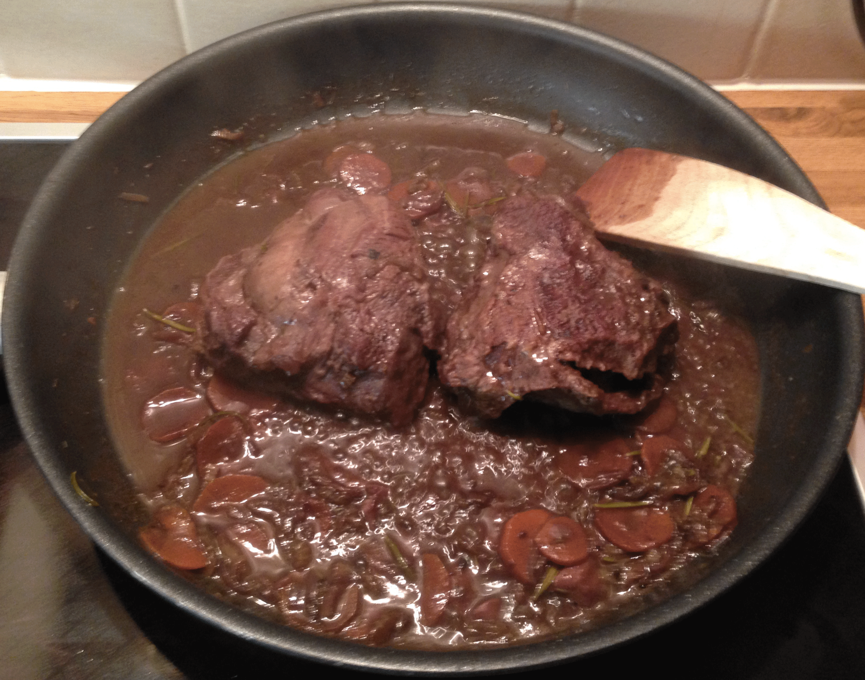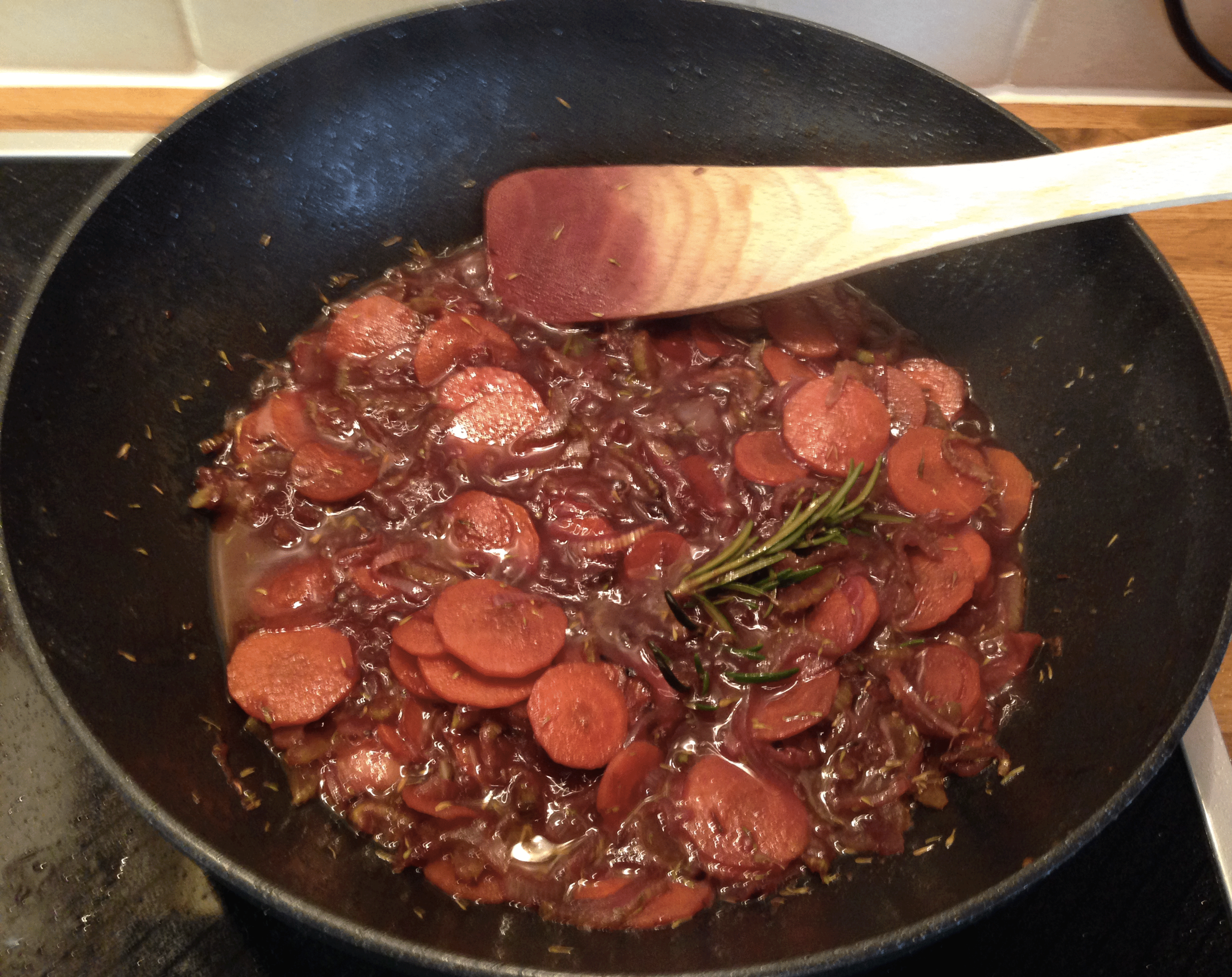 Aggiungere alloro, timo rosmarino sherry e vino rosso e continuare la cottura fino a che i liquidi non si siano ridotti della metà.