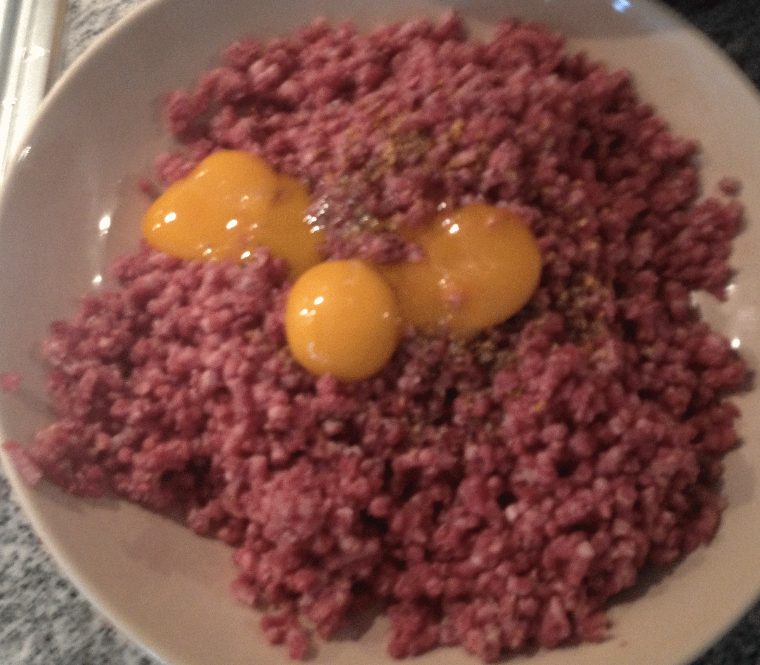 In una ciotola mischiare la carne macinata, i tuorli d’uovo e, a piacimento, le vostre spezie preferite (potete anche non metterne).