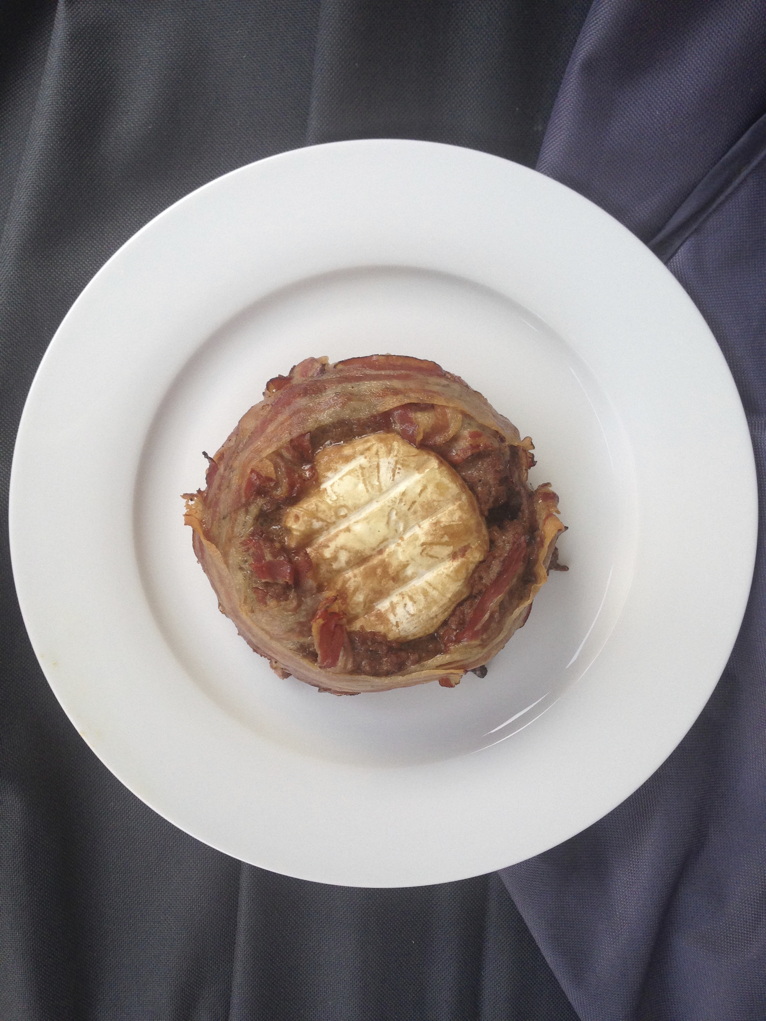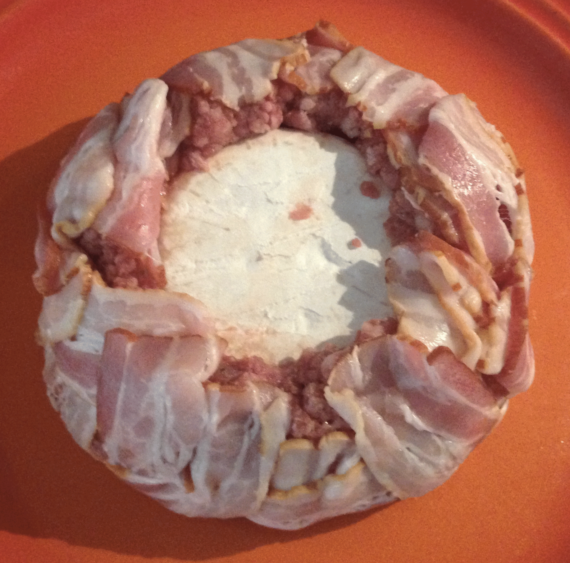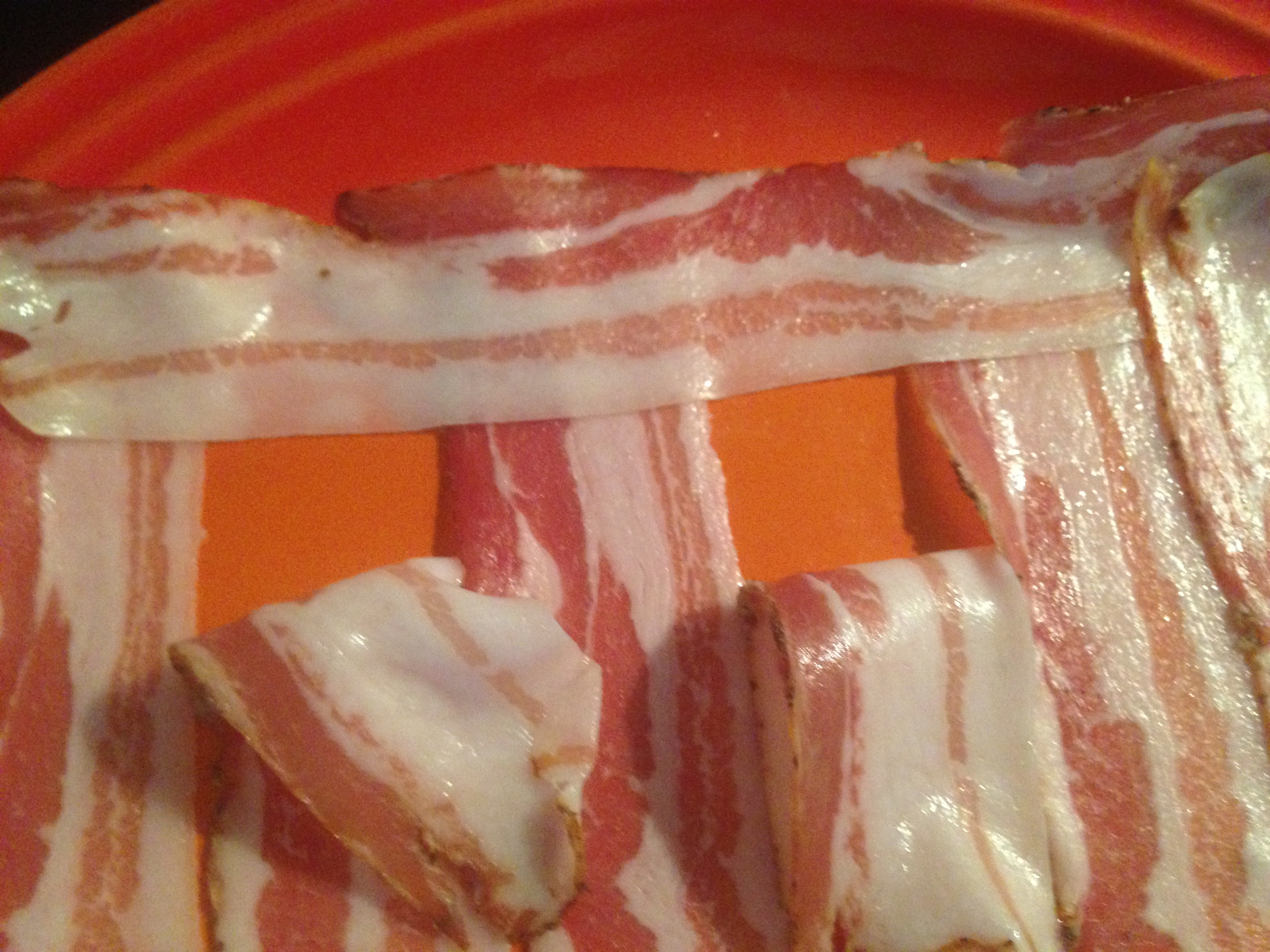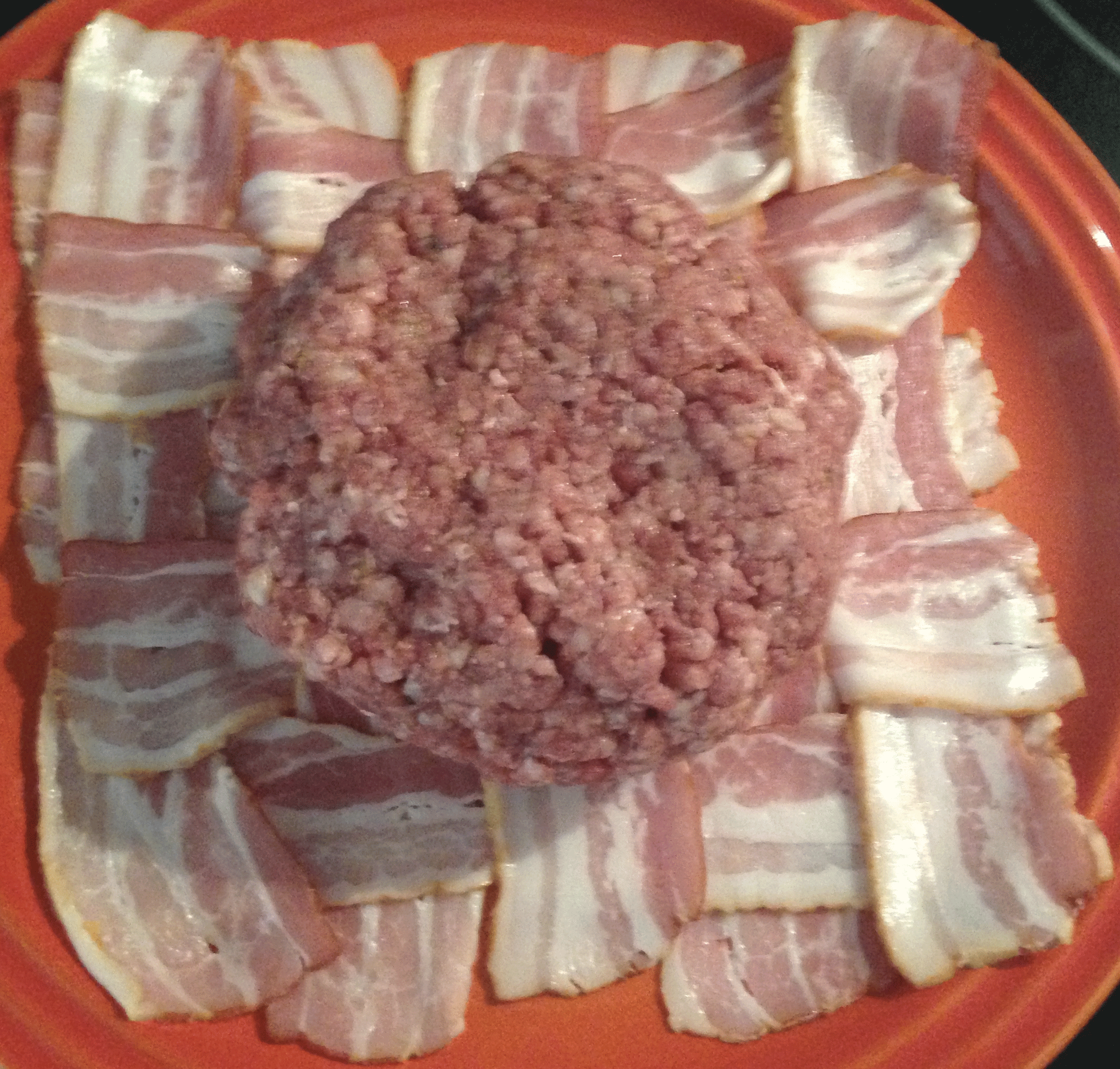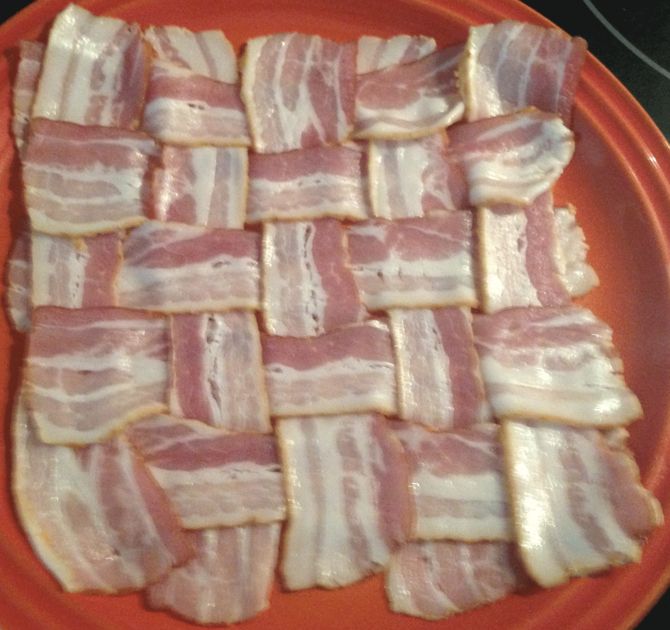 Su un piatto preparare il “letto” di pancetta, disponendo 6 fettine parallelamente una all’altra e andando poi a intrecciare altre 6 fette perpendicolarmente.