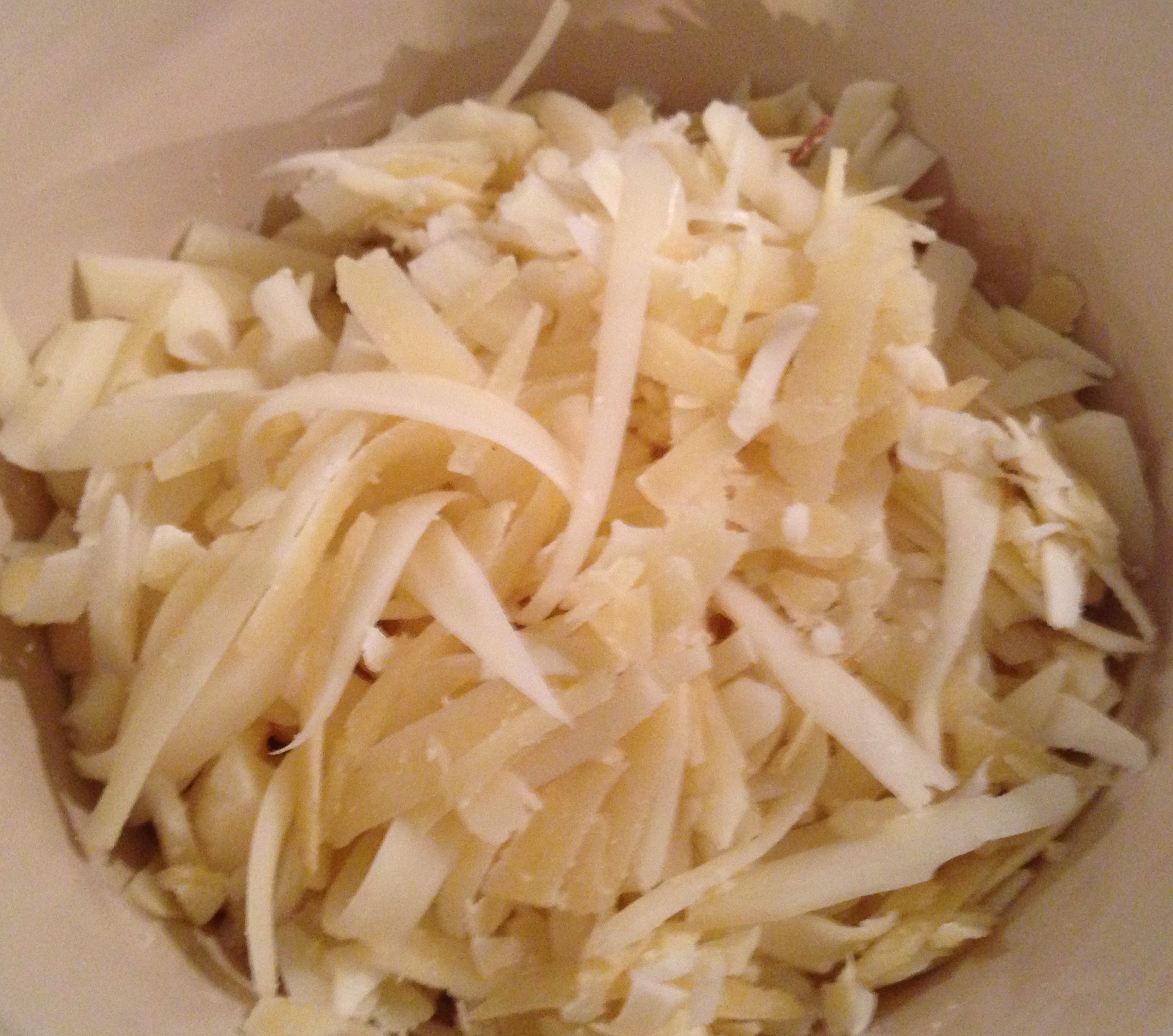 Nel frattempo tagliare a piccoli cubetti oppure grattugiate a listelle grosse (vedi foto), tutto il formaggio, mischiandolo per bene.