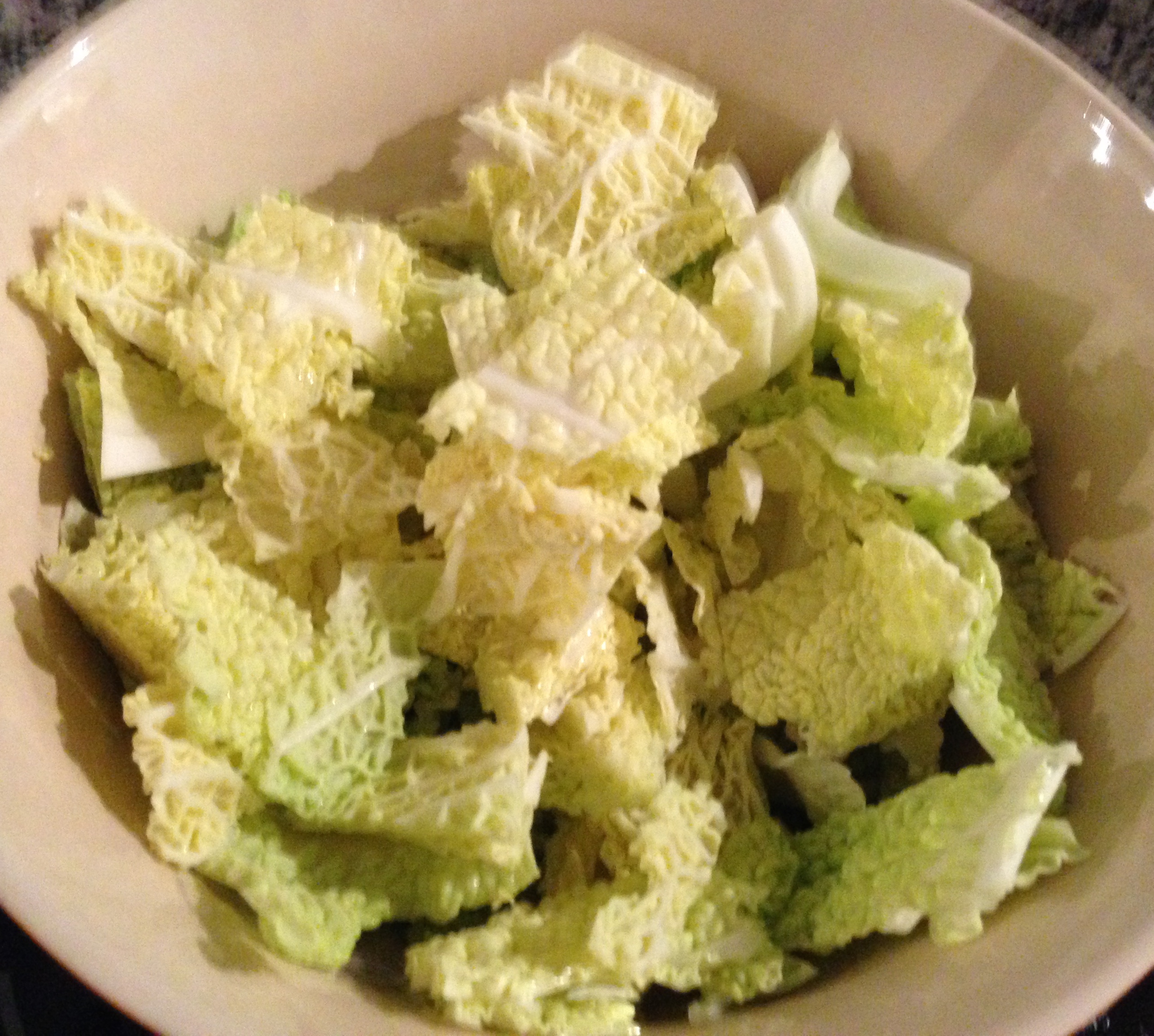 Pulire la verza, tagliarla a metà e poi in quarti. Eliminare la parte dura interna e tagliare poi a strisce di circa 1.5/2 centimetri.