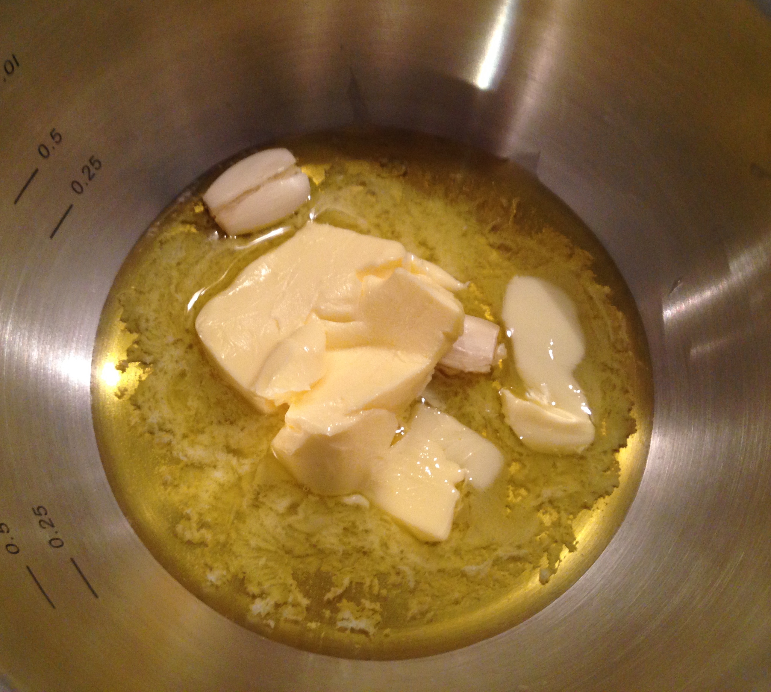 In un pentolino, scogliere il burro e friggervi l’aglio lasciandolo ben colorire.