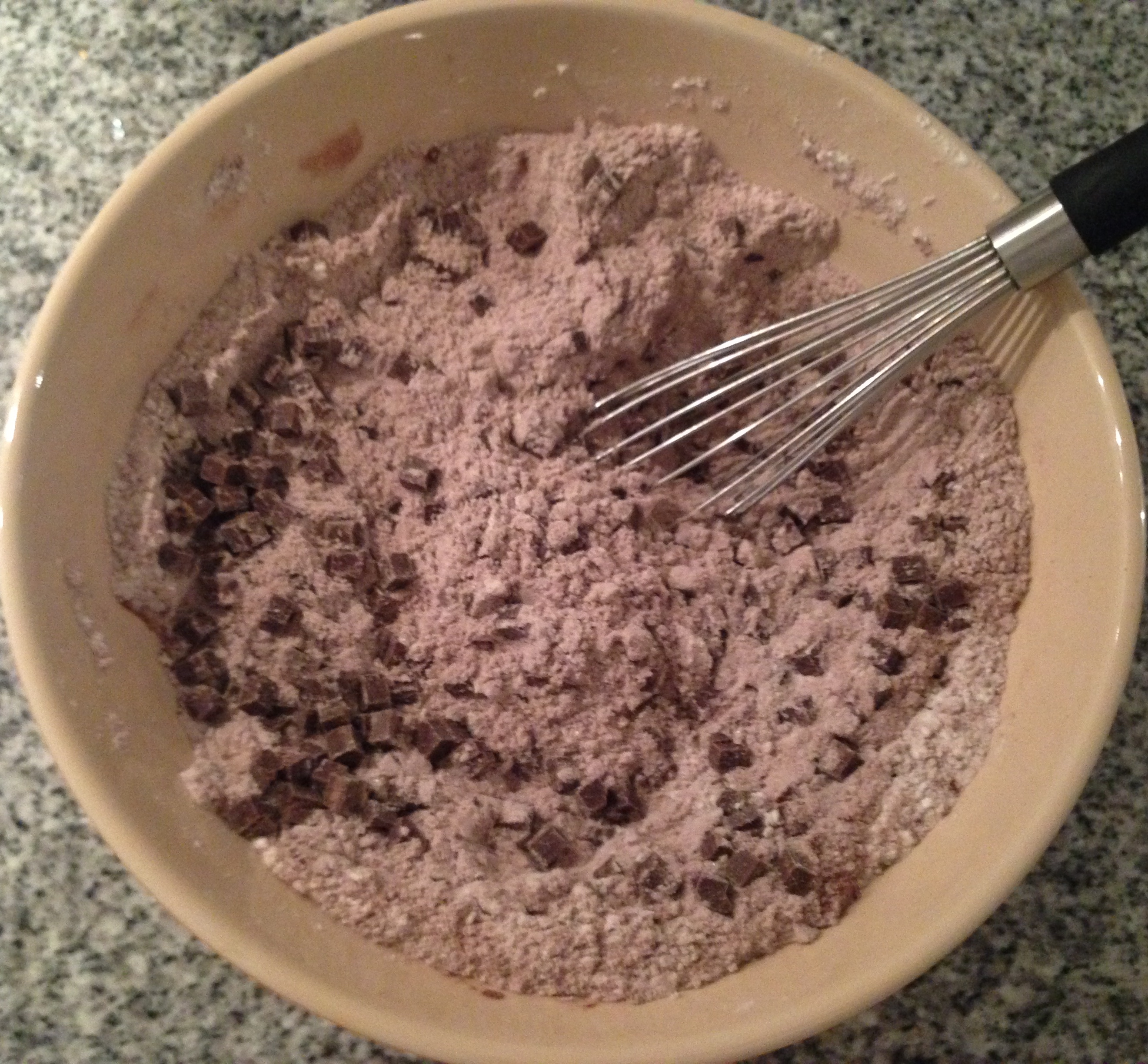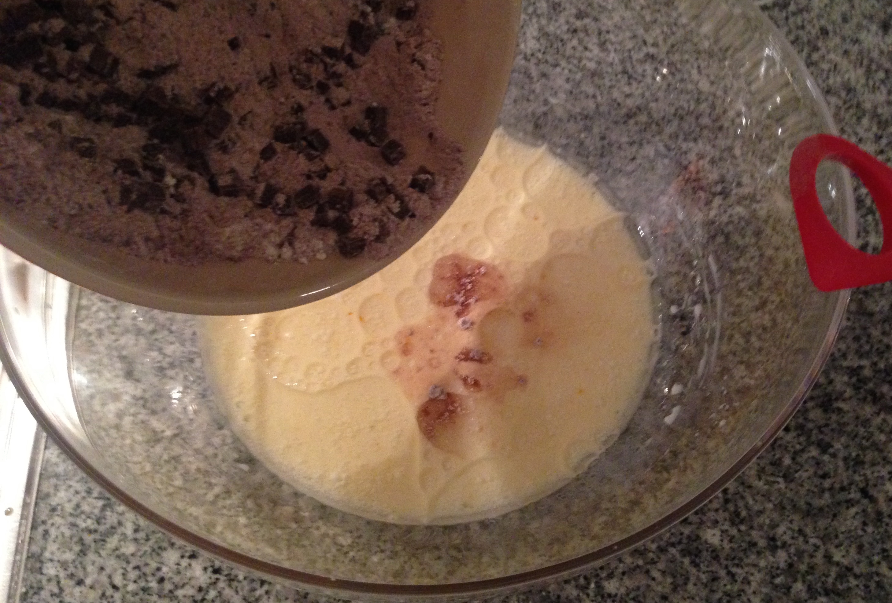 Mettere tutti gli ingredienti secchi in una ciotola (mettere da parte 10/15 gr. di gocce di cioccolato che userete in seguito).