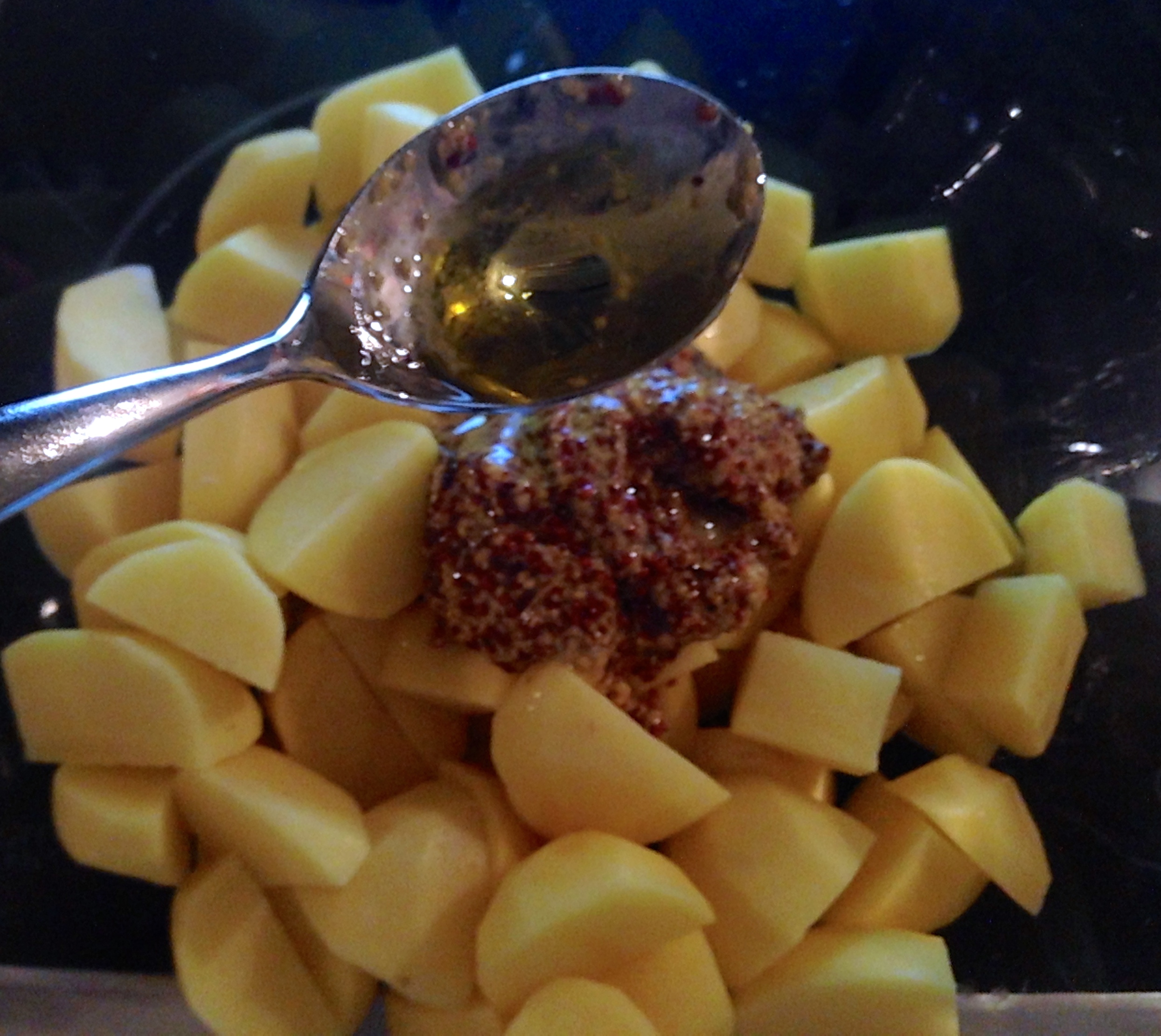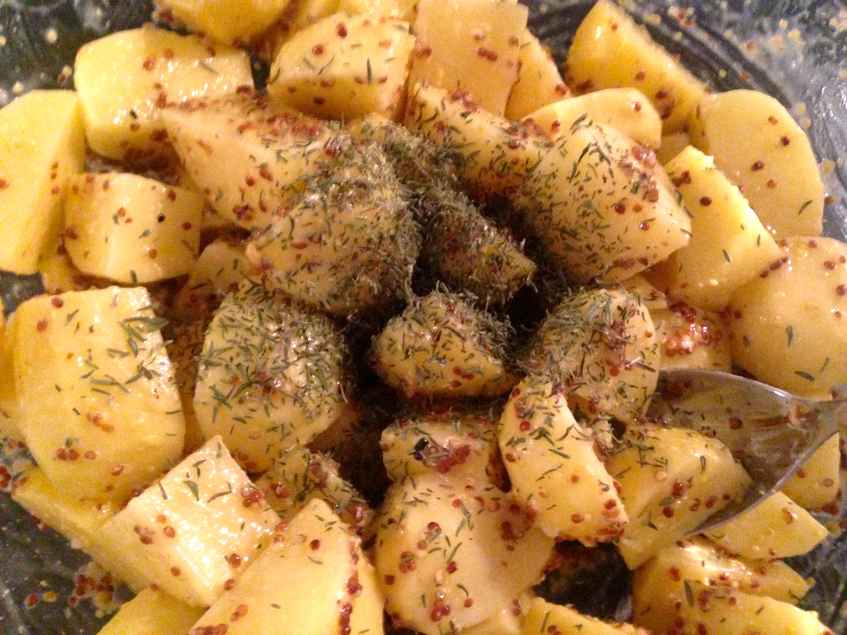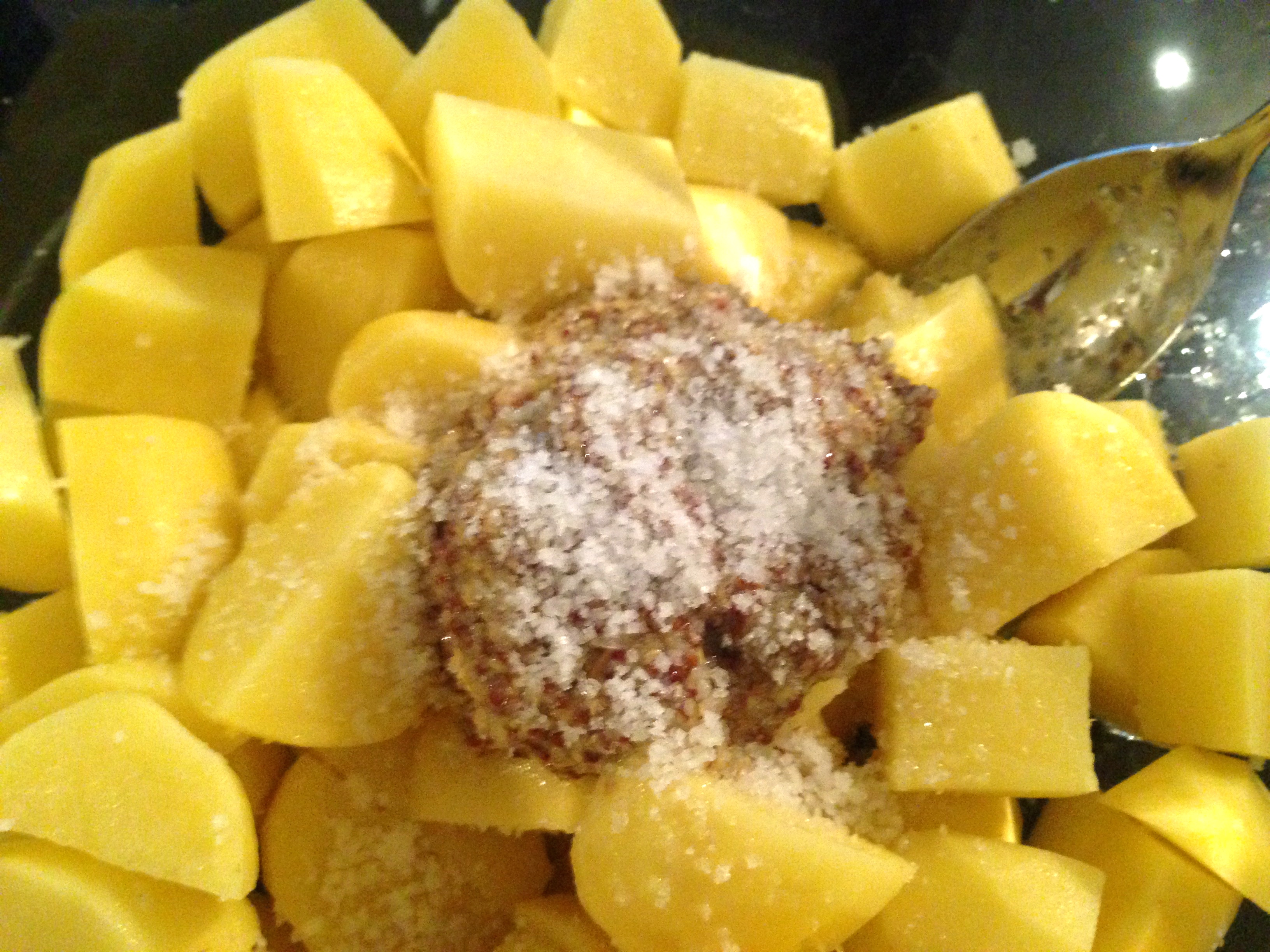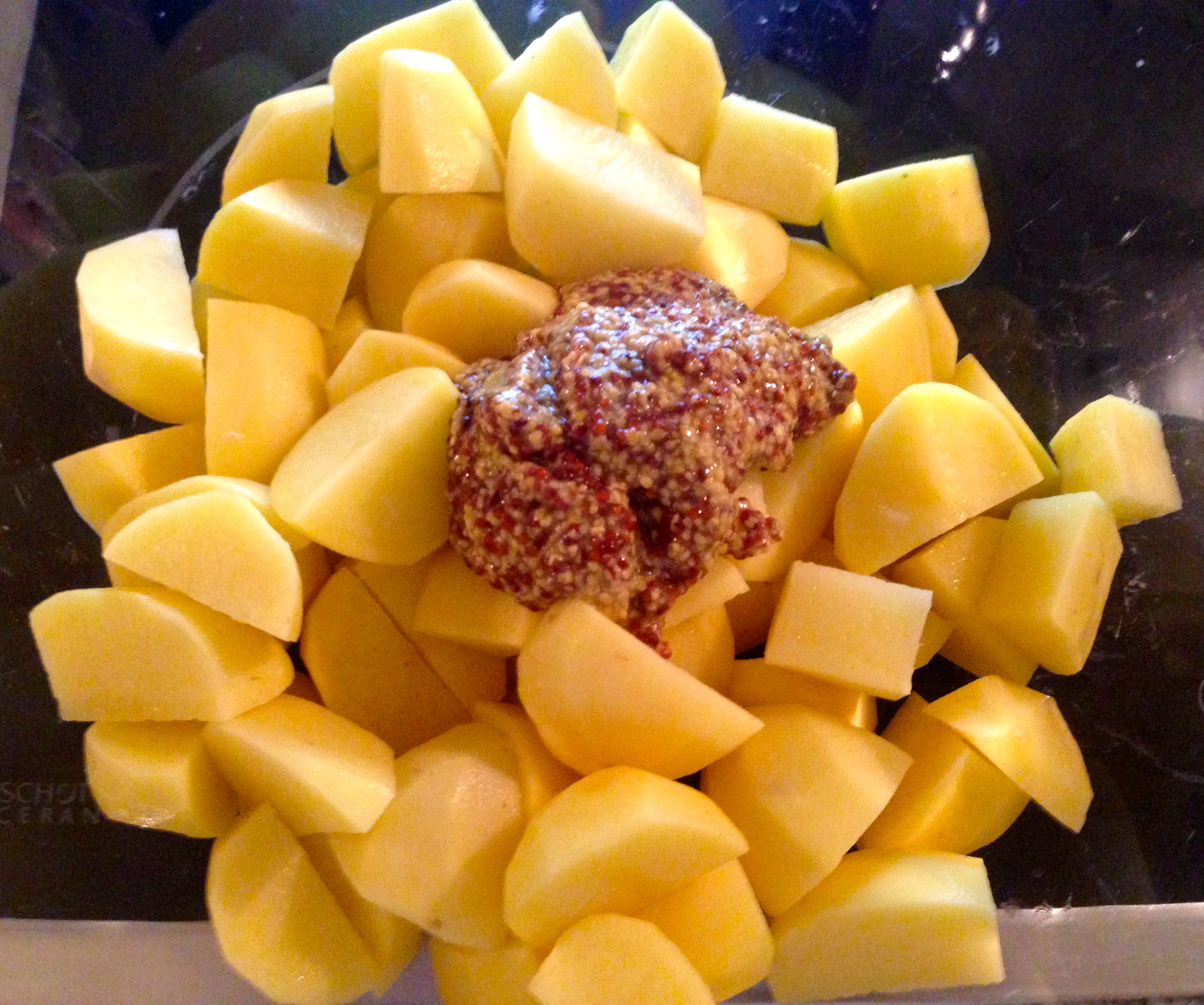 Mettere le patate in una ciotola e aggiungere la senape in grani.