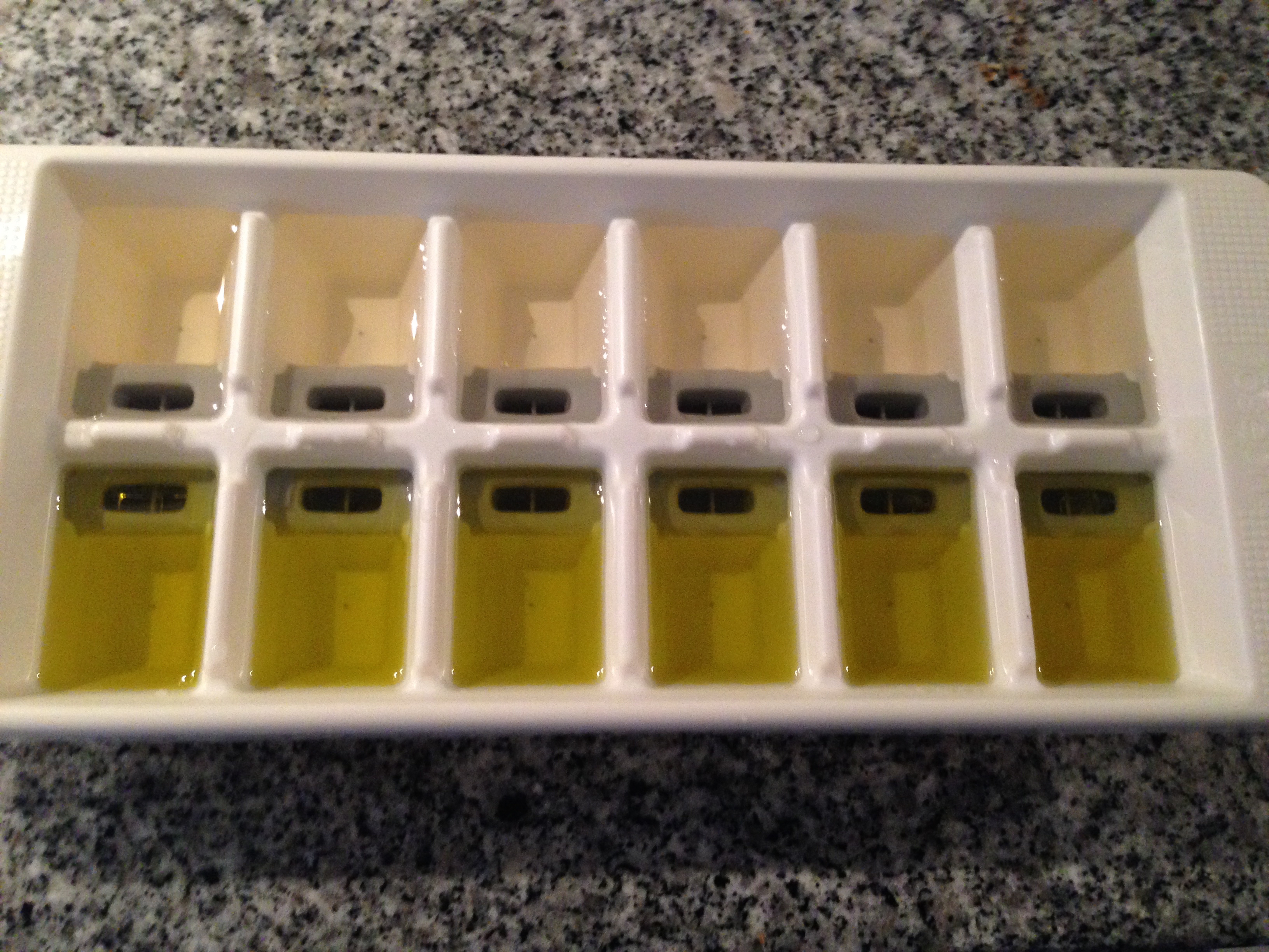 La sera prima, mettere l’olio d’oliva e il vino bianco in una forma per ghiacci e congelarli. Questo ci permetterà di inserire olio e vino nelle buste per il sottovuoto evitando i noti problemi di aspirazione dei liquidi.