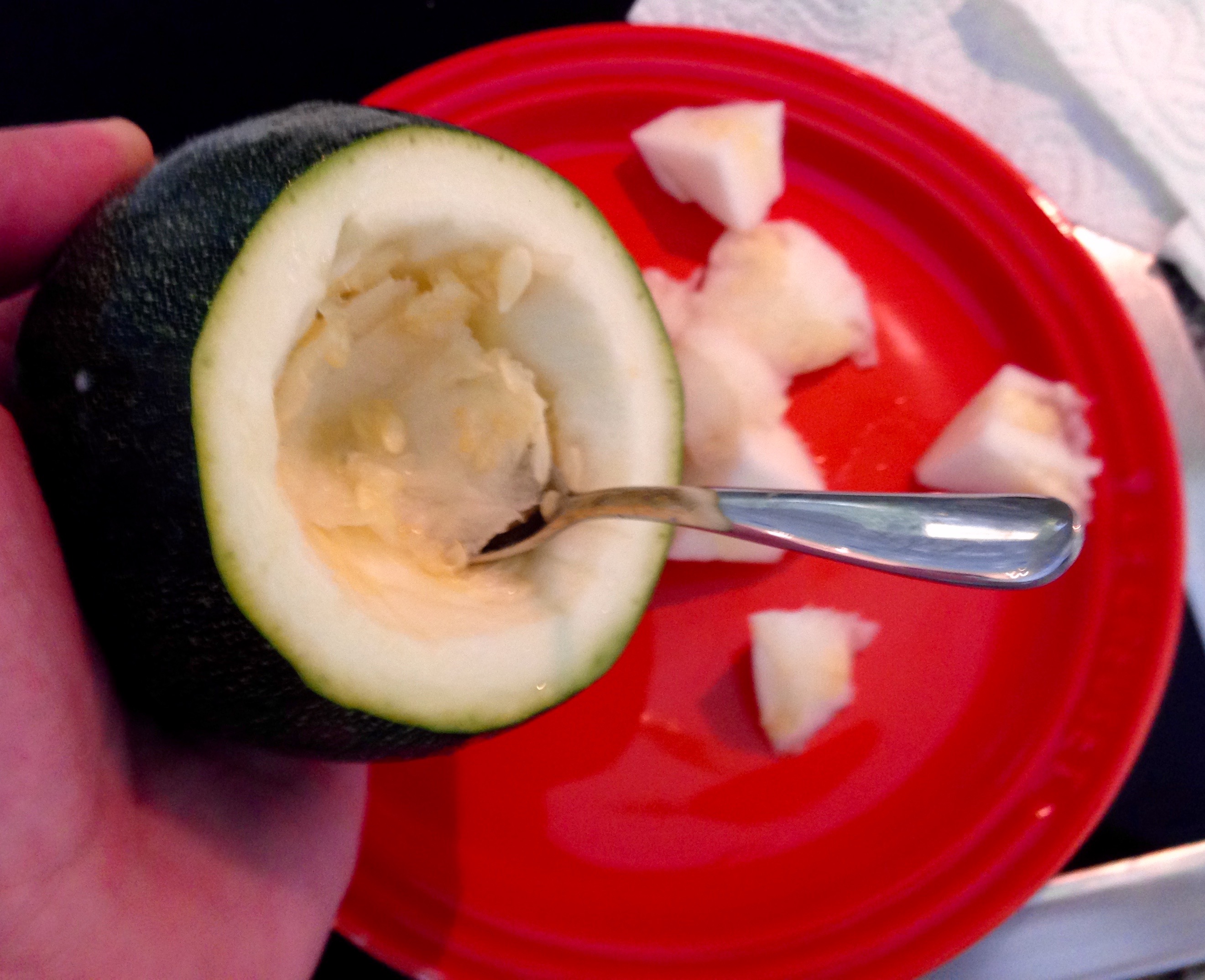 Scavare l’interno aiutandosi con un cucchiaino, facendo attenzione di lasciare il bordo spesso almeno mezzo centimetro. Tenere da parte il la polpa estratta dall’interno.