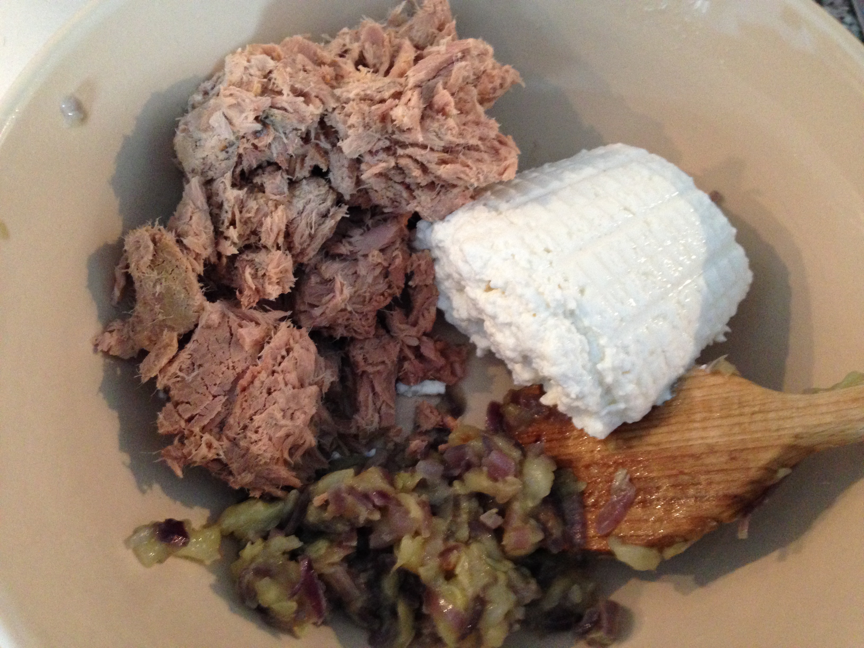 Mischiare in una ciotola le verdure stufate con la ricotta, il tonno (sgocciolato, strizzato e spezzettato), i capperi tritati e un pizzico di sale.
