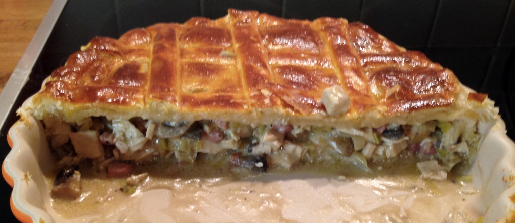 Rivestire l’uno o l’altro di pasta sfoglia e bucherellare il fondo della pasta, riempire con il composto di pollo, spennellare i bordi con un po’ di albume e chiudere con un coperchi fatto con uno strato di pasta sfoglia, premendo insieme i bordi. Spennellare la superficie con un po’ di tuorlo e praticare dei fori in superficie incidendo con la punta di un coltello.
