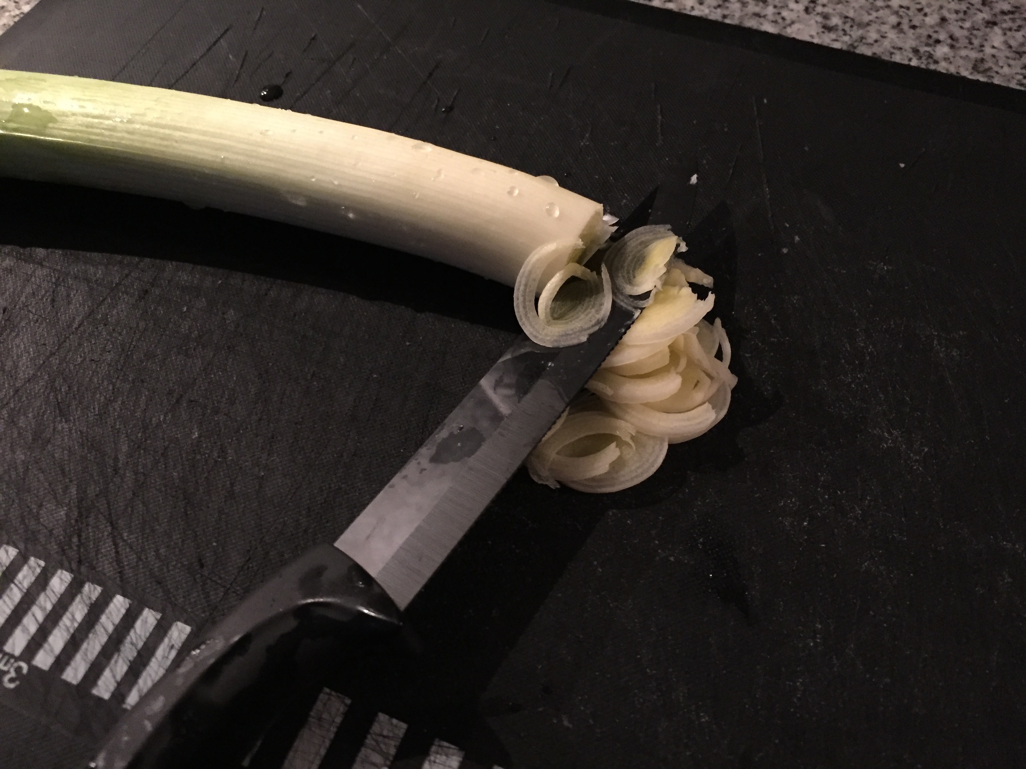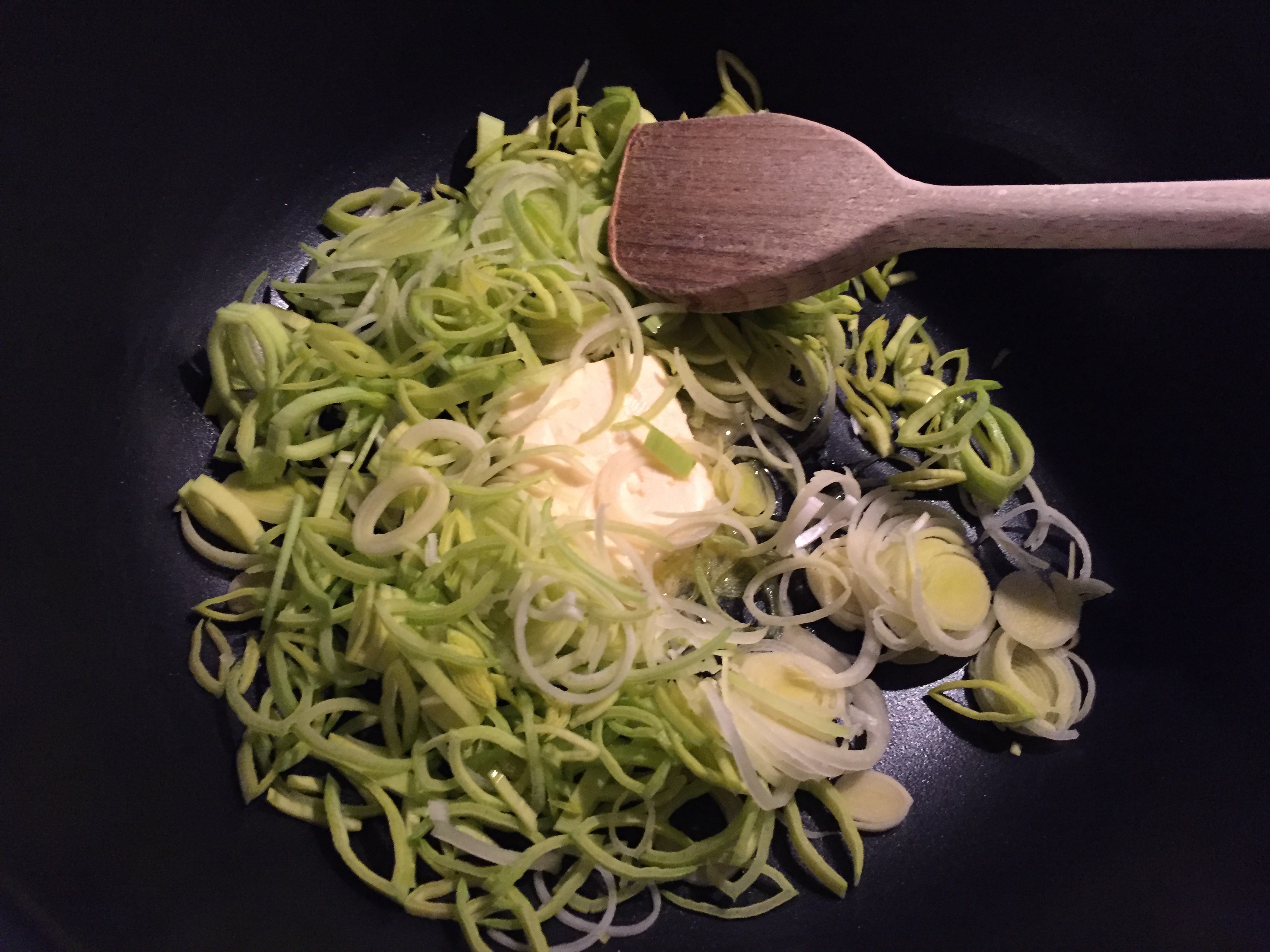 Tagliare finemente il porro e farlo appassire in una padella con un filo d’olio d’oliva o un po’ di burro.