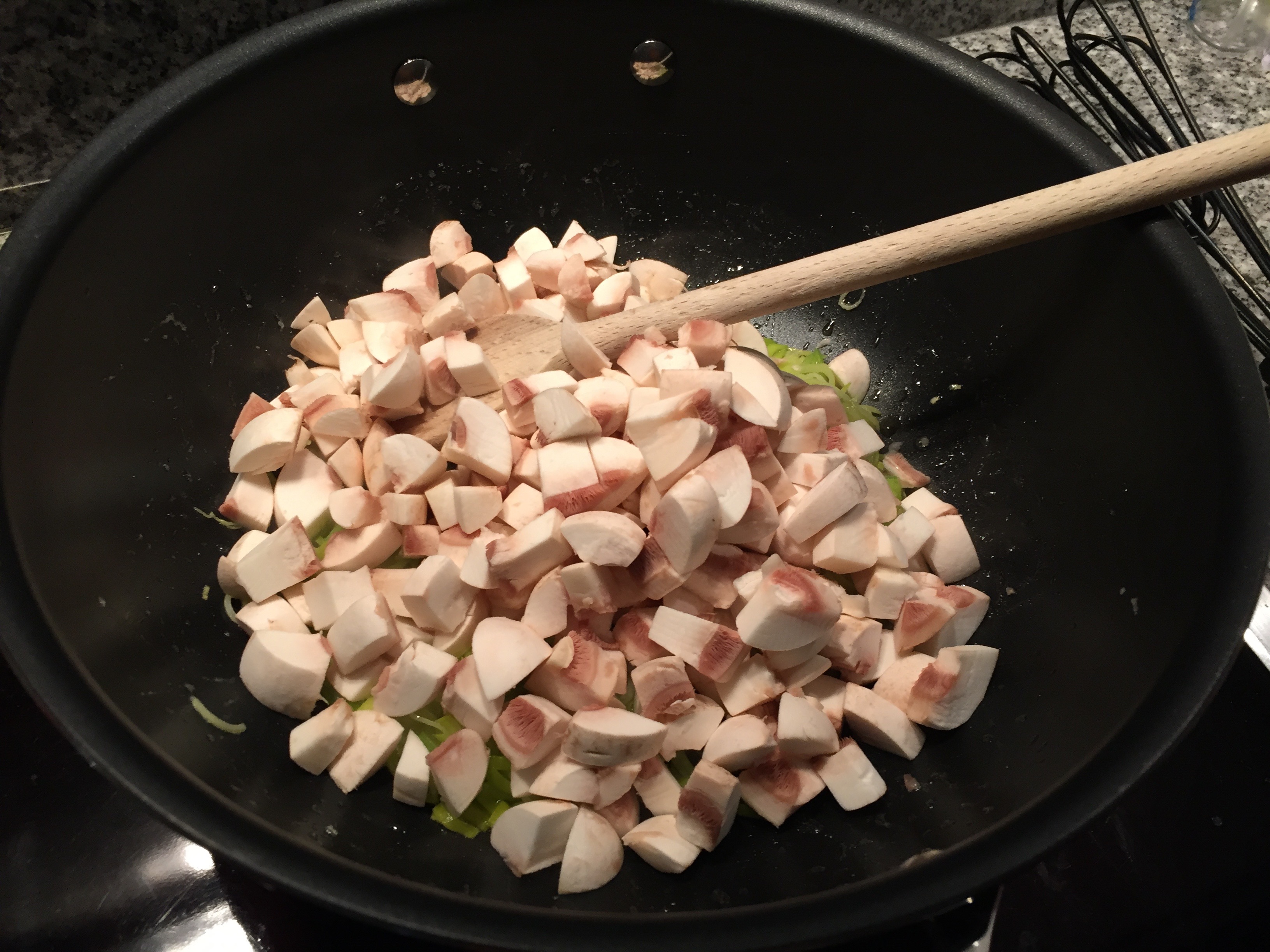 In un secondo tempo, verso fine cottura aggiungere la pancetta dolce.