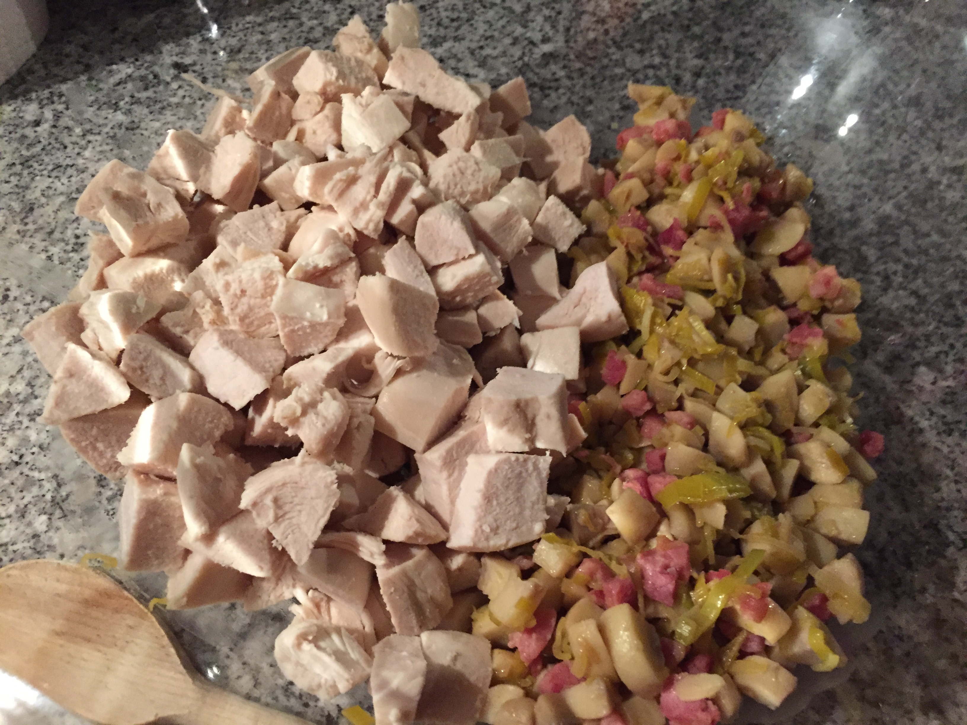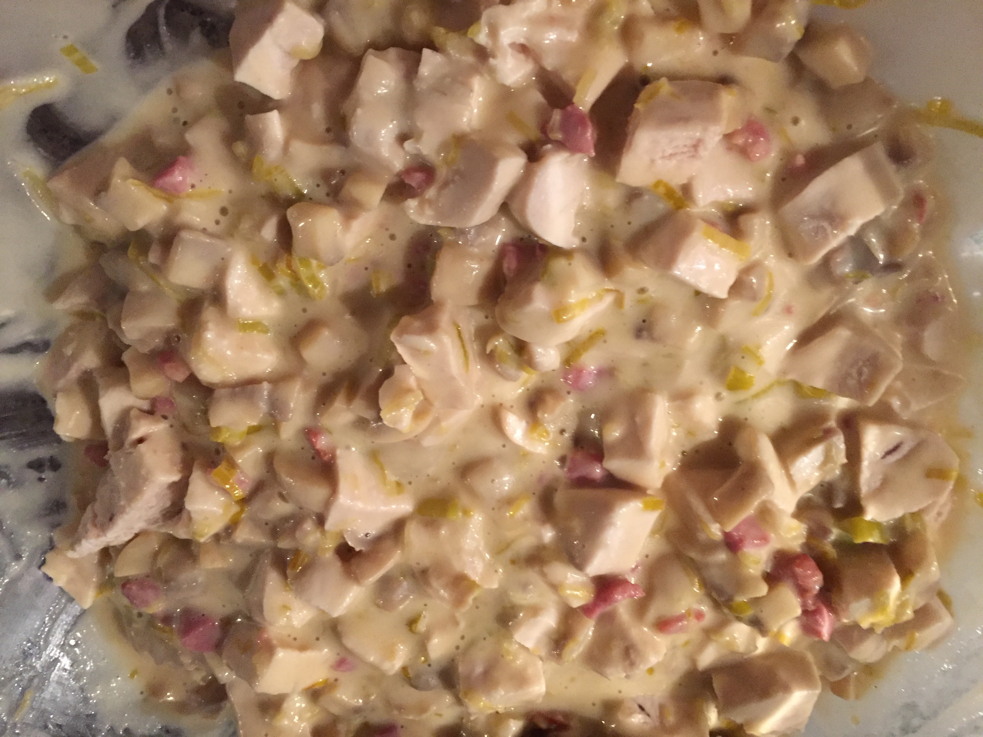 In una ciotola, unire il pollo con il composto di porro, funghi e pancetta, mettendo abbastanza salsa al fine di ottenere un impasto denso ma non troppo compatto; aggiustare con aromat, sale e pepe.