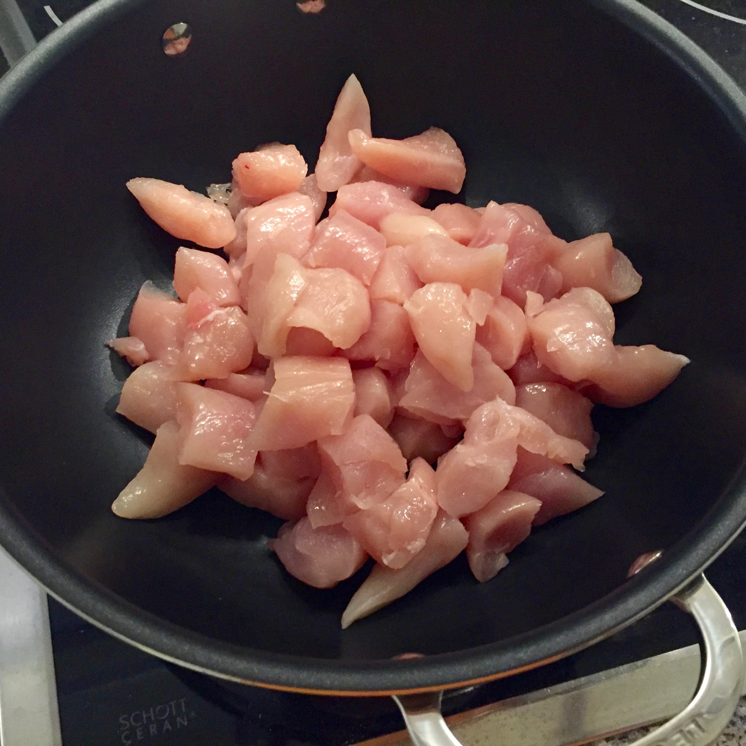 Tagliare il pollo a tocchetti e metterlo in una padella.