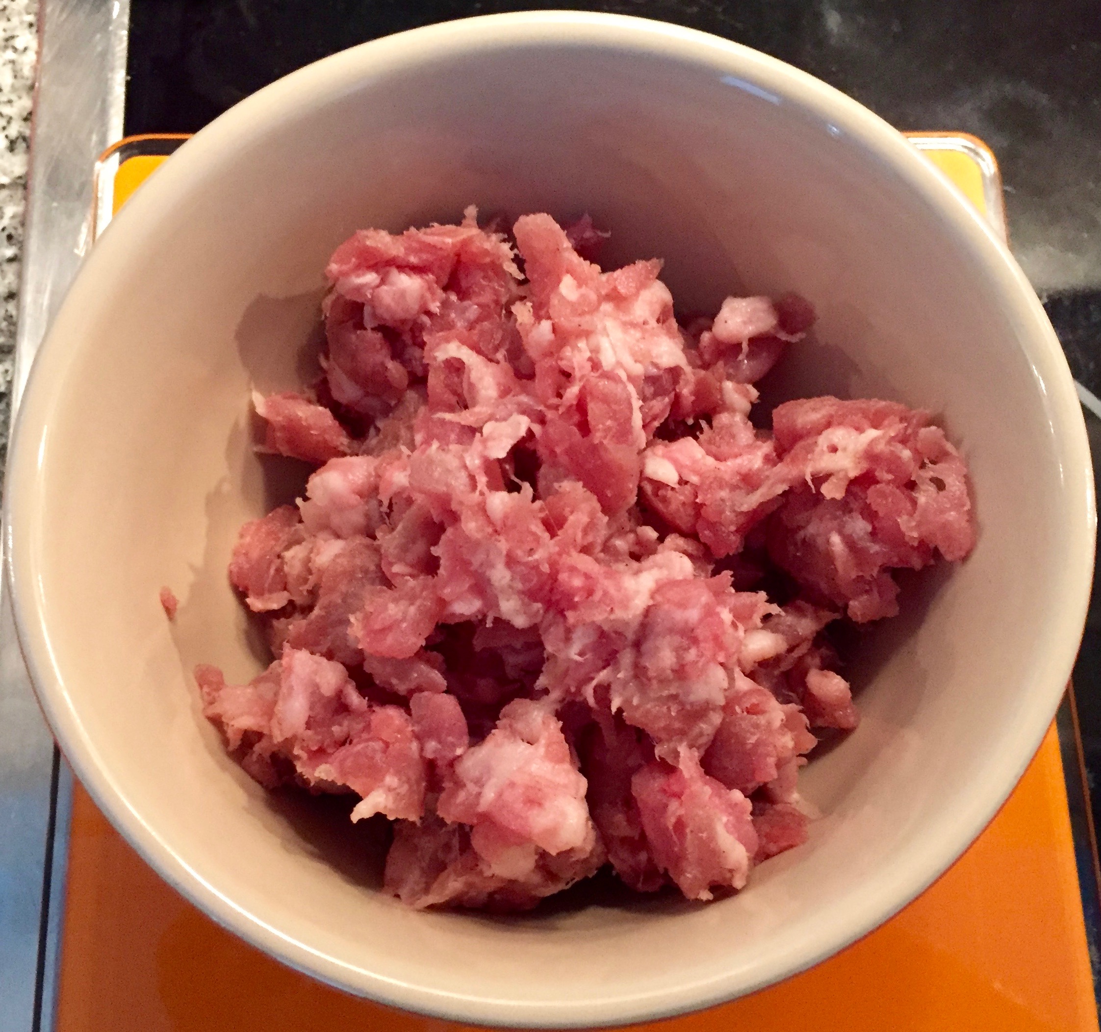 Preparare la luganighetta “premendola” all’esterno del budello e sbriciolandola.