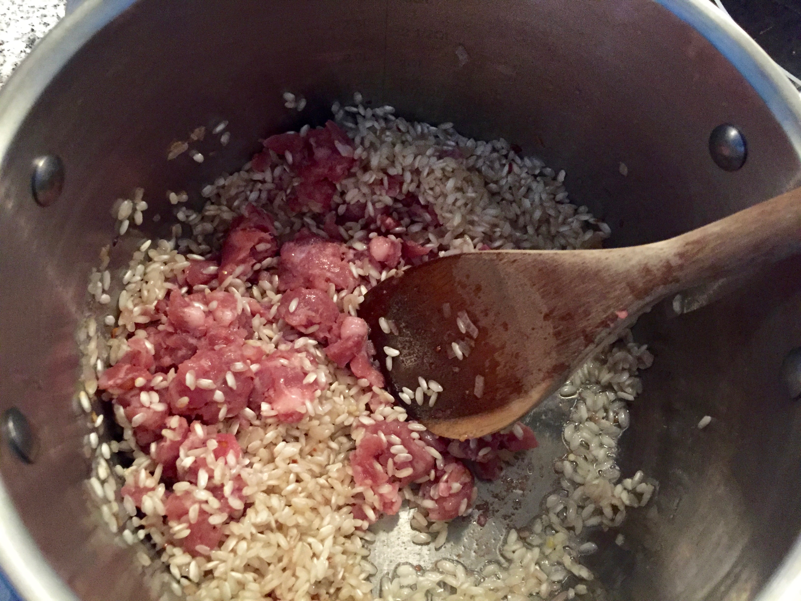 Dopodiché aggiungere il riso e la luganighetta. Rimestare per tostare il riso.