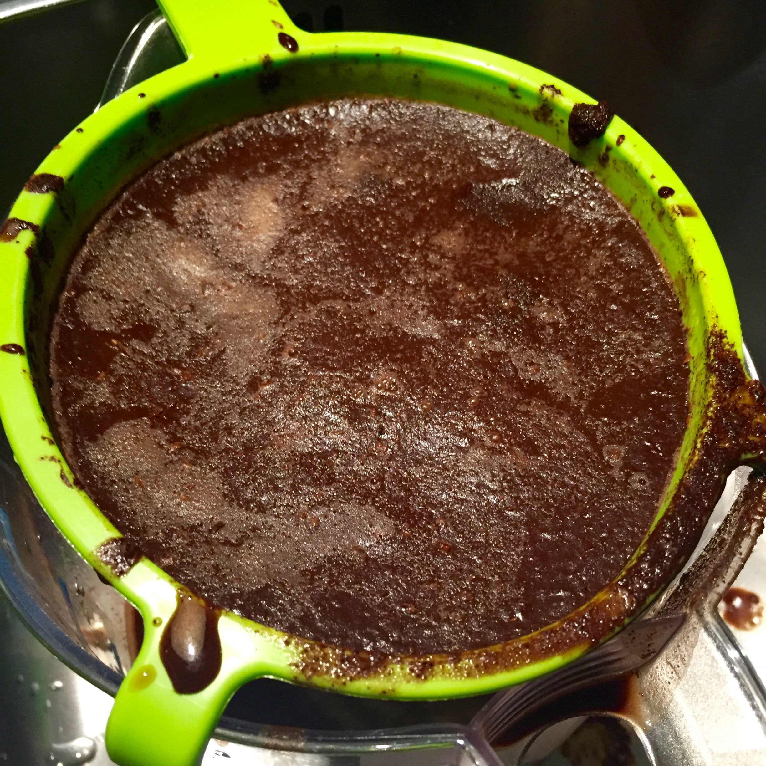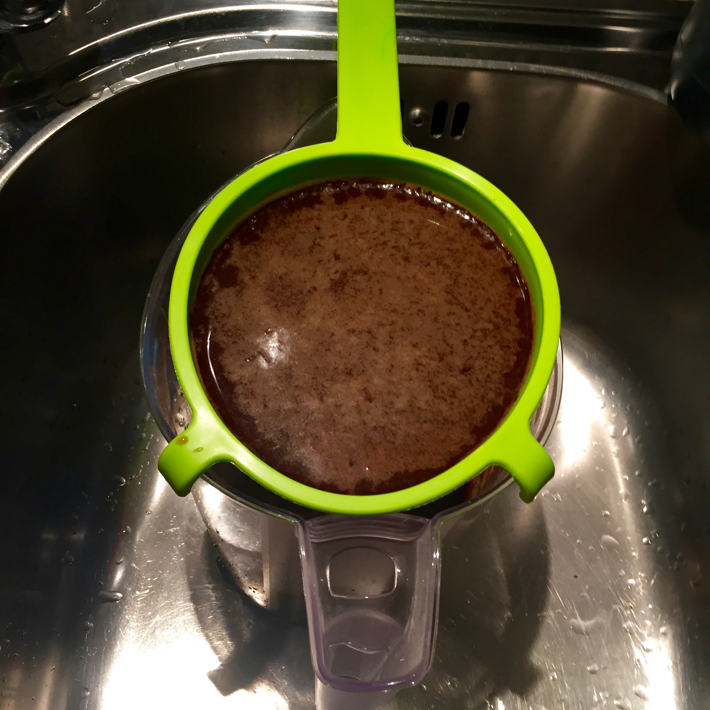 Quindi passare prima il tutto in un setaccio, in modo da poter scartare il caffè, raccogliendo il liquido in una bacinella.