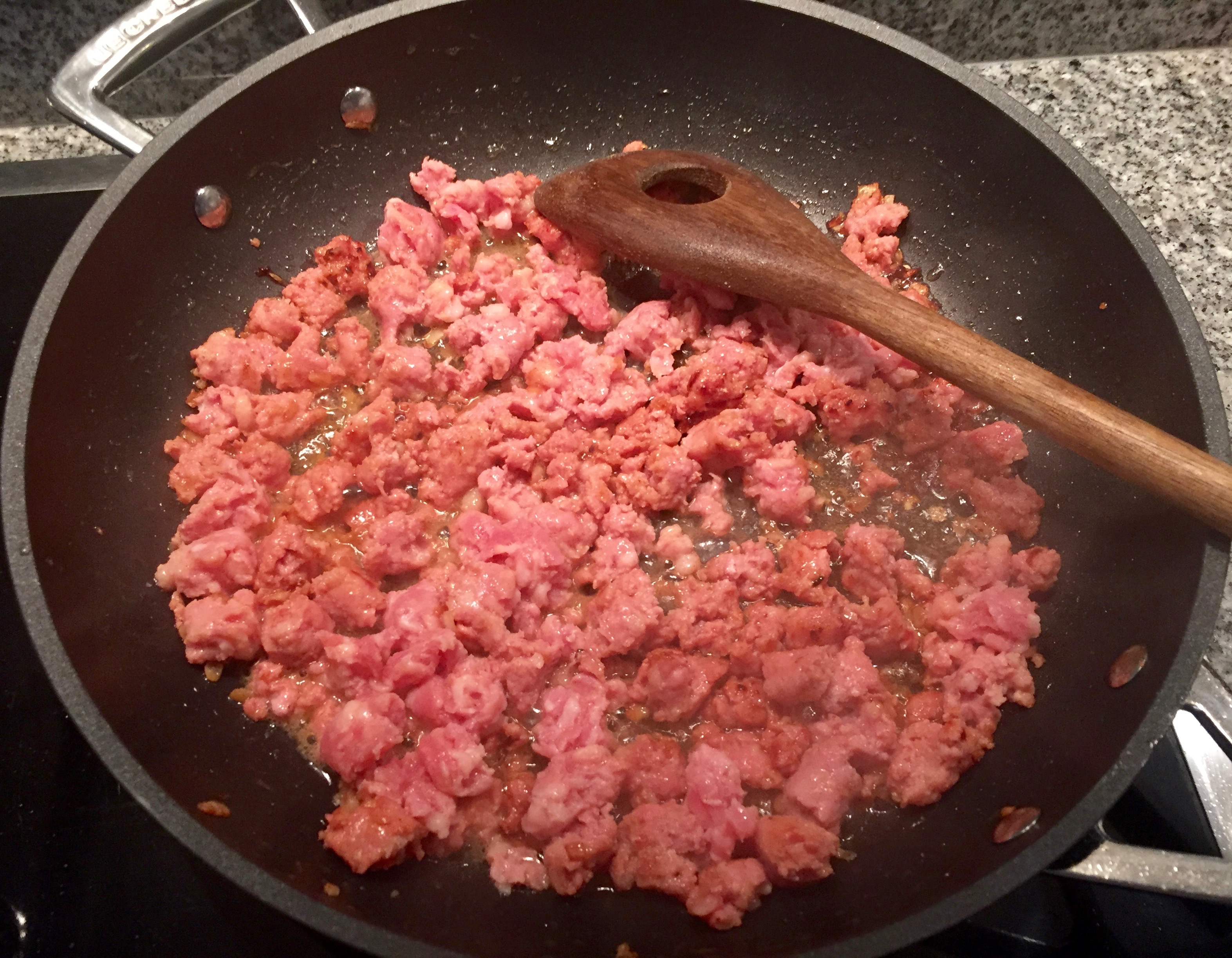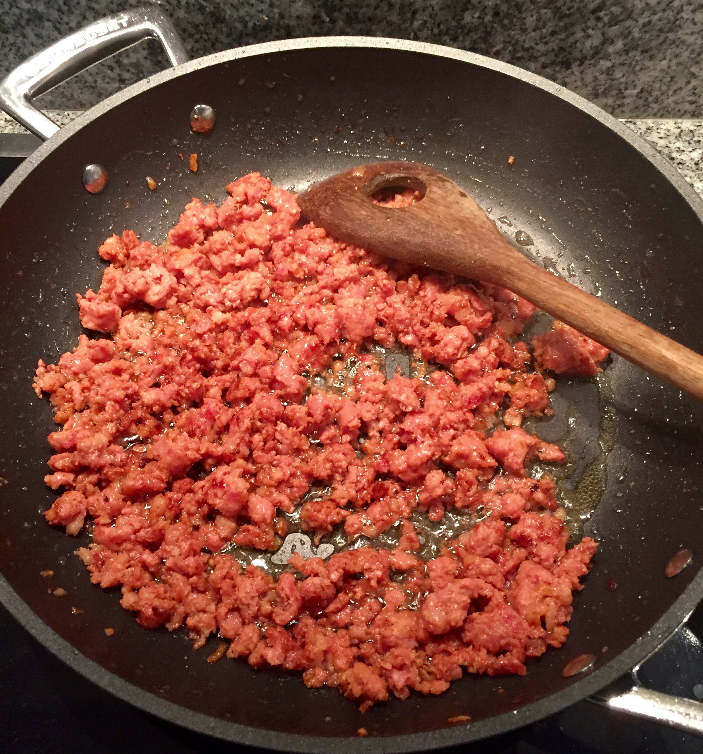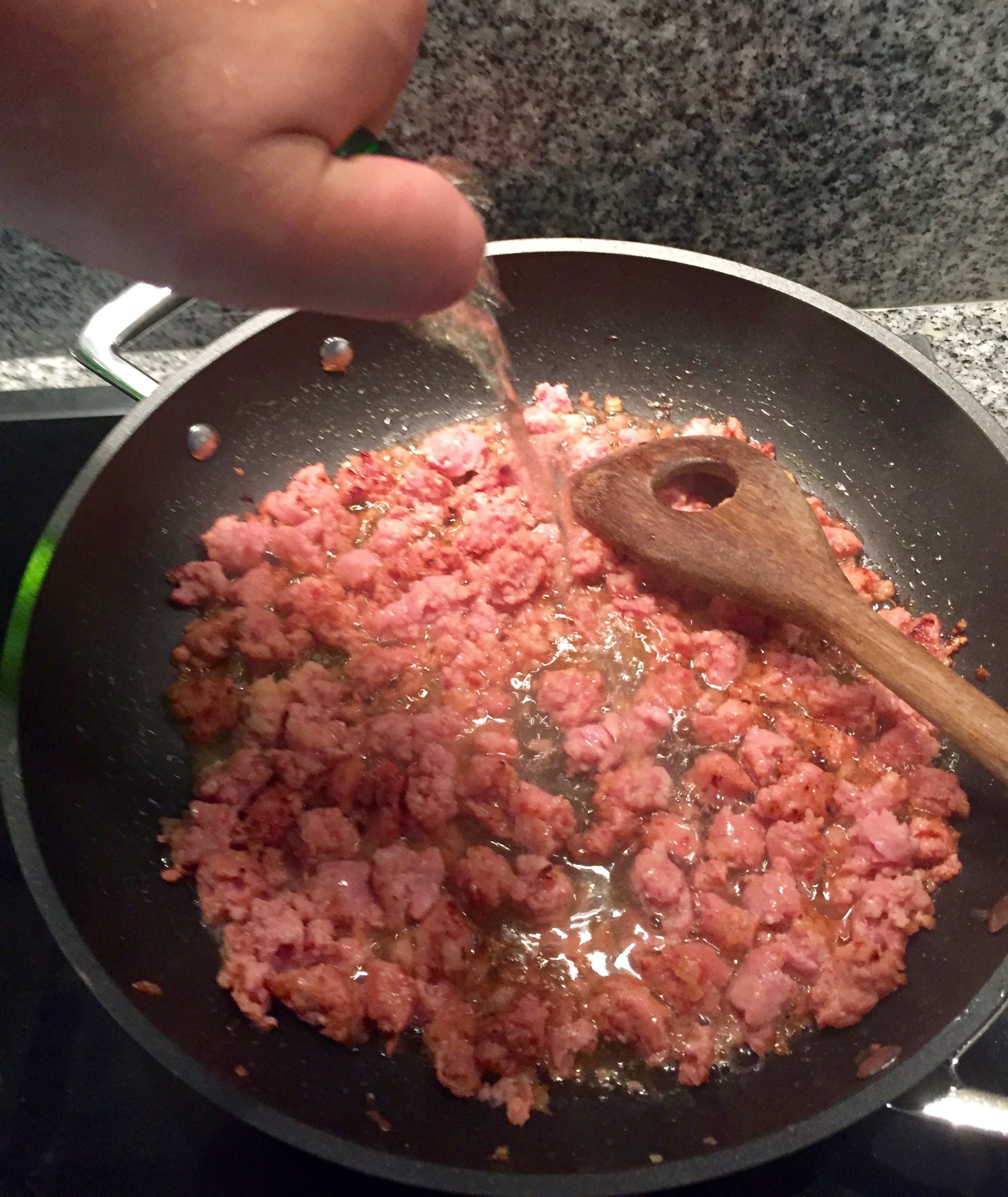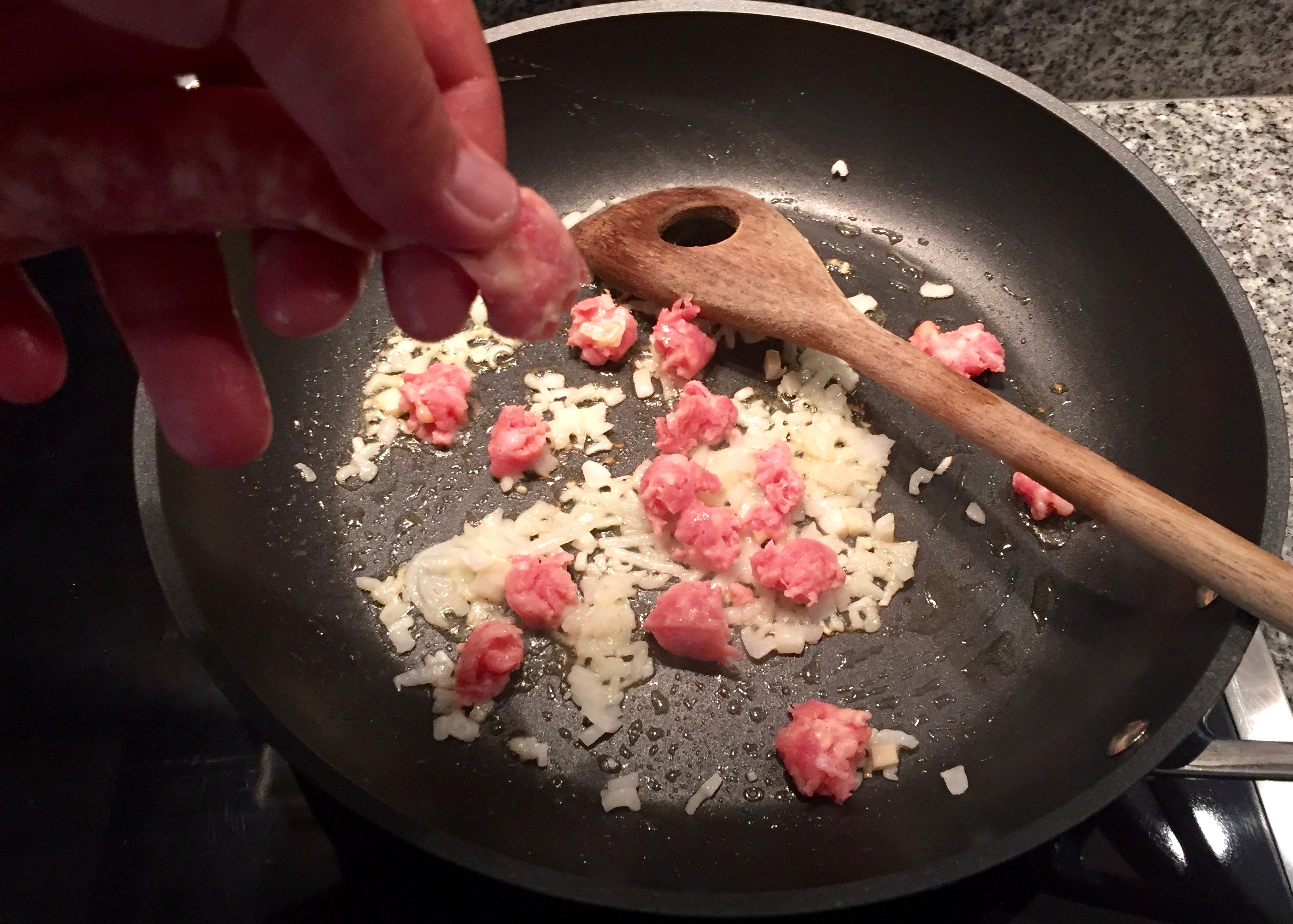 Aggiungere la luganighetta a tocchetti “spremendola” fuori dal budello.