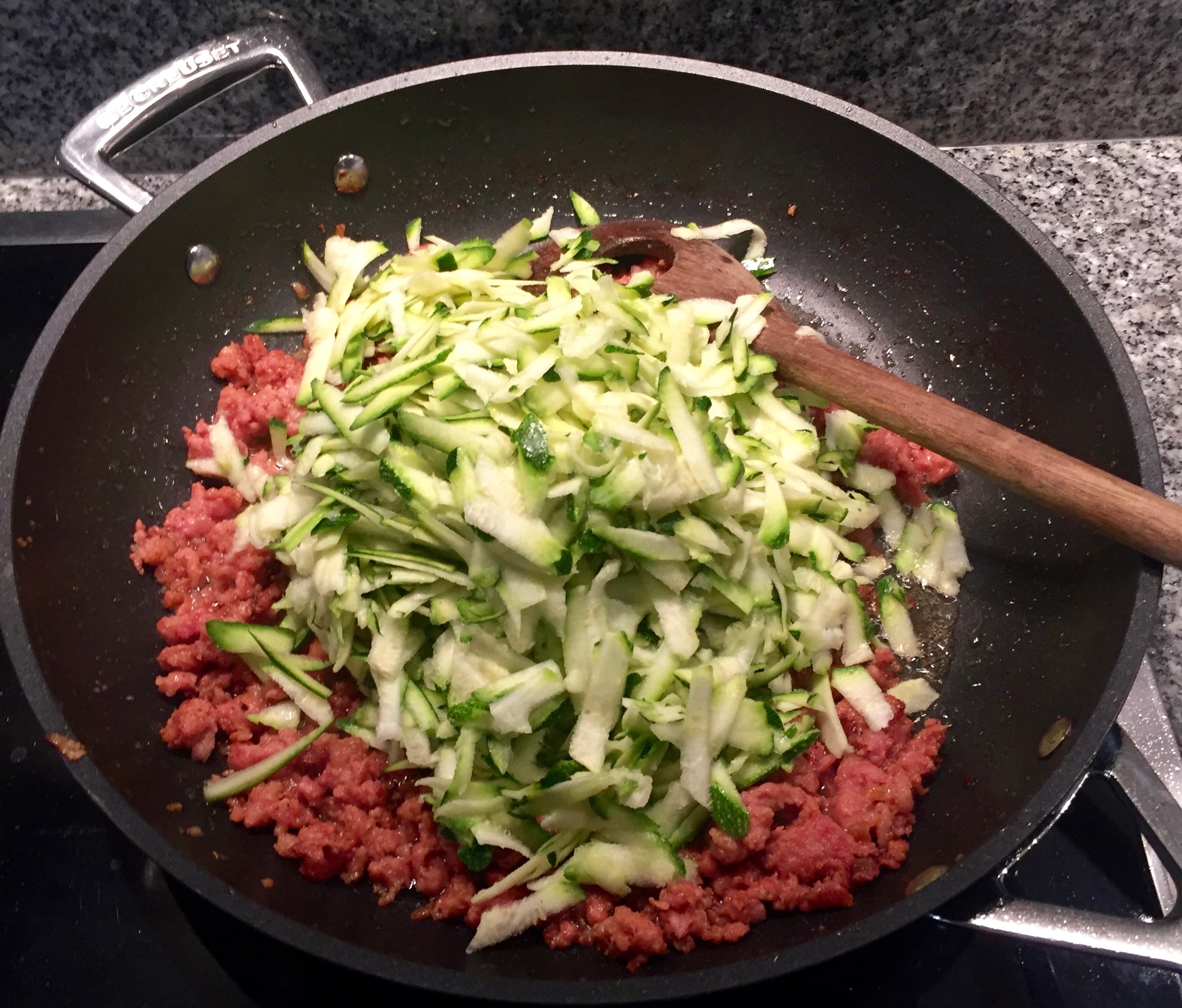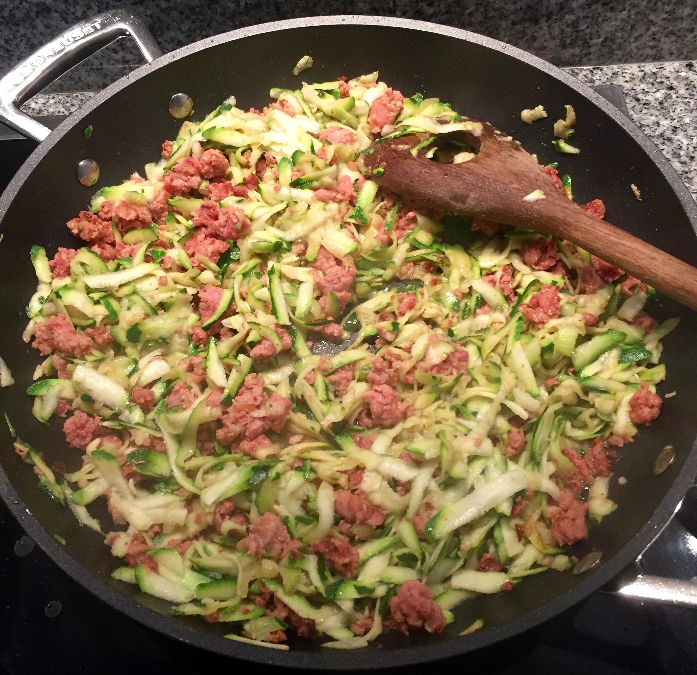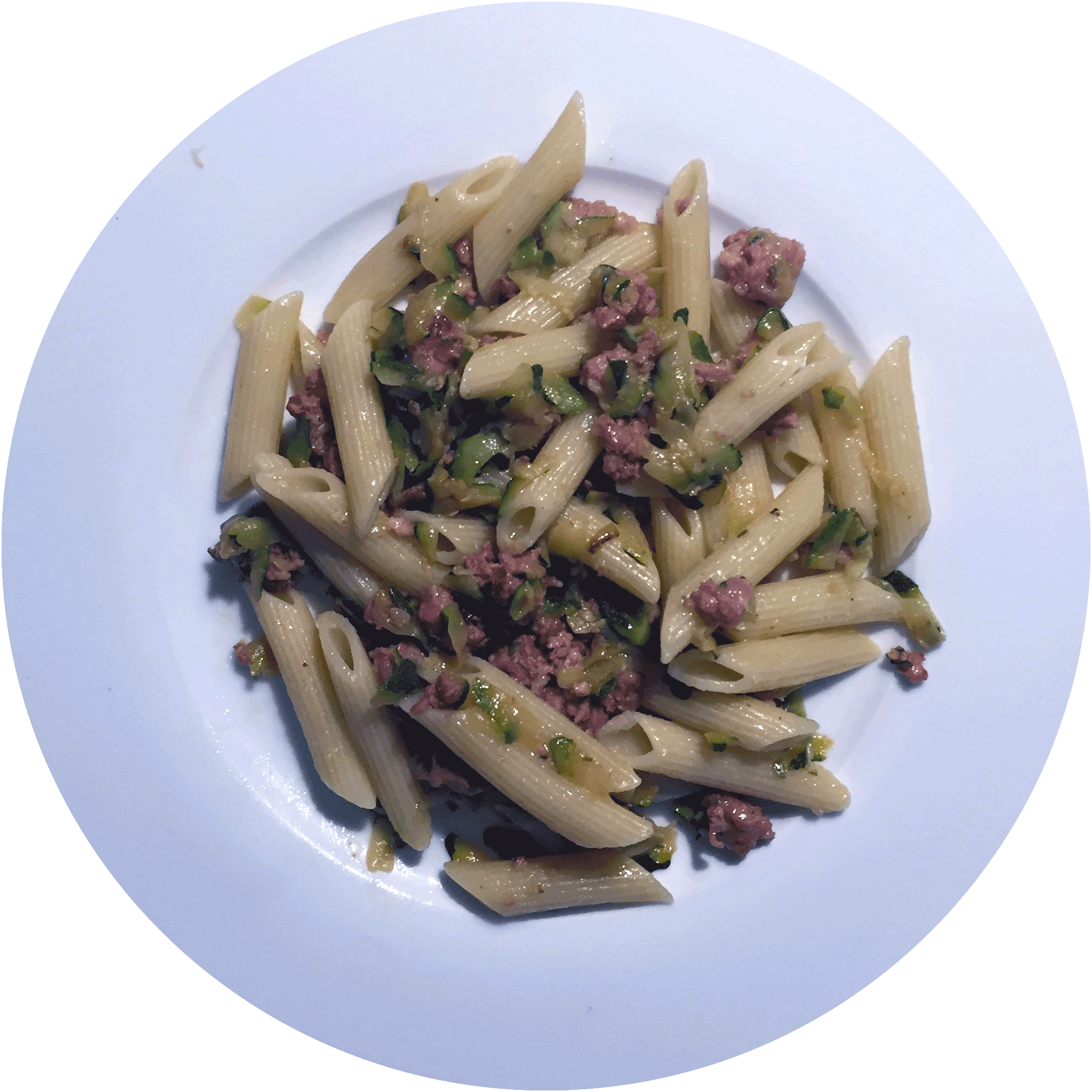 Scolare la pasta una volta raggiungo il grado di cottura desiderato e amalgamare bene con il ragoût di zucchine e luganighetta.