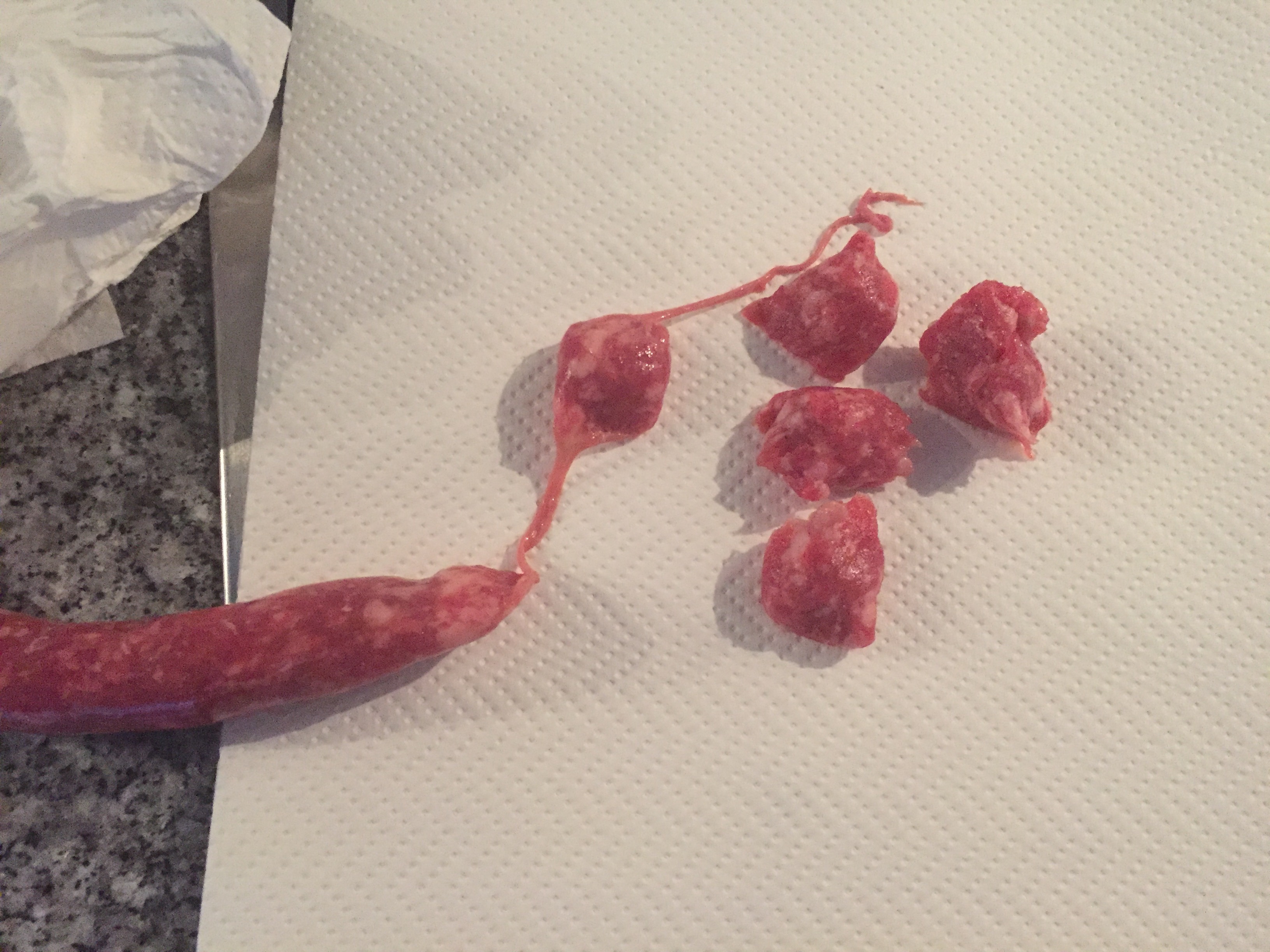 Spremere la luganighetta all’esterno del budello creando piccole palline di un centimetro circa.