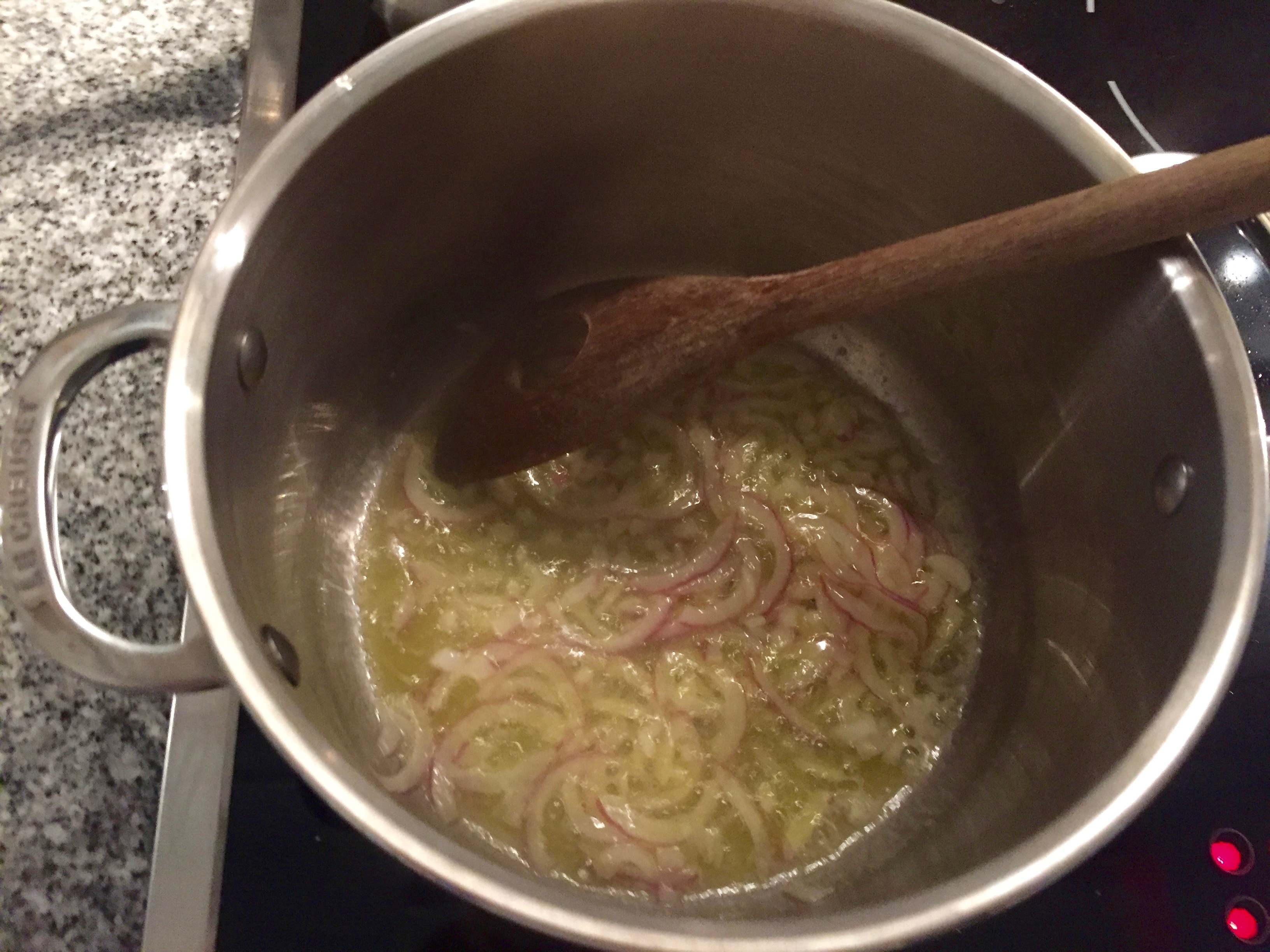 Aggiungere la cipolla, rimestare e cuocere fino a che diventi traslucida ma senza farla rosolare.
