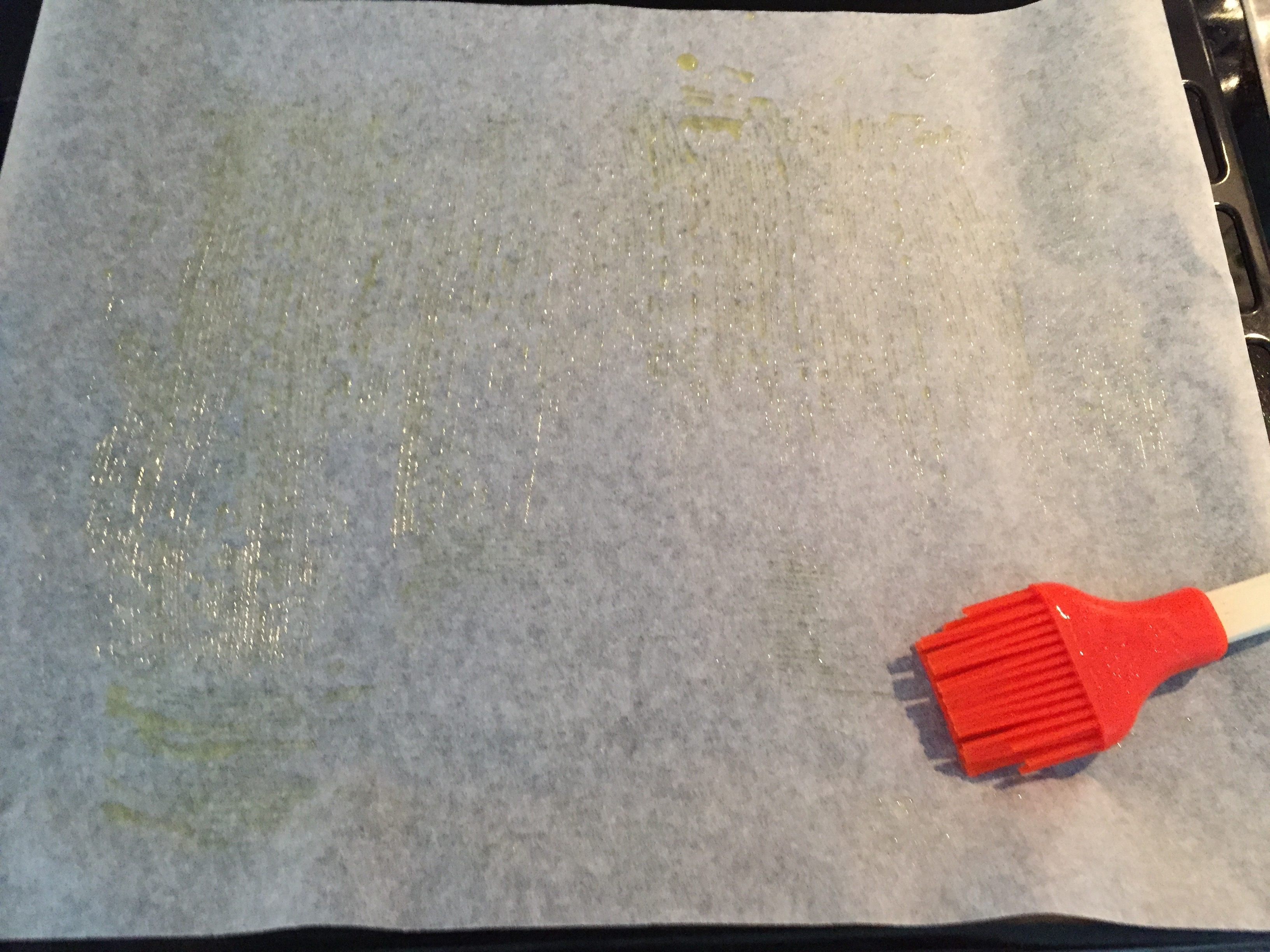 Disponete un foglio di carta da forno su una teglia e spennellatelo con olio d’oliva.