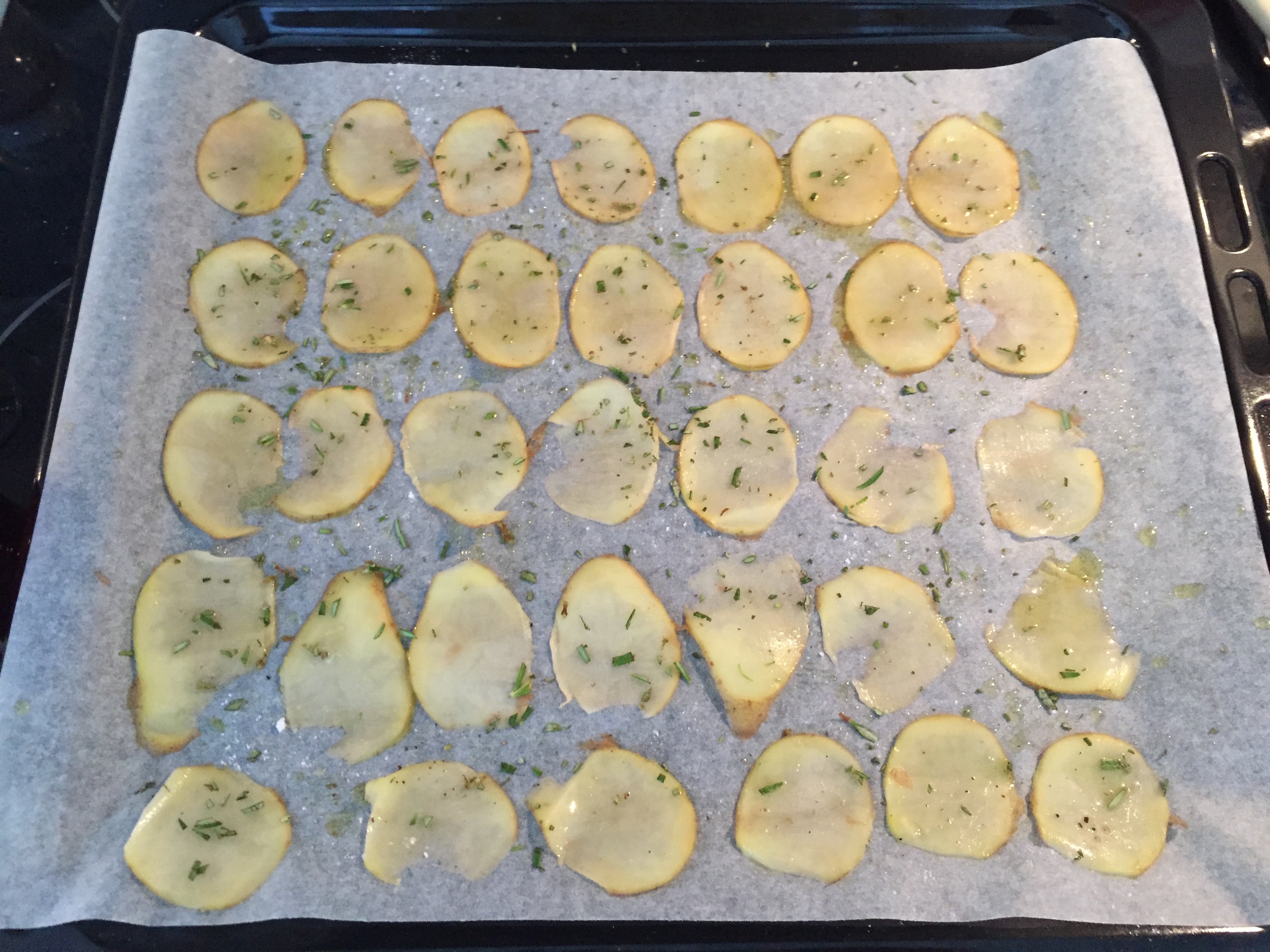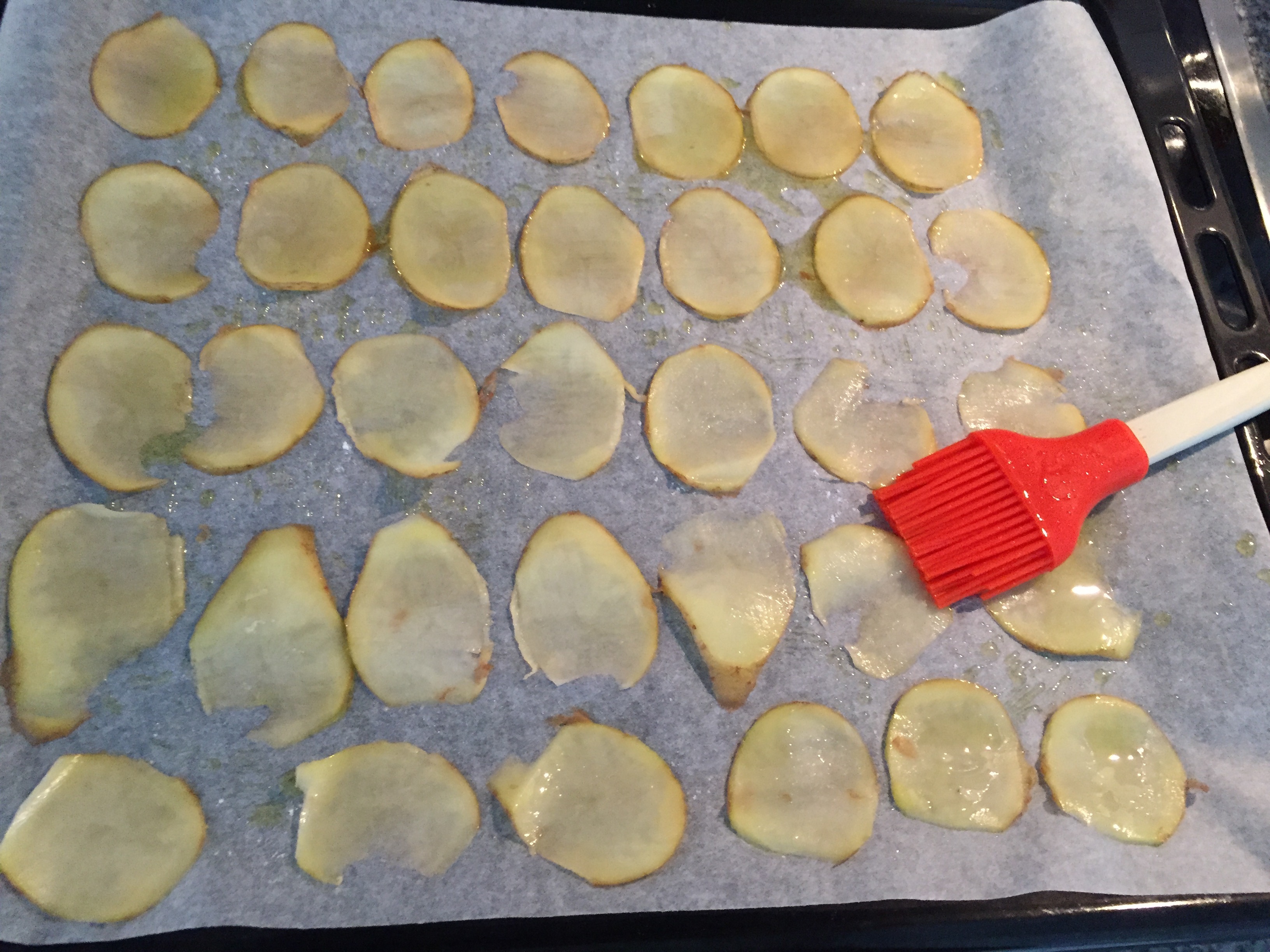 Disponete le chips senza sovrapporle e spennellatele nuovamente con olio d’oliva.