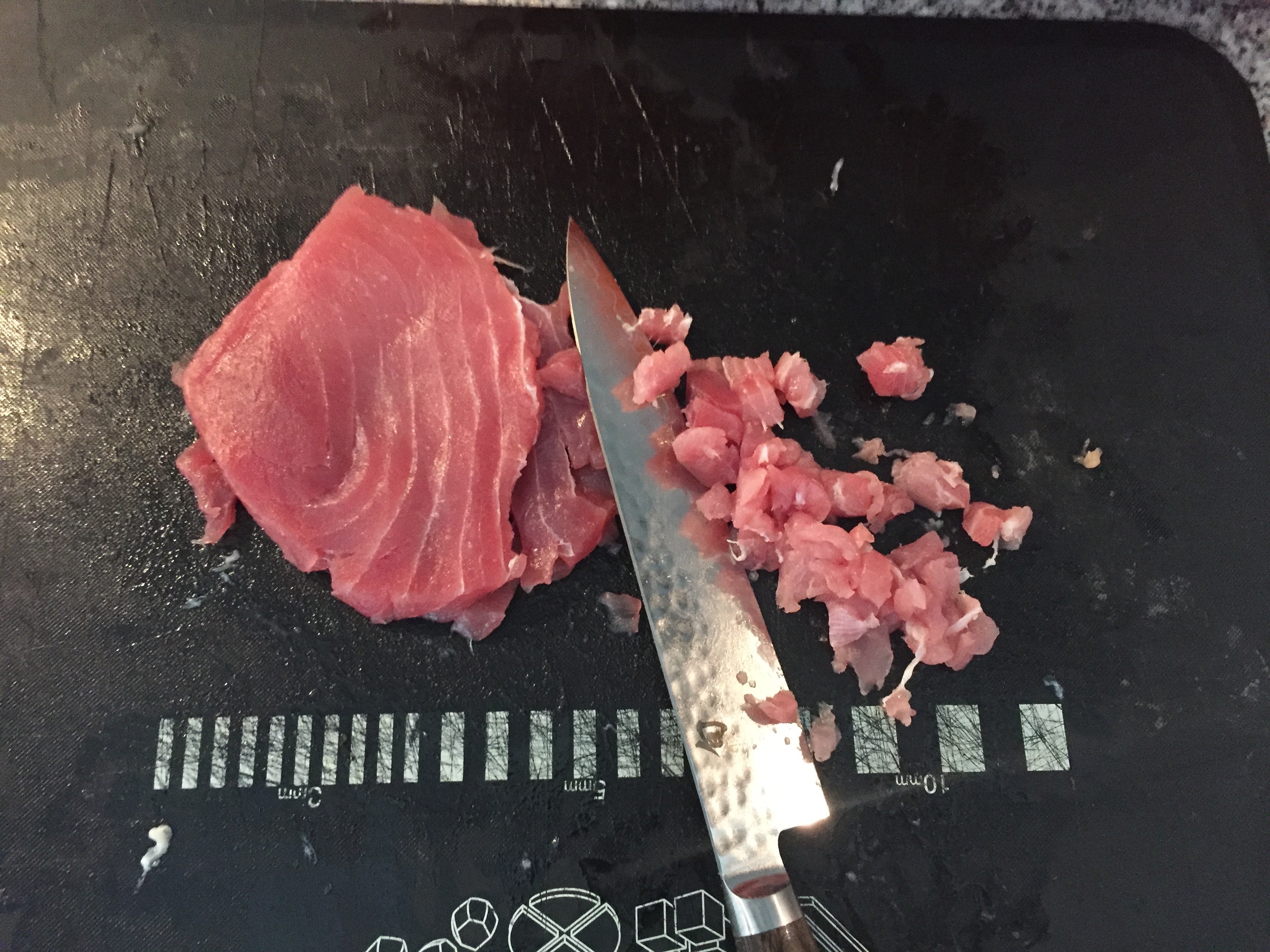 Tagliare il tono a cubetti di 0.5 cm circa.