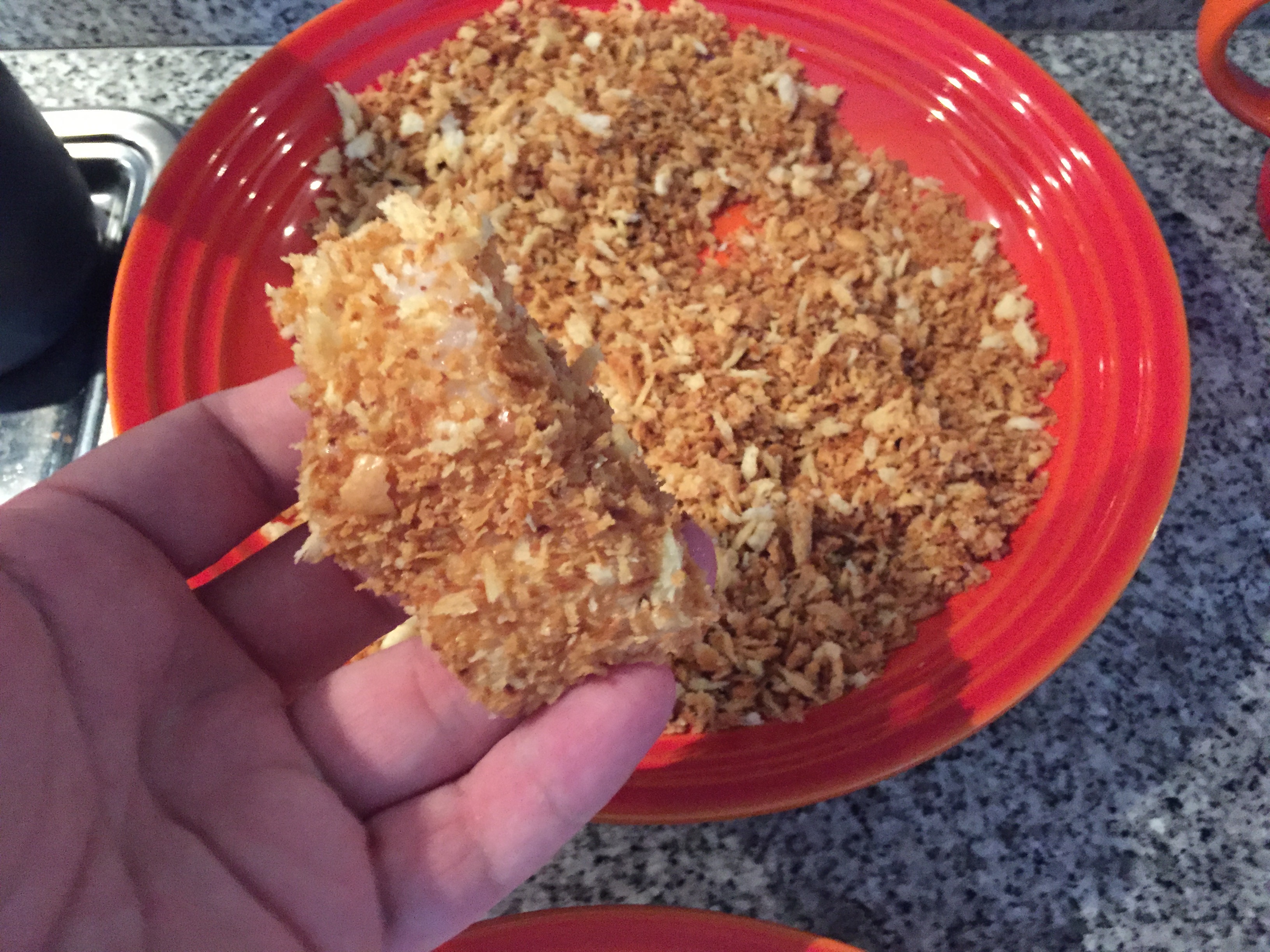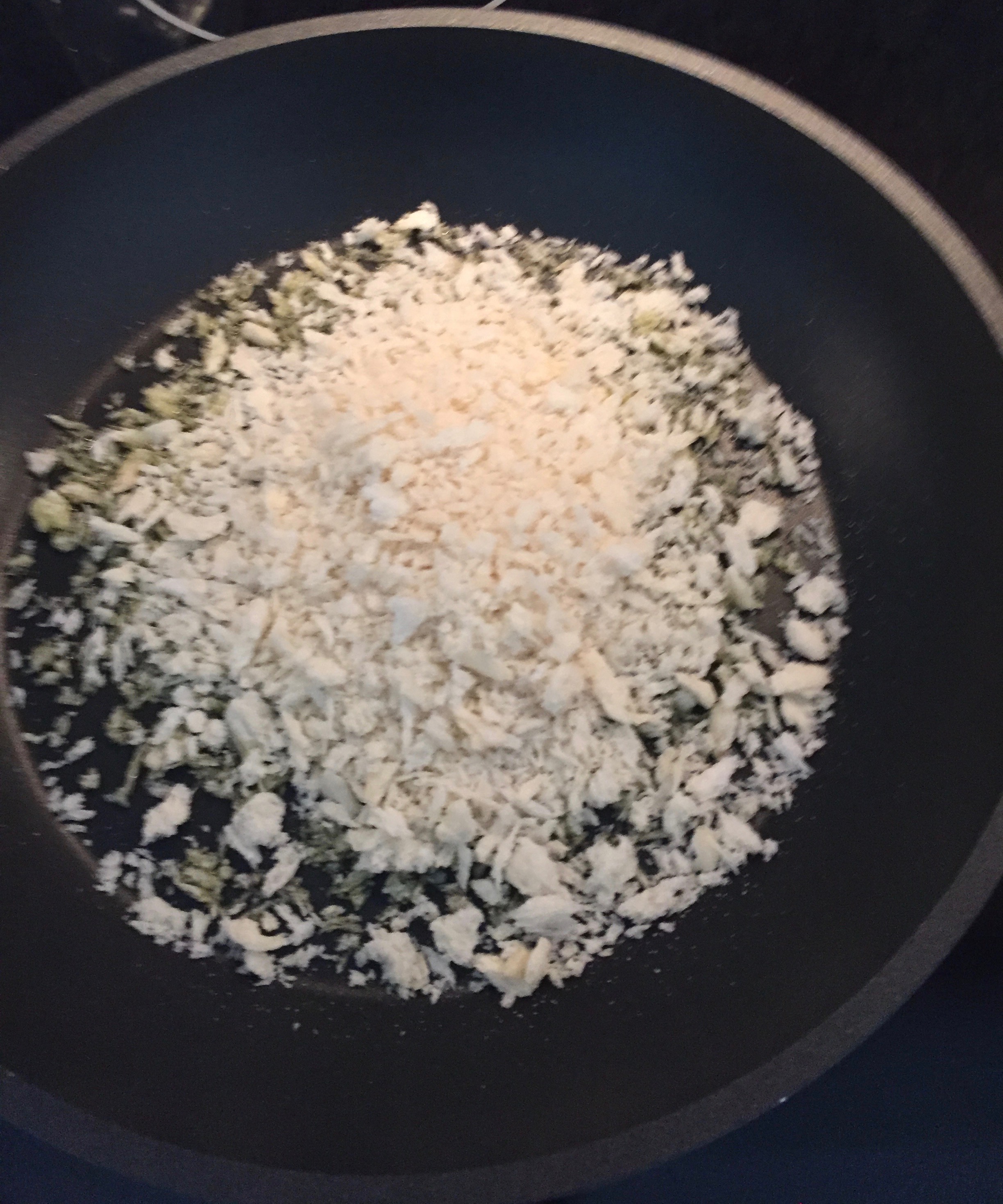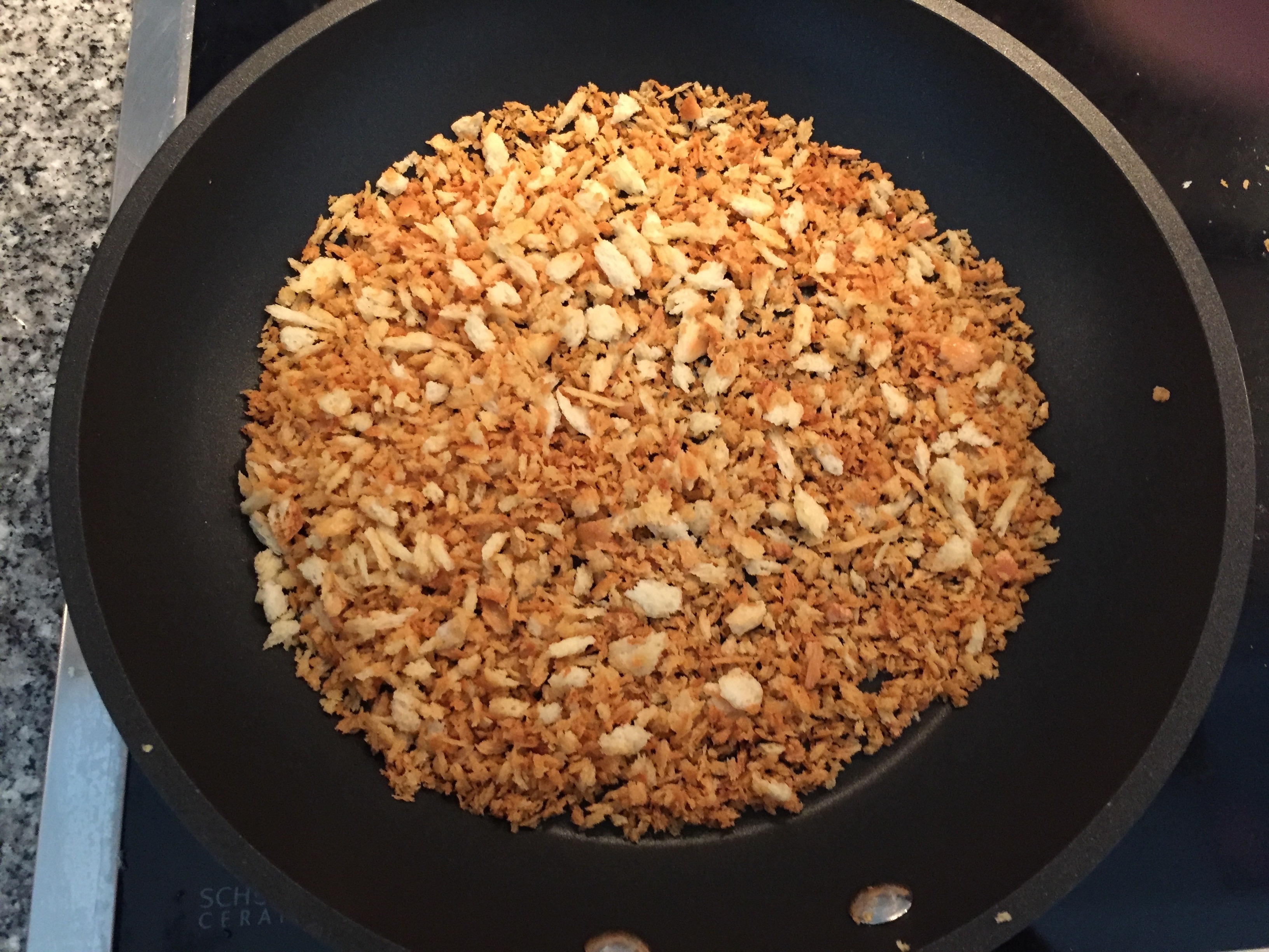 Rimestare delicataemtne e tostare il panko. Appena diventerà dorato (per intenderci una volta che raggiunge il colore finale che dovrebbe avere la panatura del fish and chips) togliere la padella dal fuoco, evitando di bruciarlo.