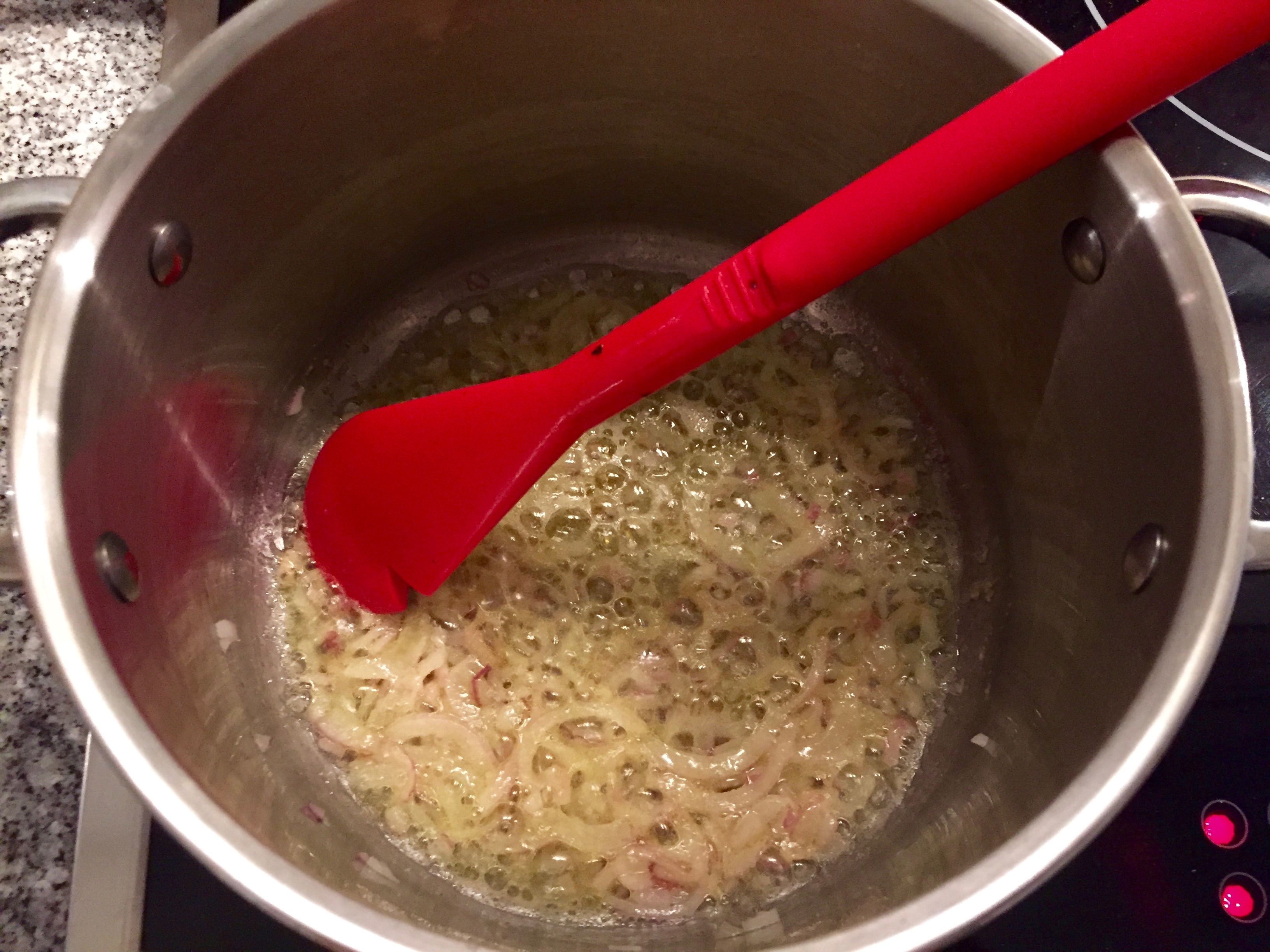 In una pentola sciogliere una noce di burro, aggiungere la cipolla e cuocerla rimestando fino a farla diventare traslucida ma senza rosolarla.