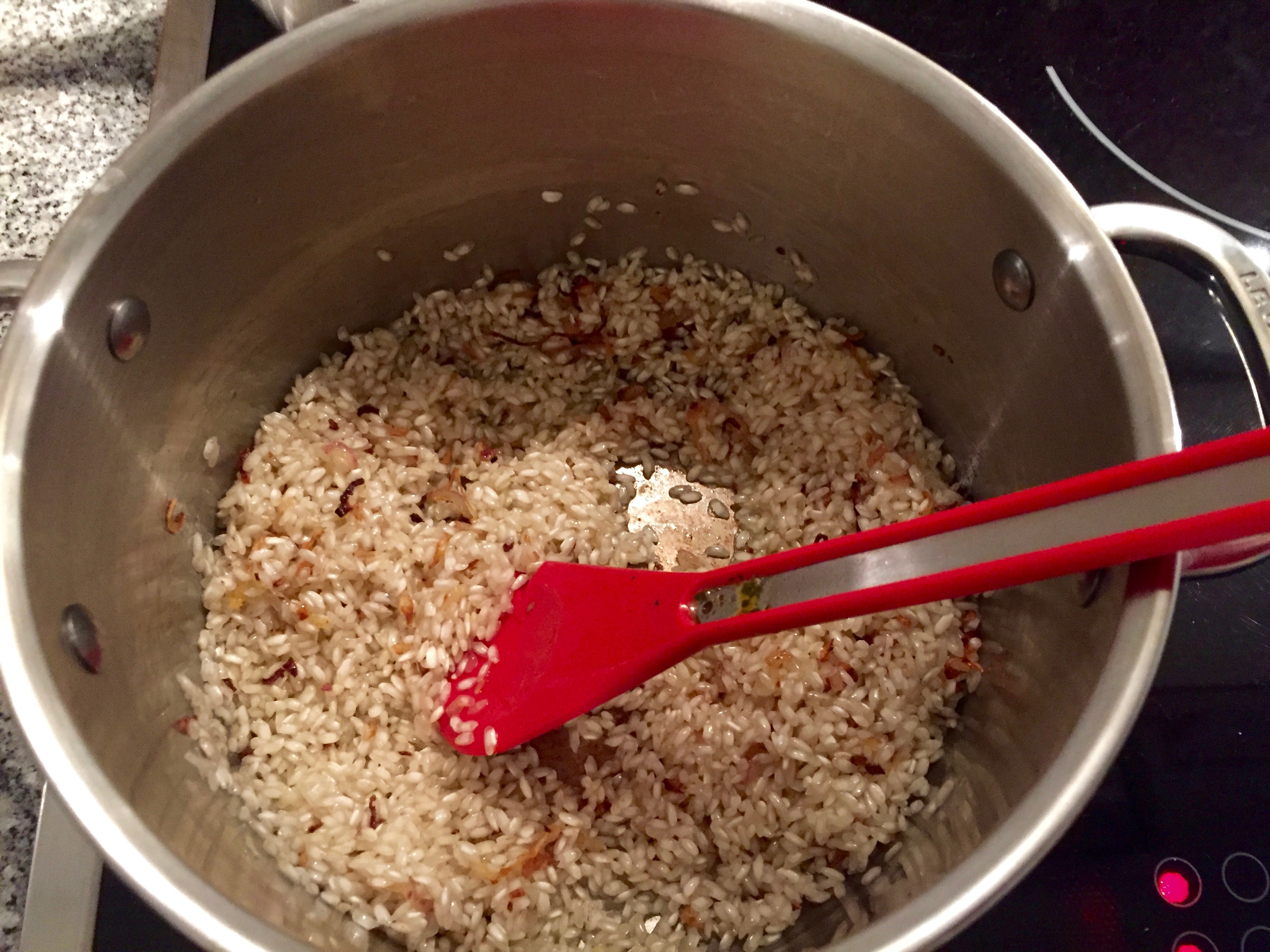 Aggiungere il riso e tostarlo, rimestando continuamente.