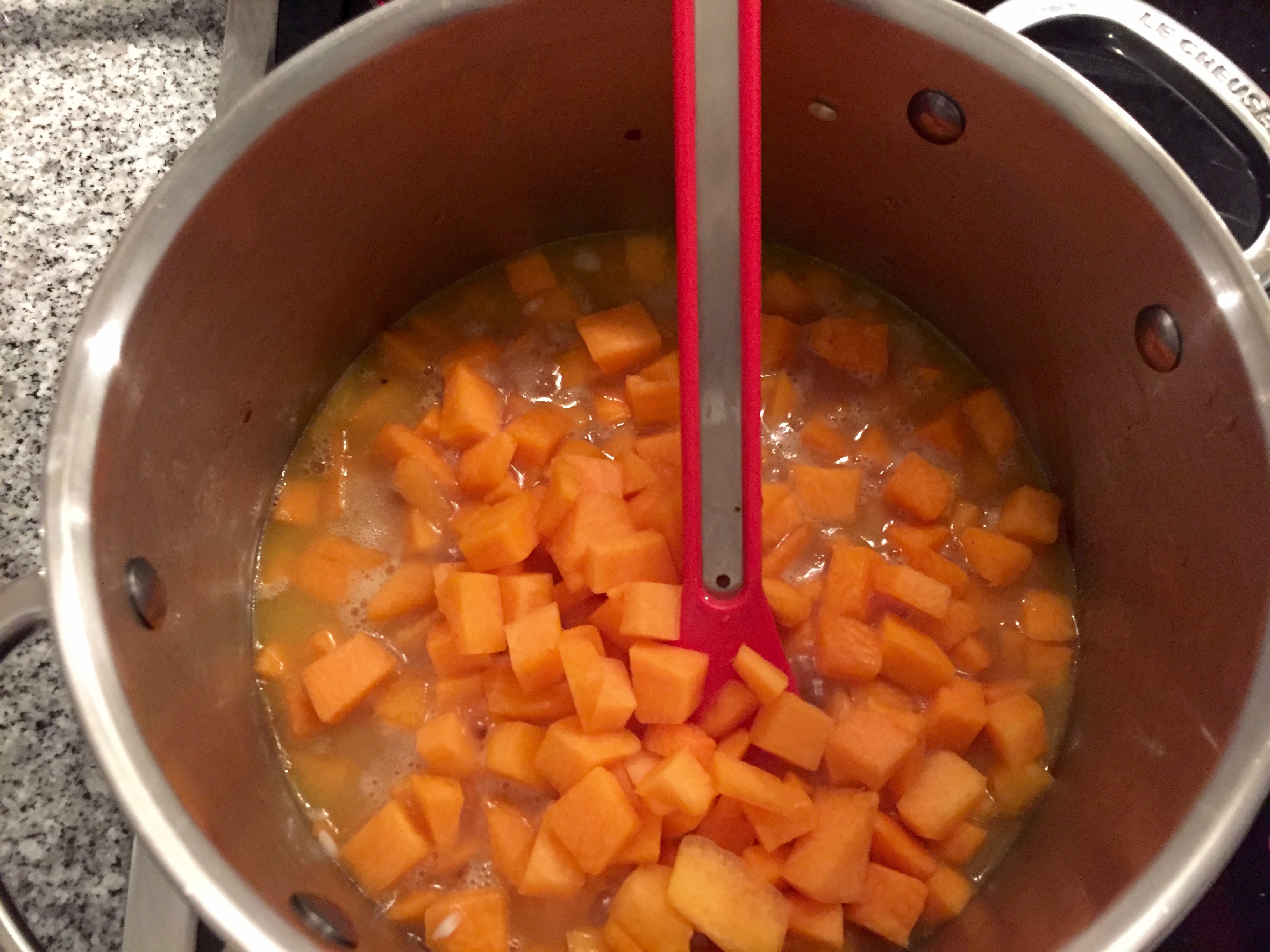 Rimestare sino a far evaporare completamente l’alcool; poi aggiungere la zucca ed amalgamare il tutto.