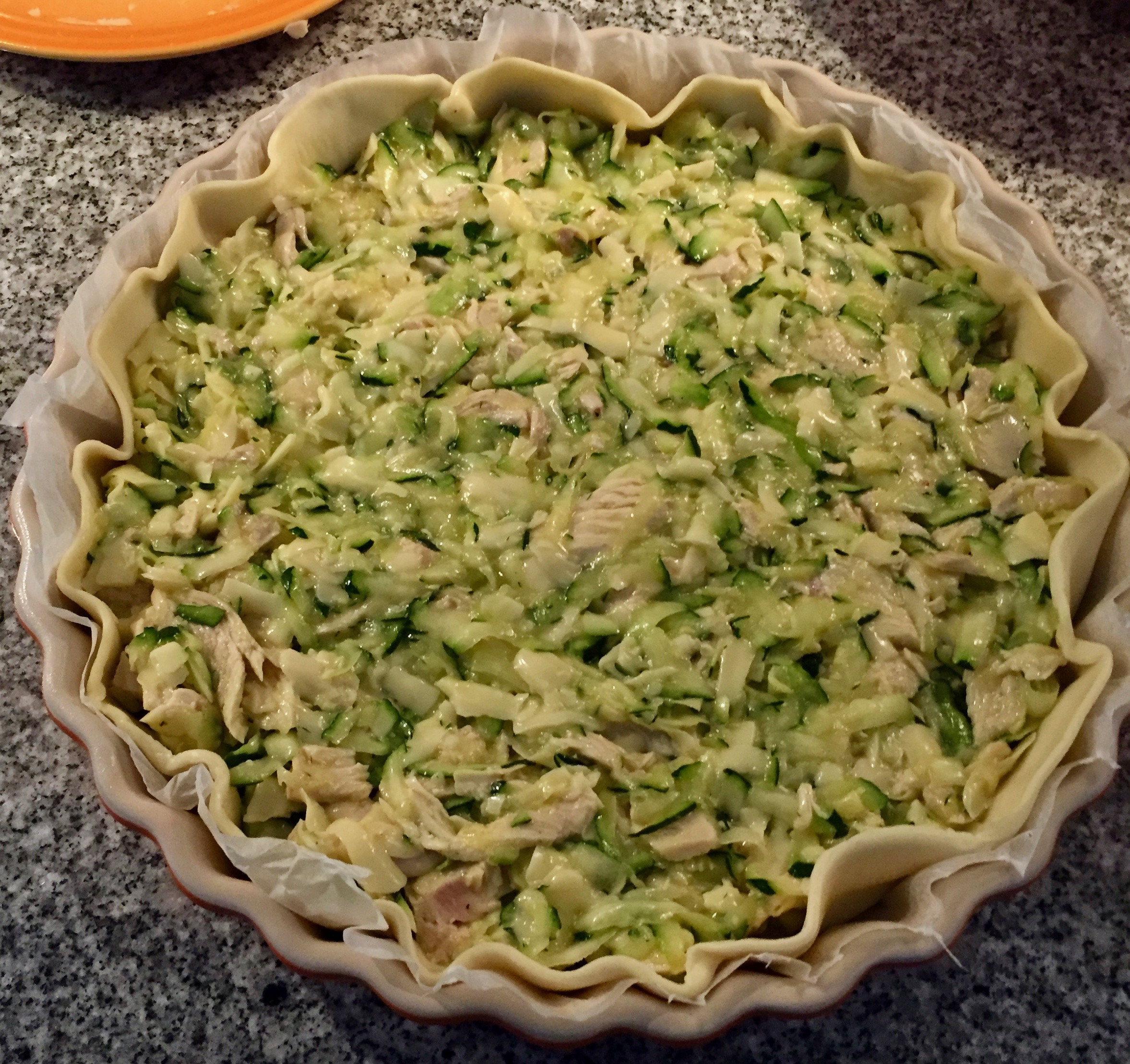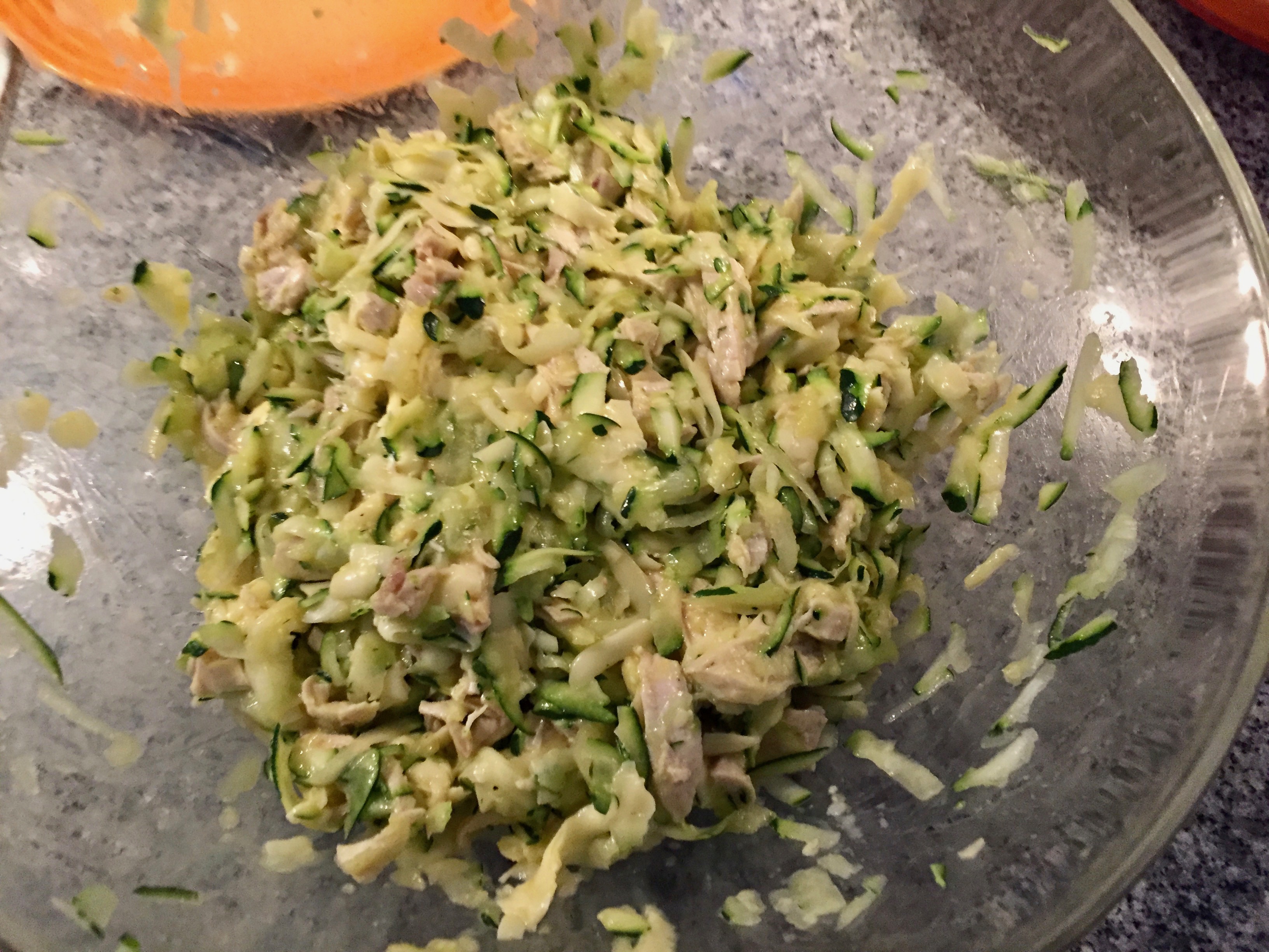 In una bacinella mettere il pollo sfilacciato, le zucchine avendo avuto cura di strizzarle precedentemente (con le mani o in un panno di cotone) in modo da fargli perdere più acqua possibile e il formaggio.
