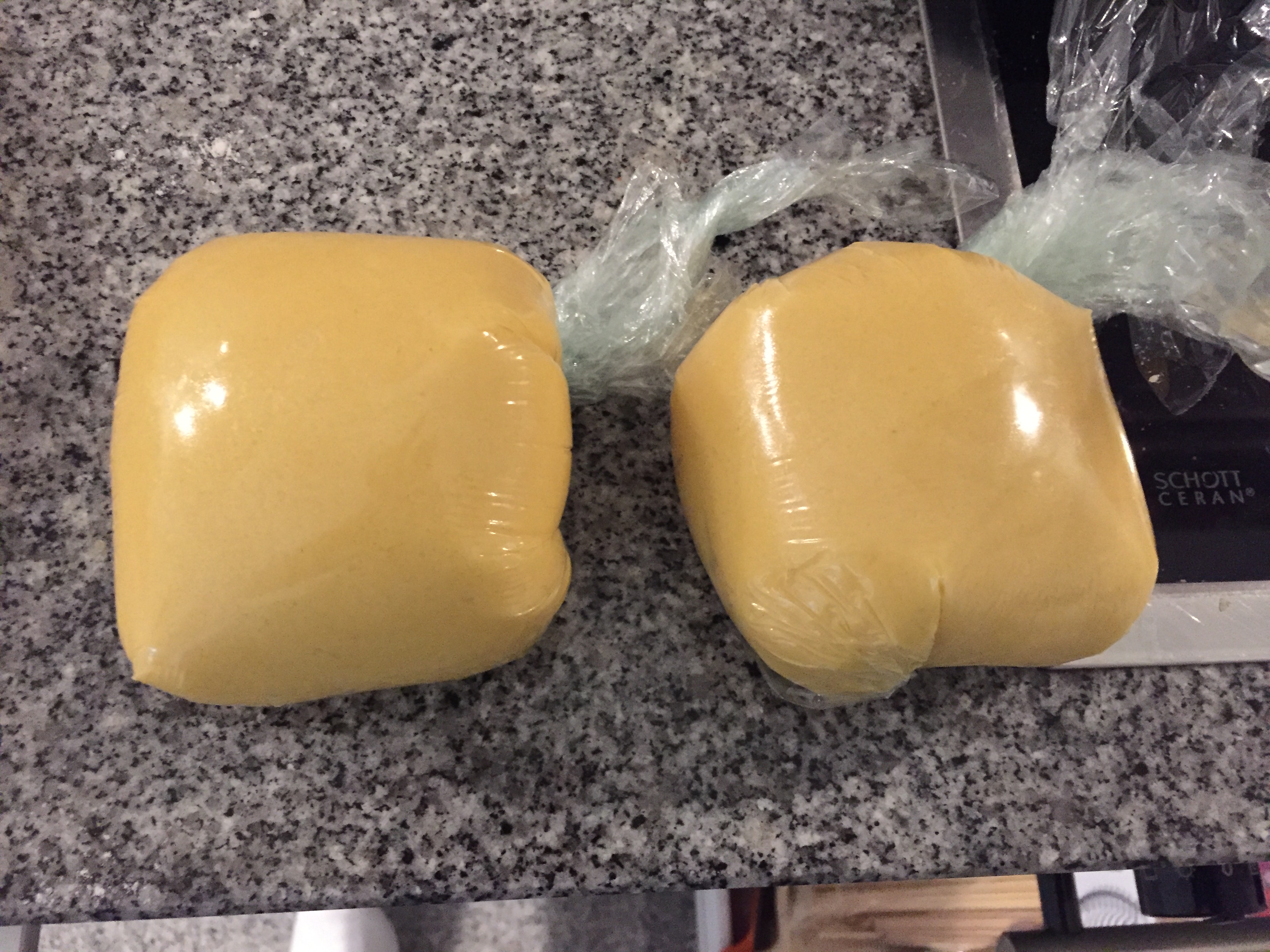 Dividere l’impasto in due e avvolgerlo nella pellicola trasparente.