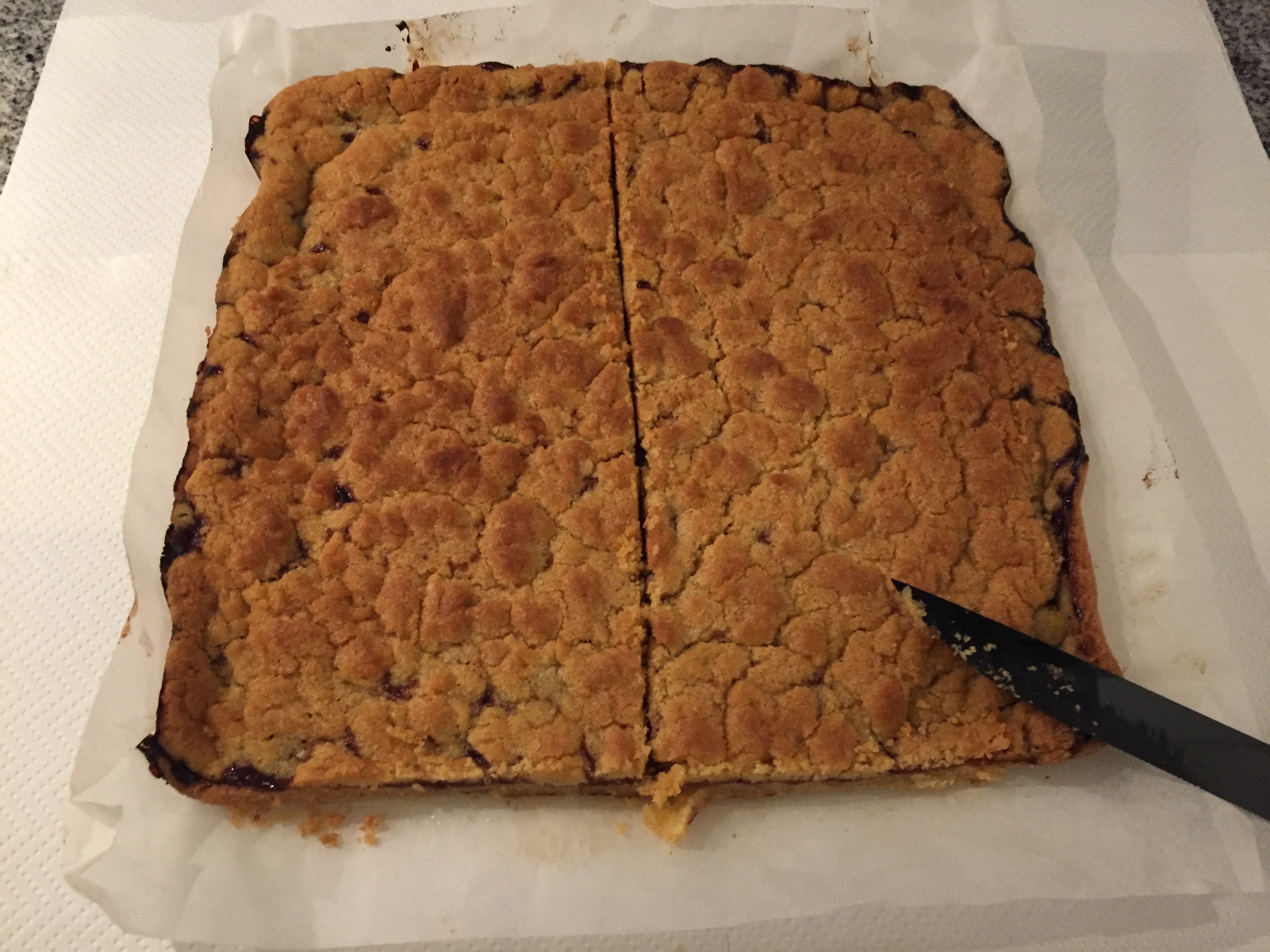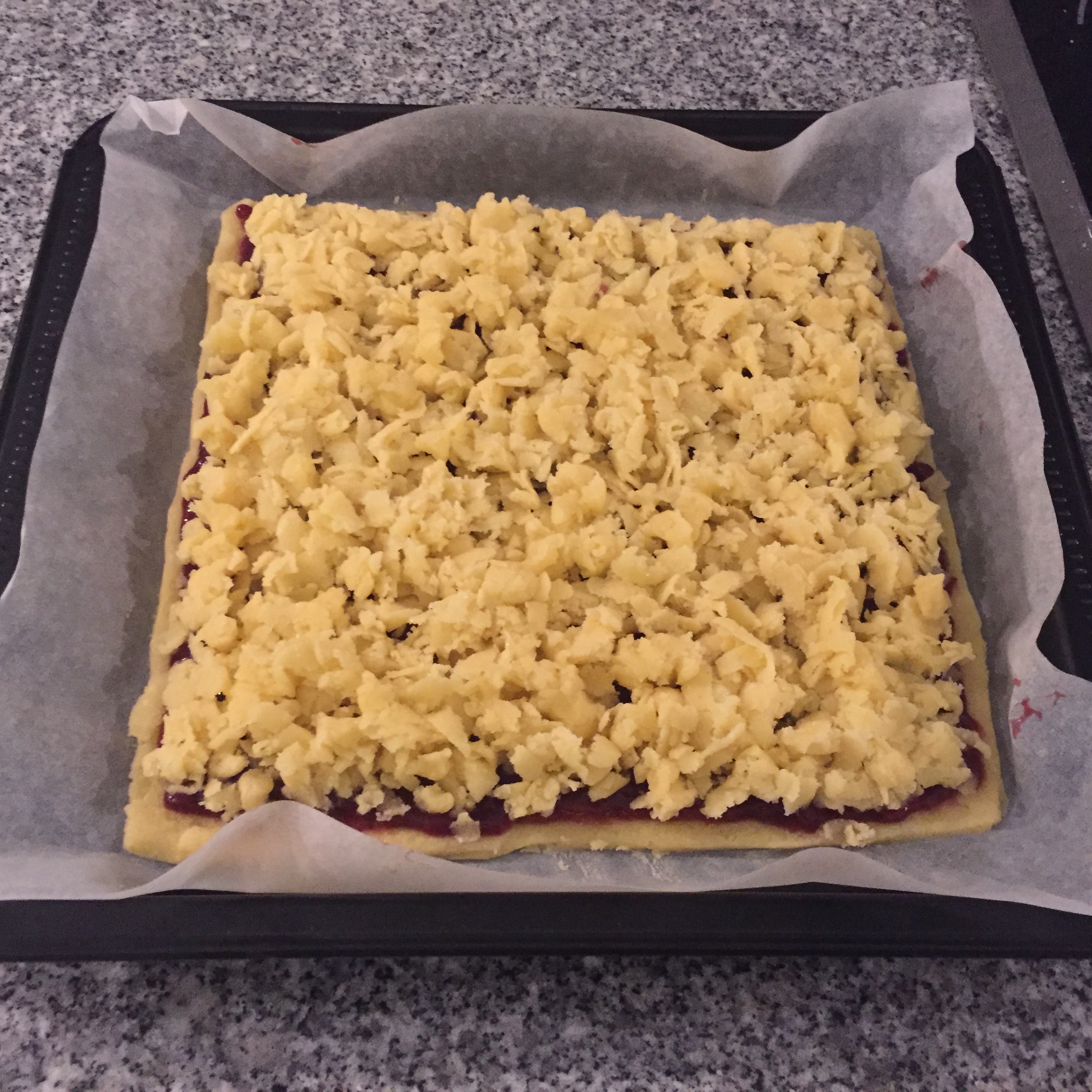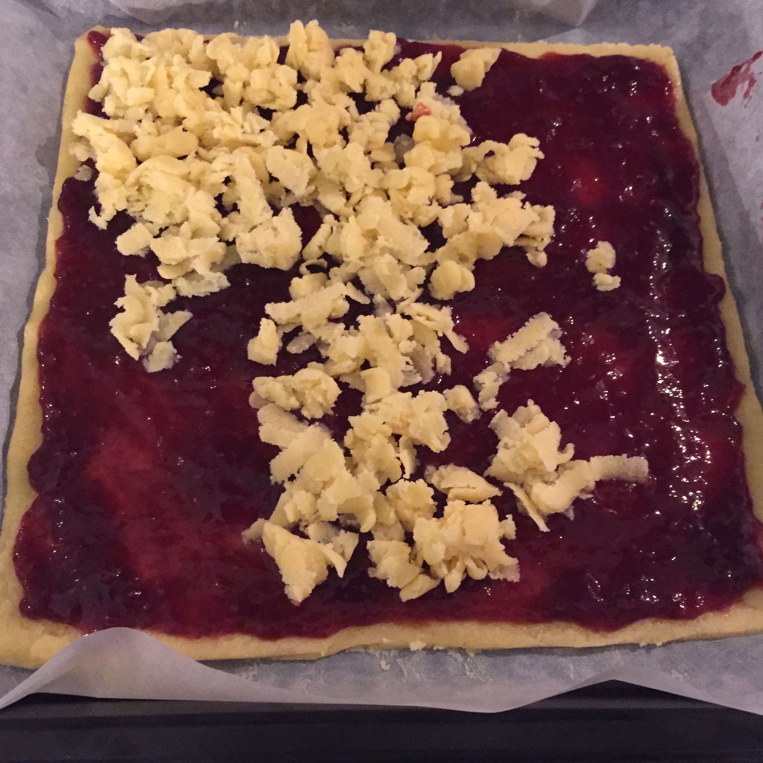 Con una grattugia; grattugiare il panetto di pasta che avevano riposto in congelatore sulla superficie, in maniera uniforme, ricoprendo la marmellata.