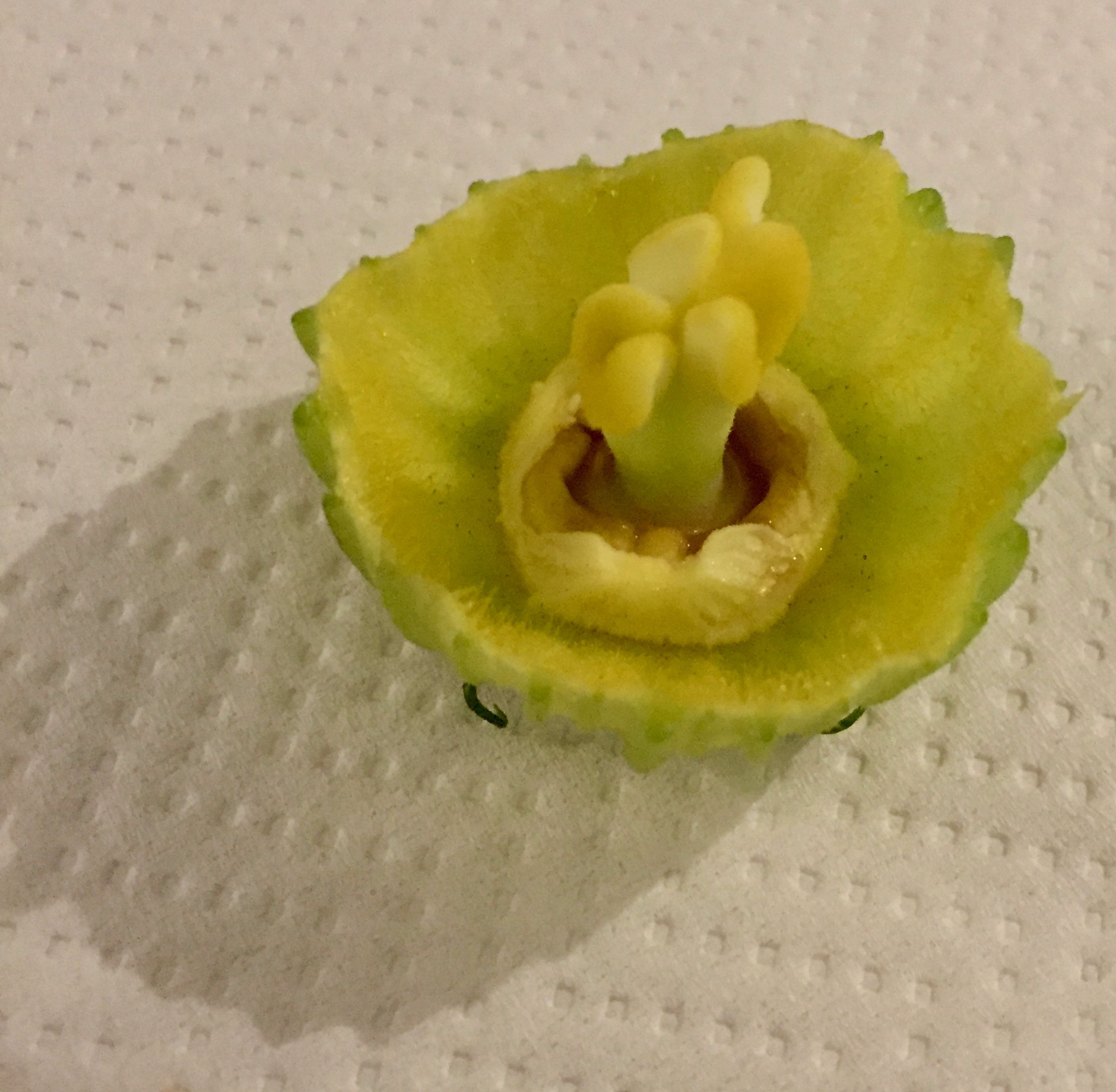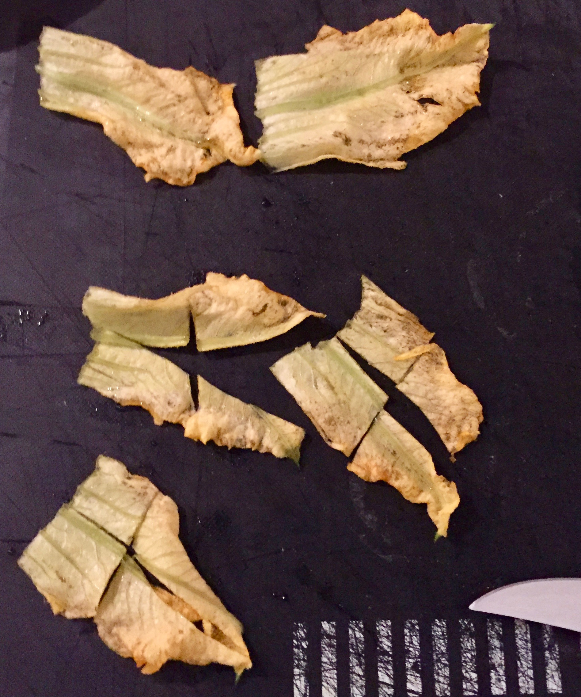 Tagliare i fiori di zucchina alla base in modo da eliminare il pistillo e la parte inferiore più dura, ottenendo una specie di “corona” (vedi fotografie).