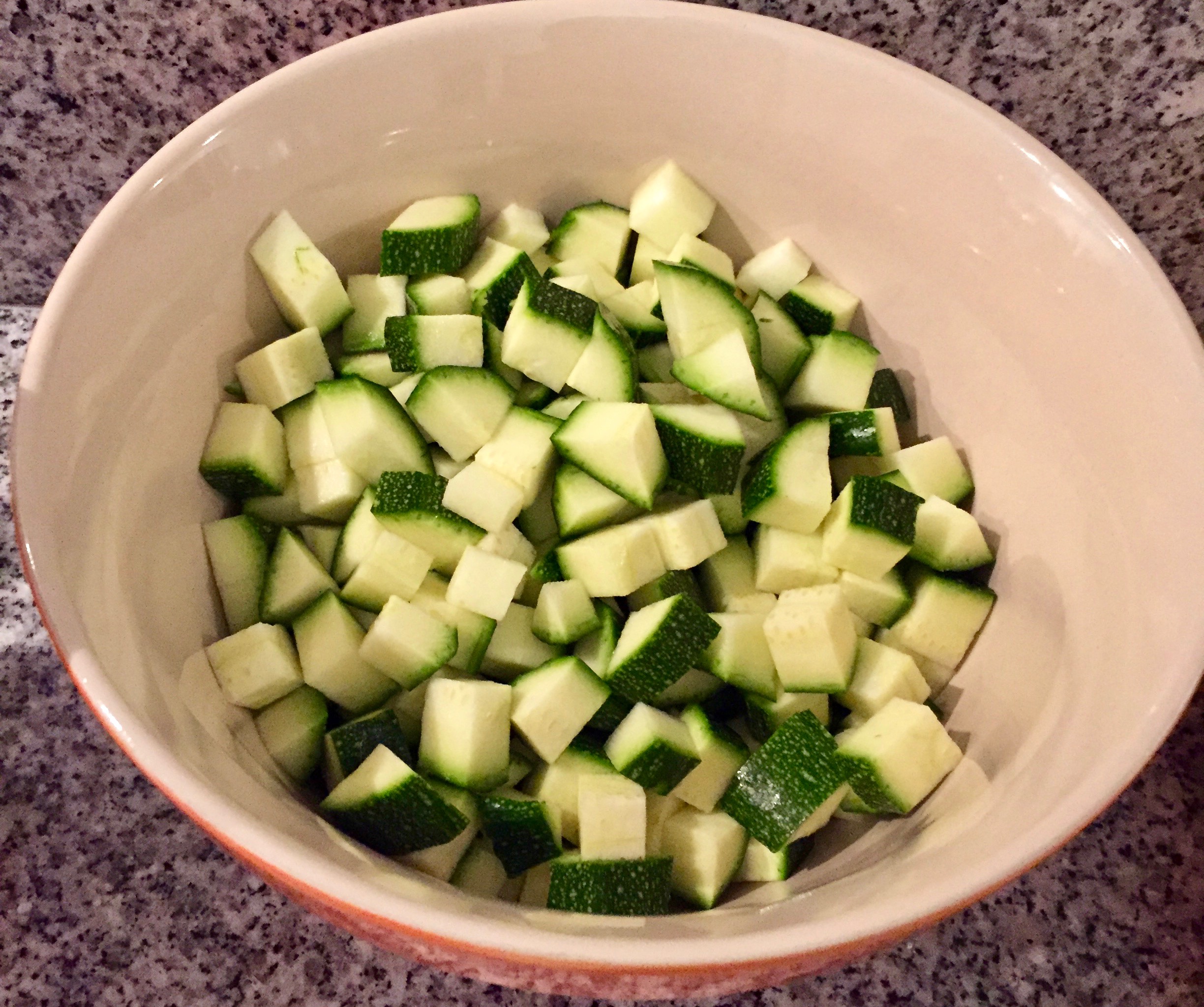 Lavare le zucchine e tagliarle a cubetti di circa mezzo centimetro per lato.