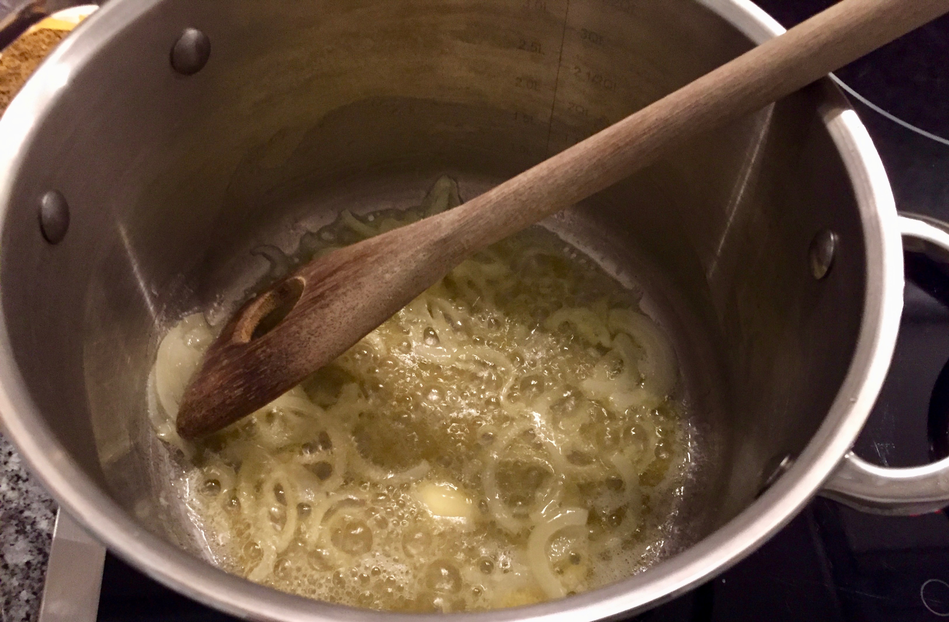 In una pentola mettere un’abbondante noce di burro e farvi imbiondire la cipolla fino a che non diventa traslucida.