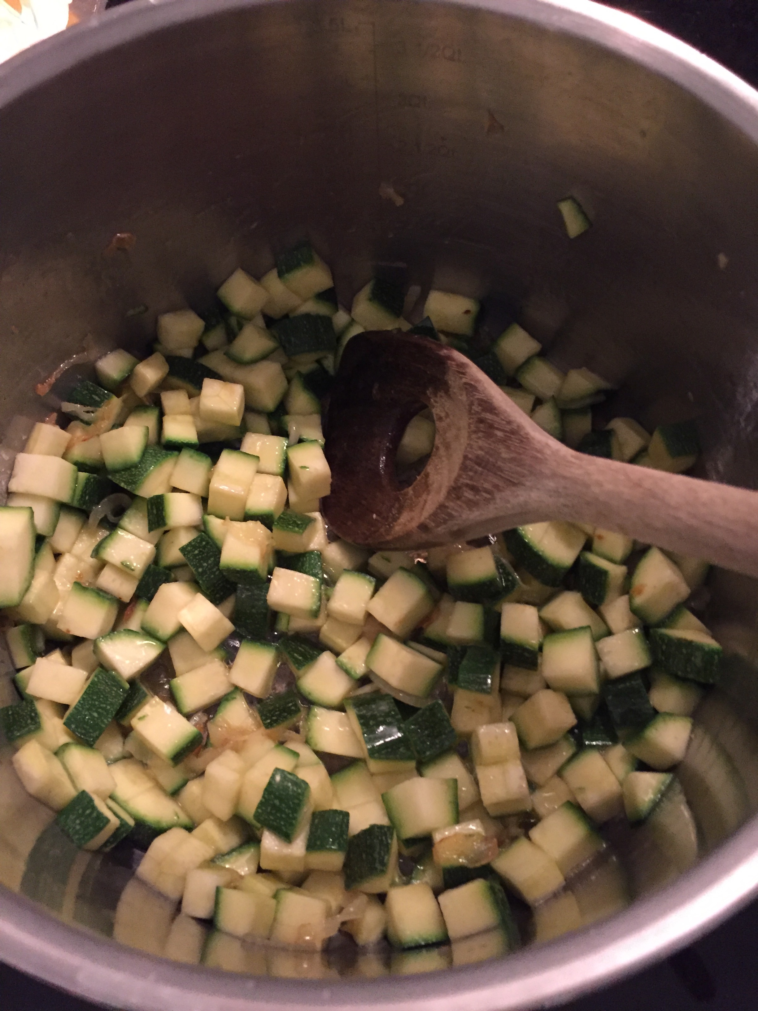 Aggiungere le zucchine, un filo d’olio d’oliva e mescolare per un minuto o due.