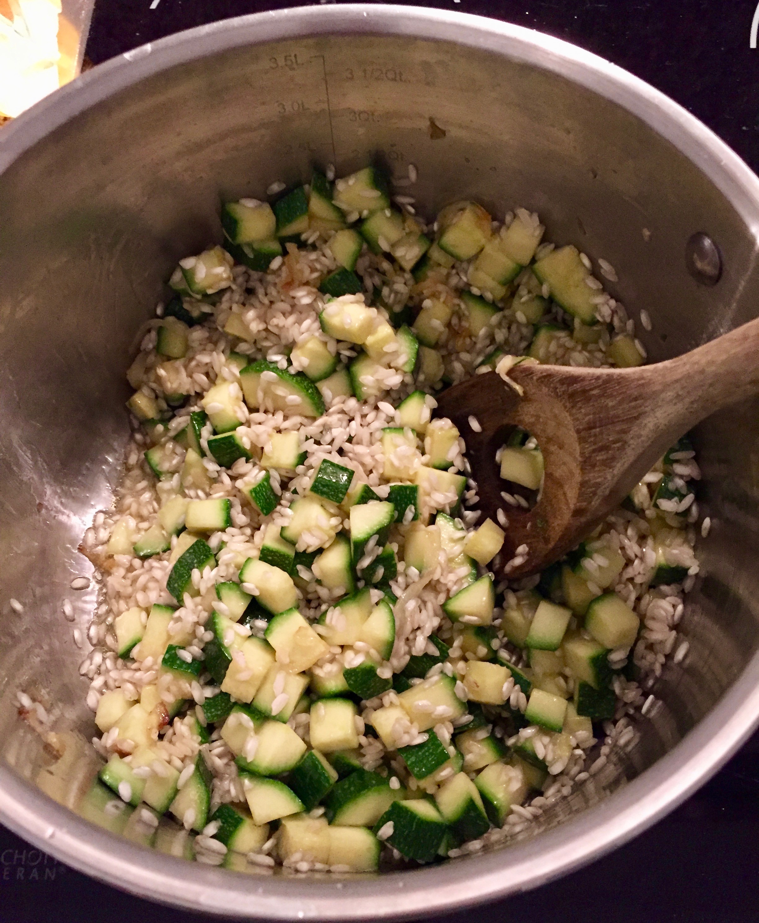 Fatto quest’ulteriore passo avanti ho ragionato poi su come completare la ricetta; ritenendo i fiori di zucchina molto delicati ho deciso quindi di utilizzare del prosecco (invece del solito vino-bianco-secco) per sfumare il riso e di mantecare con del mascarpone.
