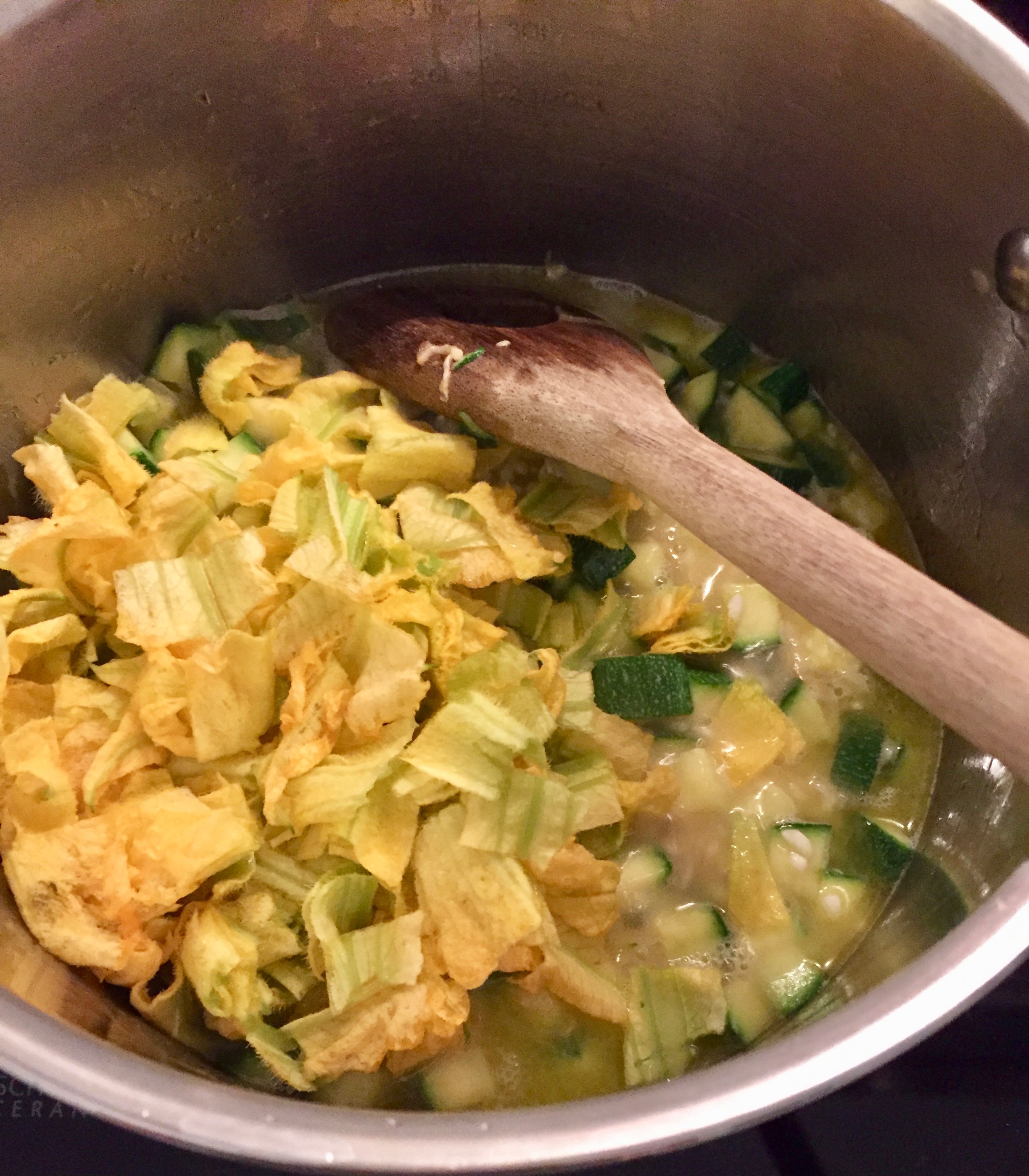 A questo punto aggiungere un mestolo di brodo e i fiori di zucchina.