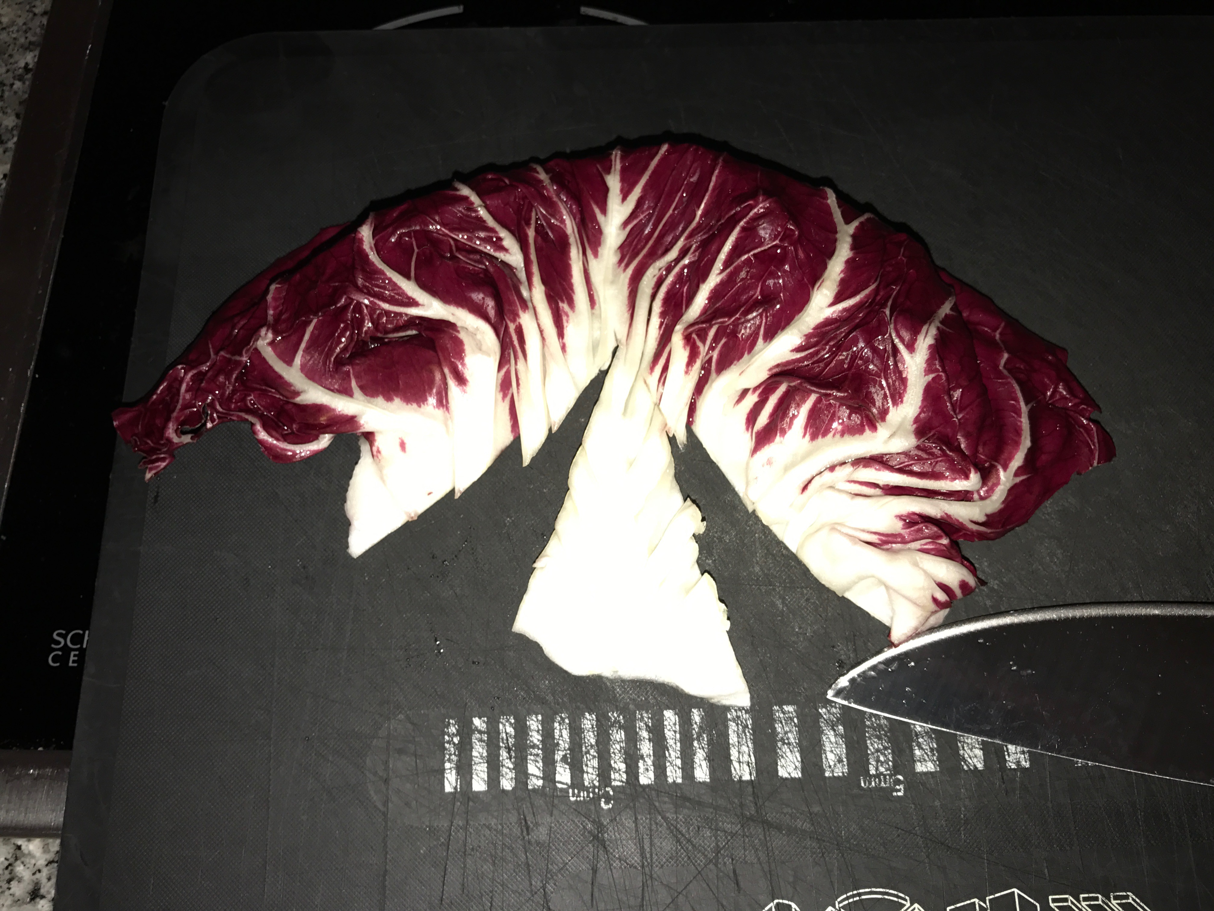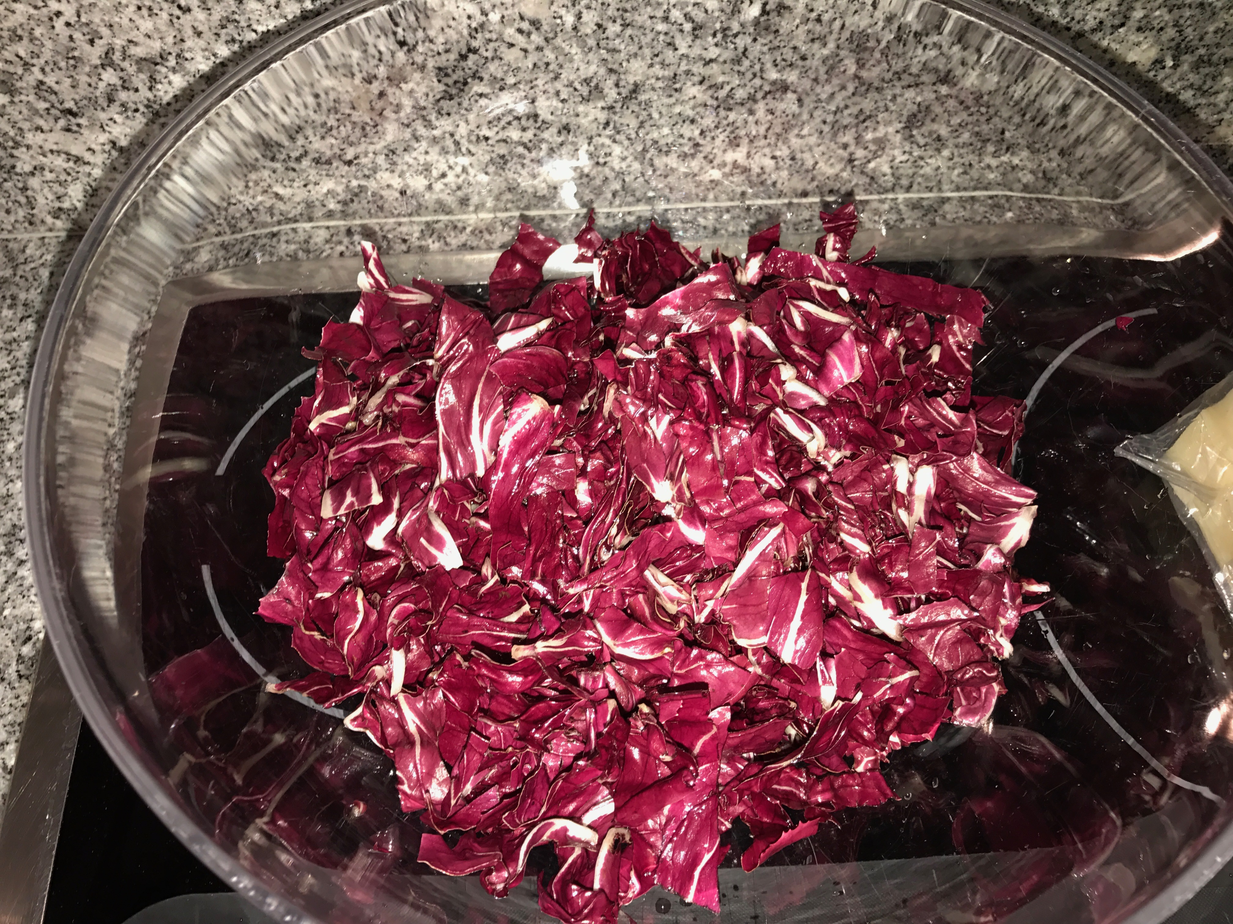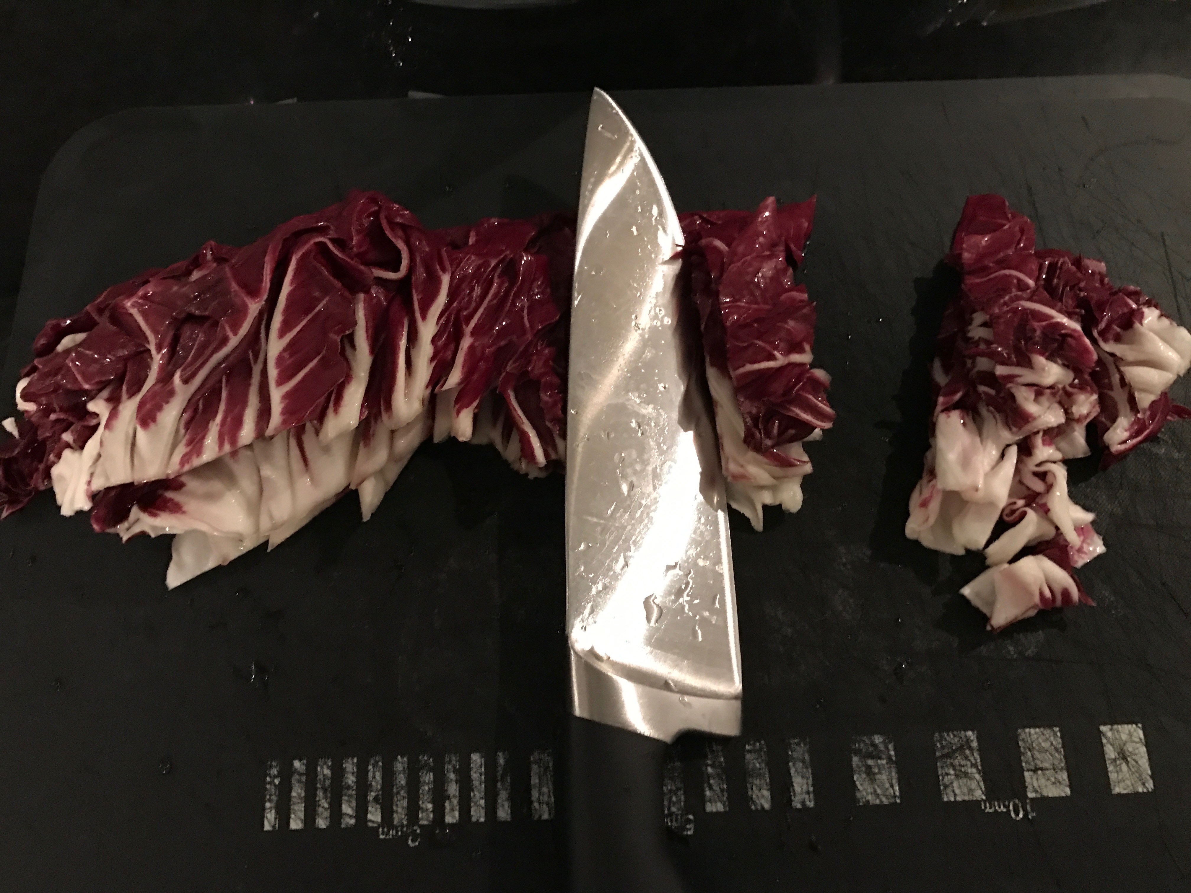 Lavare il radicchio, foglia per foglia ed eliminare la parte bianca più dura.