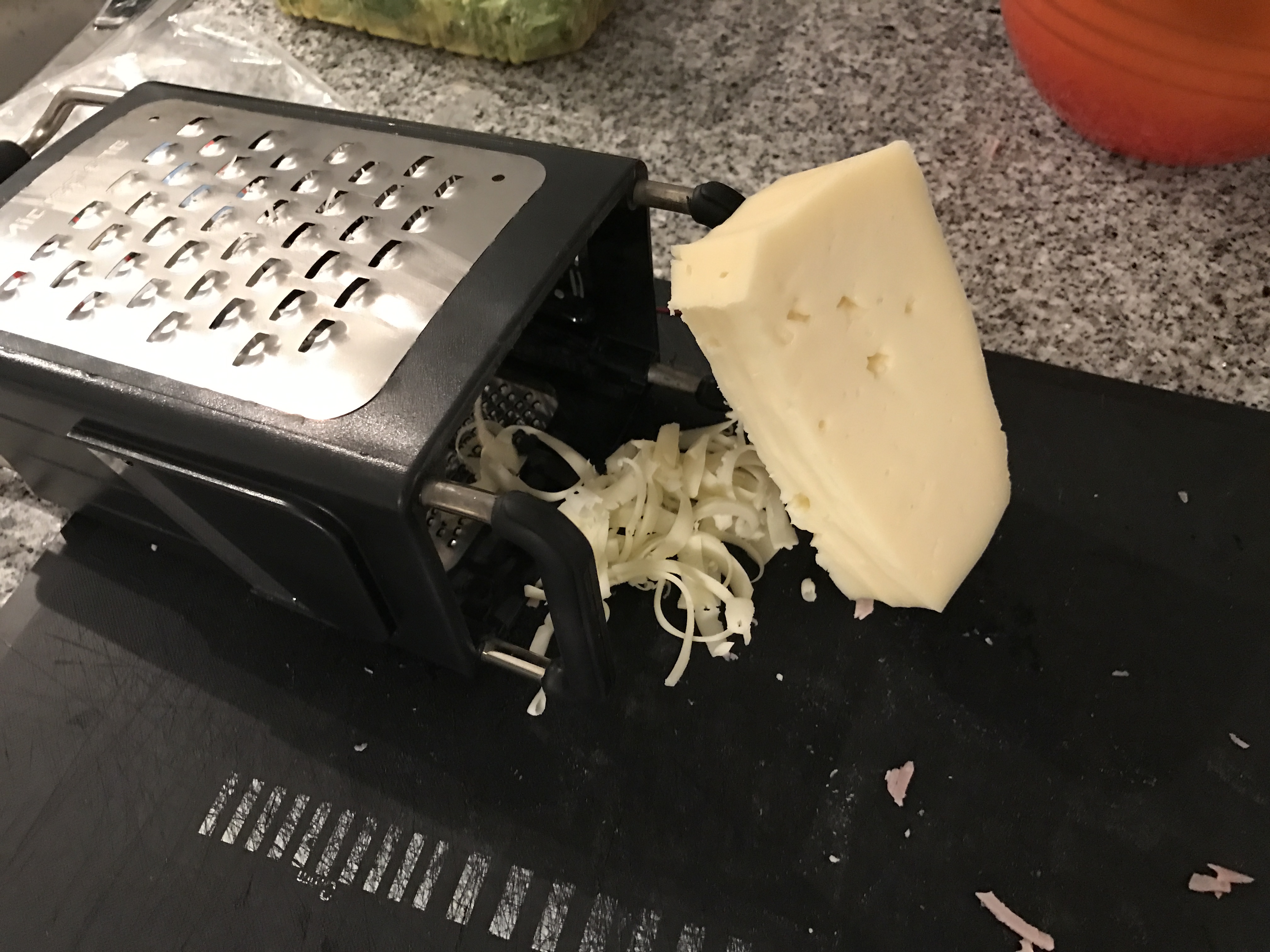 Riducete a listelle pure l’asiago aiutandovi con una grattugia.