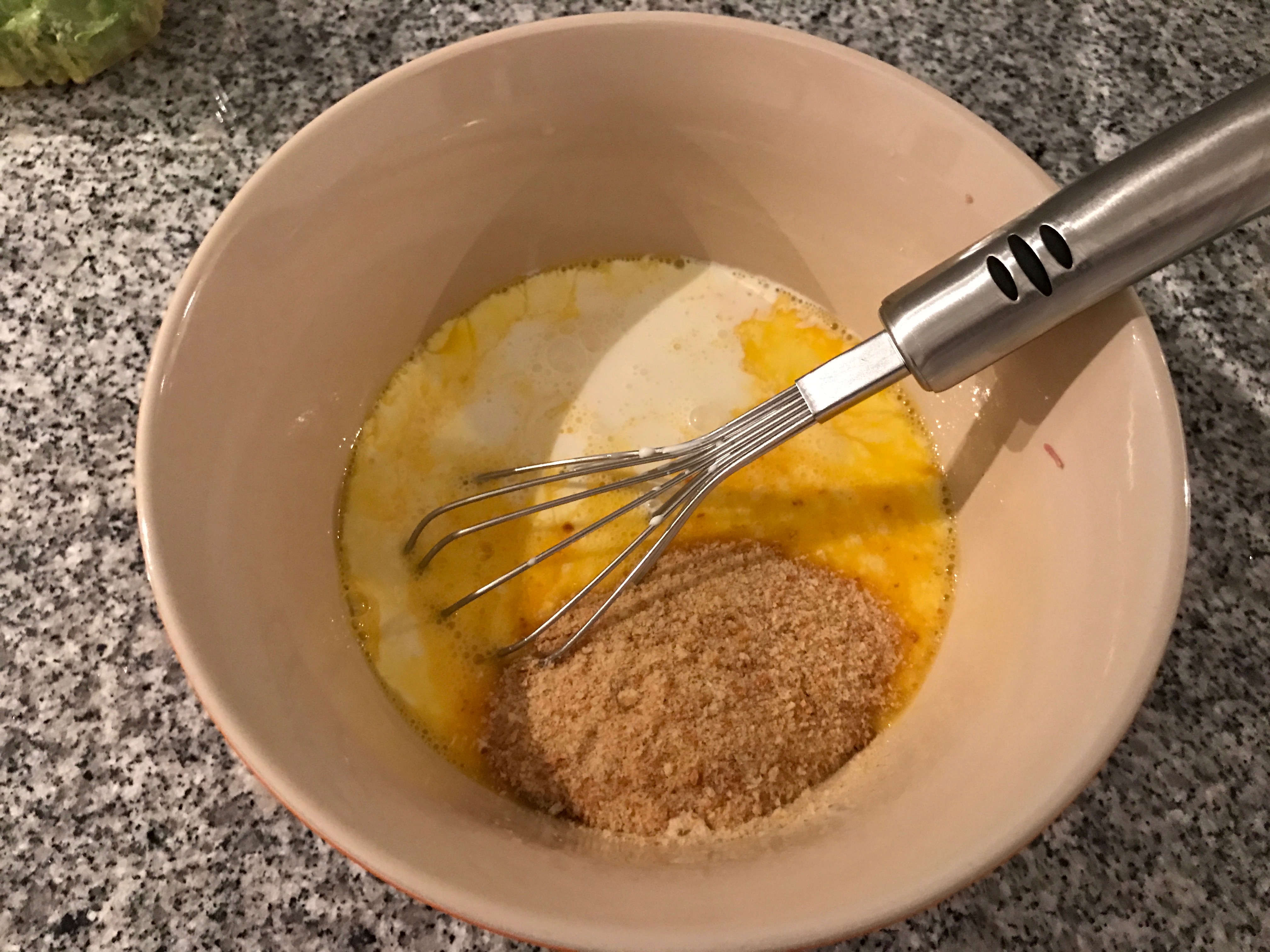Sbattere le uova, quindi aggiungervi la panna, sale, pepe e il pangrattato.